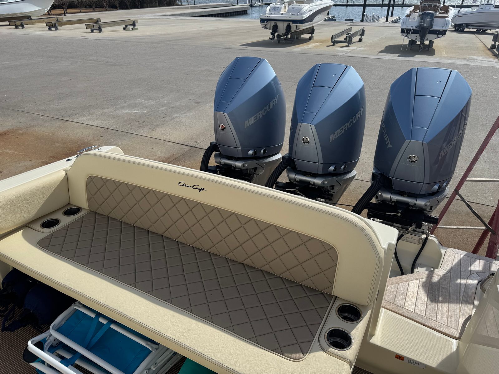 Power and precision define the performance of the Chris-Craft Catalina 34. Equipped with three high-performance engines delivering a combined 900 horsepower, this center console boat is engineered for exhilarating speed, smooth handling, and reliable offshore capability. The triple-engine setup ensures rapid acceleration, impressive top-end speed, and the confidence to tackle a variety of water conditions. With only 62 engine hours, these engines are barely broken in, promising many seasons of reliable enjoyment ahead. Whether you are cruising along the coastline, heading out for a day of fishing, or making a quick run to your favorite waterfront destination, the Catalina 34 delivers a responsive and thrilling ride every time.