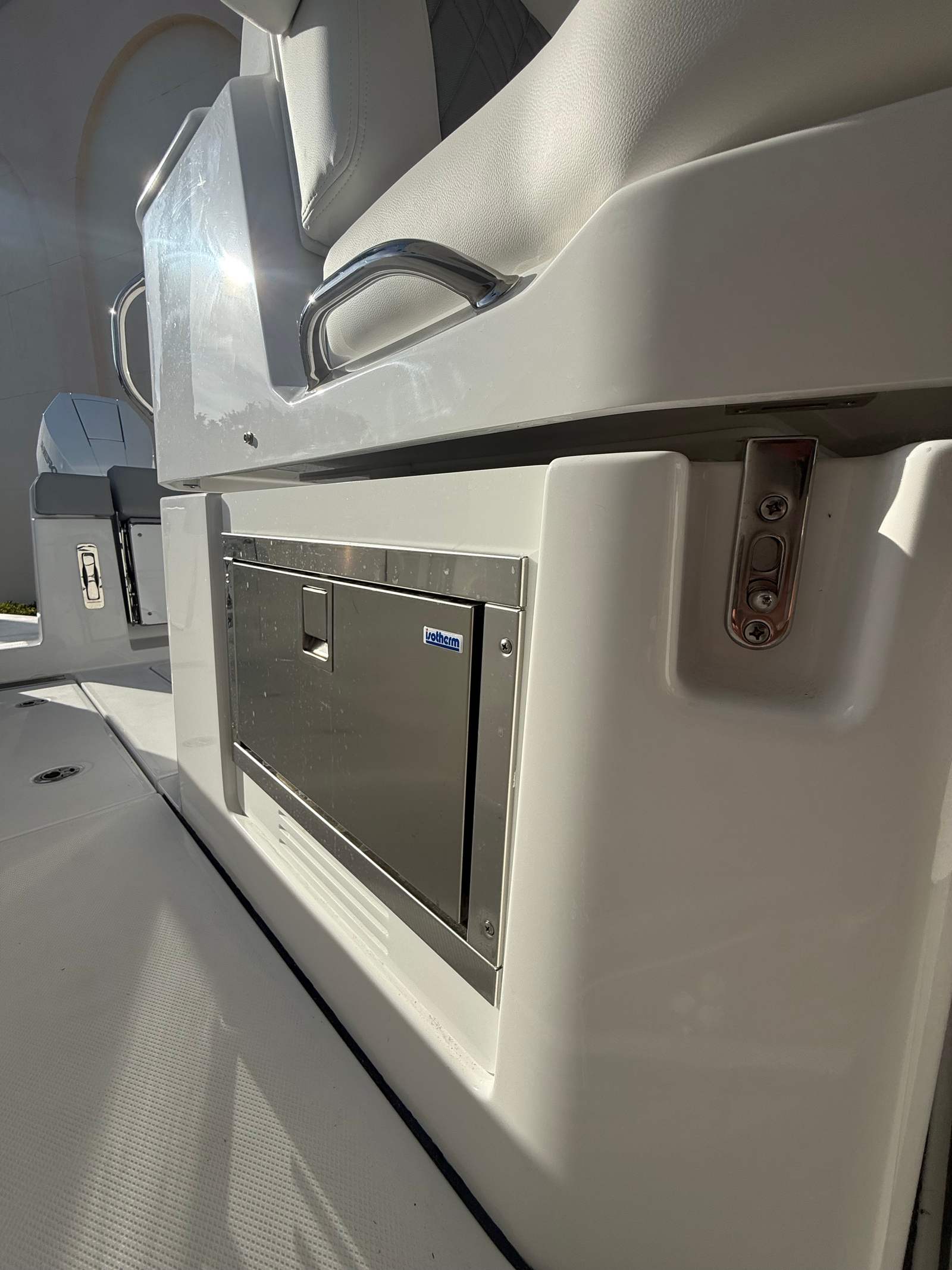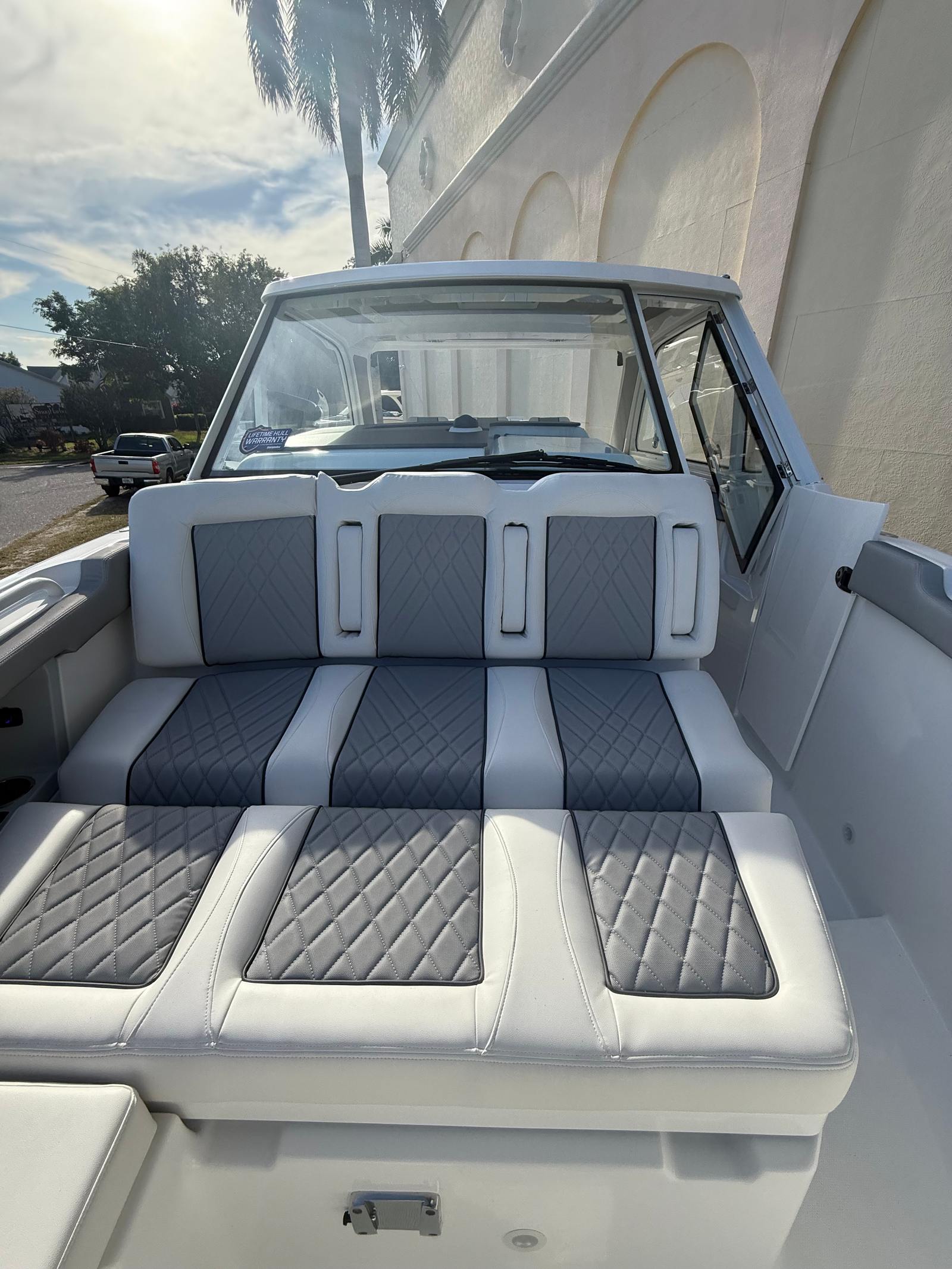 This Everglades boat for sale is packed with premium features designed to enhance your time on board. The hull’s white gel finish not only looks stunning but also offers durability and easy maintenance. The Electrical Convenience Package ensures that all your electronic needs are met, providing reliable power for your adventures. The Sanibel upholstery material package adds a touch of elegance and comfort to the seating areas, creating a welcoming environment for you and your guests.For those who value privacy and protection from the elements, the canvas windshield privacy cover and comprehensive canvas package in a sleek silver color offer both style and functionality. The fishing package makes this cruiser ideal for anglers, providing the tools and features needed for a successful day on the water. An electrically actuated anchor light adds a modern touch, making anchoring at dusk or dawn both safe and convenient.