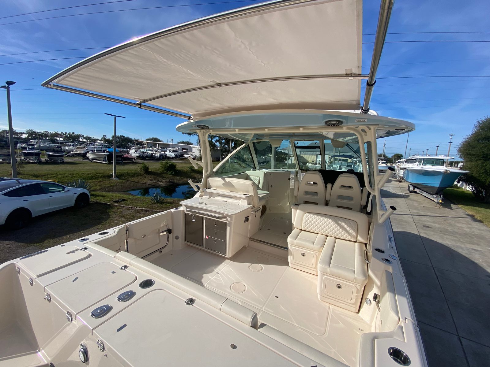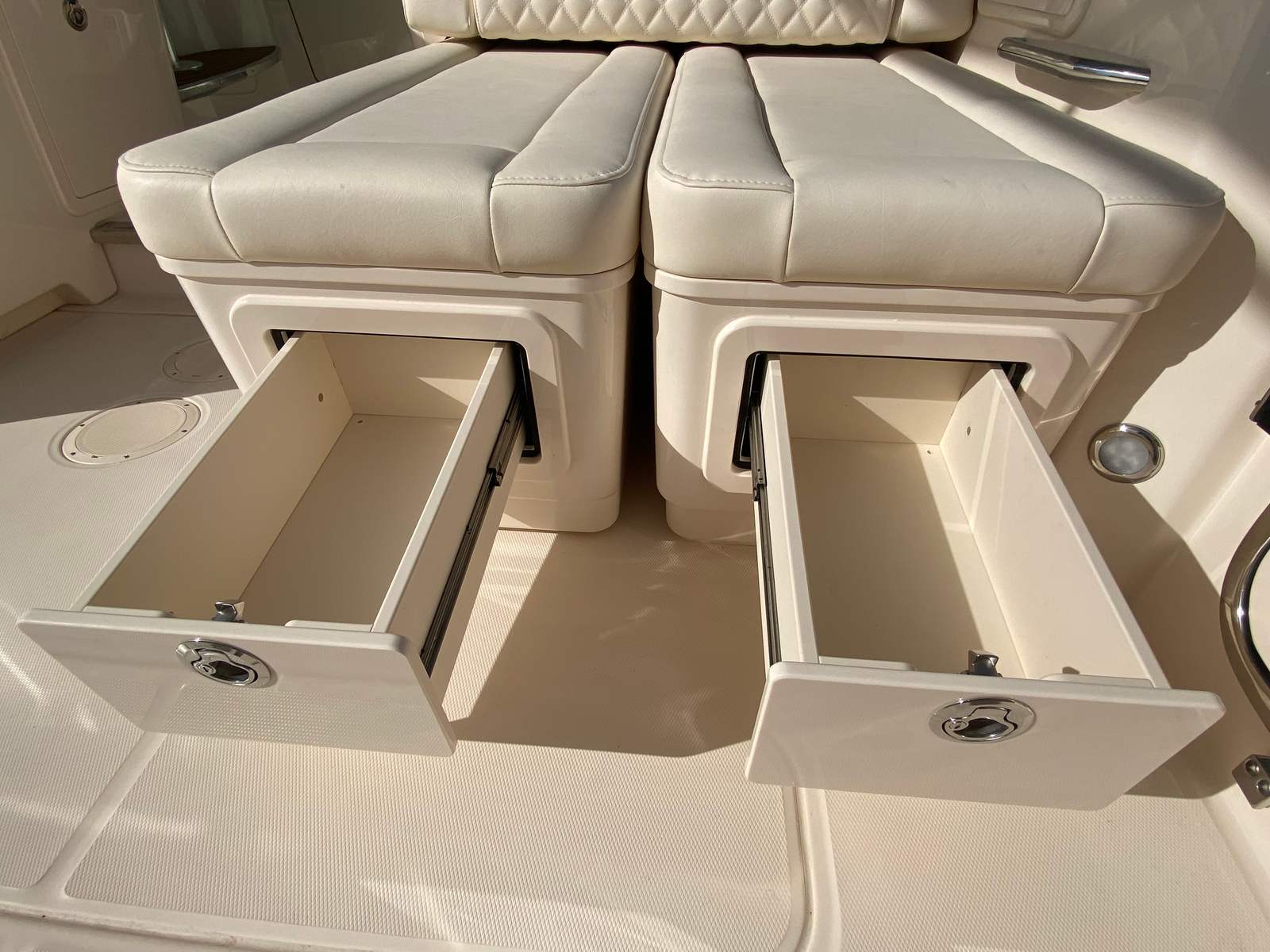 The Freedom 345 shines in a variety of scenarios, making it the ultimate Dual Console boat for sale for families, anglers, and boating enthusiasts alike. Imagine setting out for a day of fishing with friends, utilizing the refrigerated aft fish box to keep your catch fresh and the Seakeeper 3 HD stabilizer to ensure a comfortable ride. Or picture a leisurely cruise with loved ones, relaxing under the Ivory Bow Shade and enjoying the gentle glow of underwater lights as the sun sets.This Grady-White boat for sale is equally suited for luxury getaways, offering the space and amenities needed for extended trips along the coast or to your favorite island destination. The versatile layout accommodates both intimate gatherings and larger groups, making it easy to tailor each outing to your unique preferences. Whether you’re seeking adventure, relaxation, or a bit of both, the Freedom 345 delivers in every way.