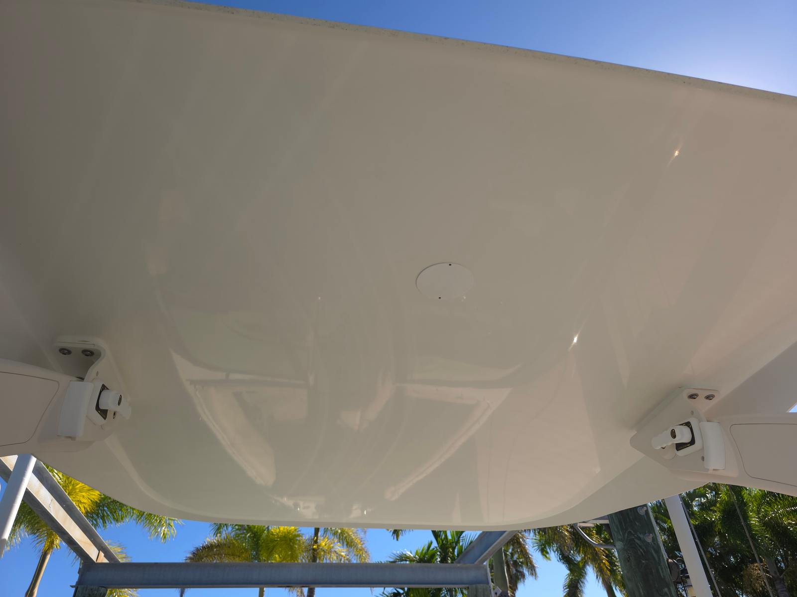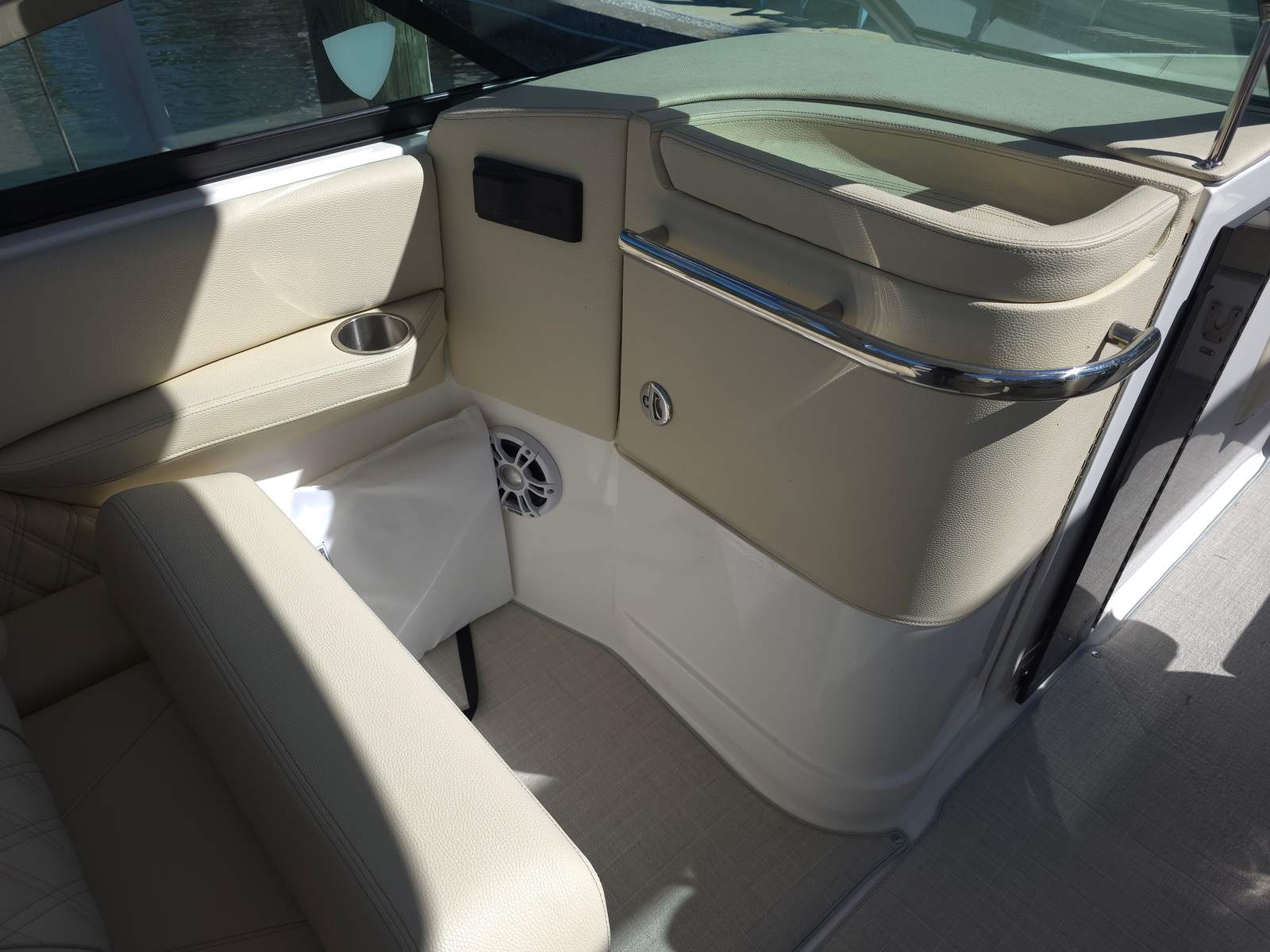 Dual Garmin 12" Displays, Aftermarket Anchor windlass, Bow walkthrough doors, Cockpit table, Cockpit and bow cover, Bow shade, Bow thruster, Trim tabs, Fusion stereo system, Full head porcelain, Stainless sink, Retractable aft seat, Power Hard Top retractable.