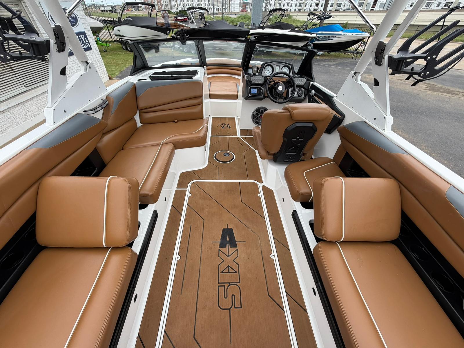 Now available at our Used Boat Super Center in Lewisville, this 2020 Axis A24 is a large, surf-focused wake boat known for producing massive waves and offering incredible value. Finished in a clean all-white gelcoat with a brown interior, this A24 is powered by the Monsoon M5 direct-injected V8 producing 350 horsepower with only 126 hours.