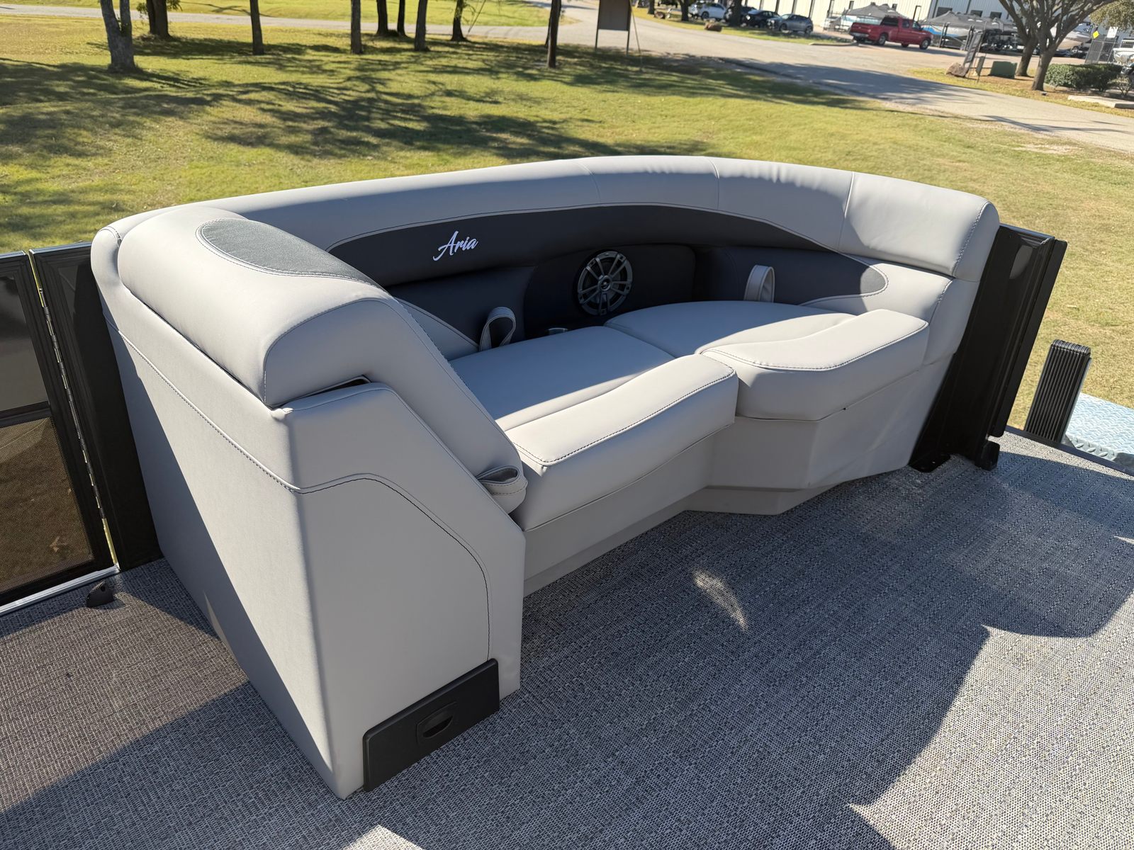 The Barletta Aria A20UC is designed to impress from every angle. Its exterior features the striking Railskin Color Aria in Black Diamond, complemented by the Railskin Accent Aria in Gray Moonstone. The Blackout Package Aria adds a touch of sophistication, giving the boat a bold and modern appearance that is sure to turn heads at the marina. Step aboard and you are greeted by Tempest Gray furniture, offering plush seating and a refined atmosphere for you and your guests. The Amore Gray flooring not only enhances the visual appeal but also provides a comfortable and slip-resistant surface underfoot.Adding to its unique charm, the Aria A20UC comes equipped with a stainless steel flag pole and an American flag, proudly displaying your love for the water and country. Every detail, from the railskin packages to the premium rigging, is crafted to ensure a seamless and enjoyable boating experience.