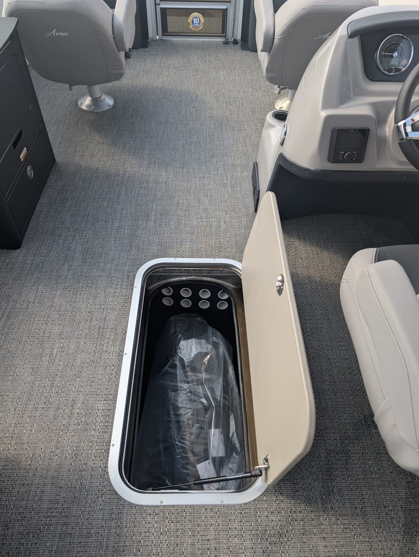 The Barletta Aria A22F is packed with premium features that set it apart in the world of pontoon boats. The Railskin Color Aria in White Opal gives the exterior a crisp, clean look, while the Tempest Gray furniture offers both comfort and visual appeal. The Amore Gray flooring is not only stylish but also practical, providing a durable and easy-to-clean surface for all your on-board activities.One of the standout features is the in-floor midship storage, which is made possible by the Triple Toon configuration. This spacious storage compartment is perfect for stowing away water toys, life jackets, and other essentials, keeping the deck clutter-free and organized. At the helm, you’ll find the advanced Simrad 7 G07 XSE, a state-of-the-art navigation and fish-finding system that enhances your boating experience with intuitive controls and clear displays.The exterior is further enhanced by a stainless steel flag pole adorned with an American flag, adding a patriotic touch to your adventures. The rigging includes a stainless steel prop, ensuring optimal performance and longevity. Every detail of the Aria A22F is thoughtfully designed to maximize your enjoyment and convenience on the water.