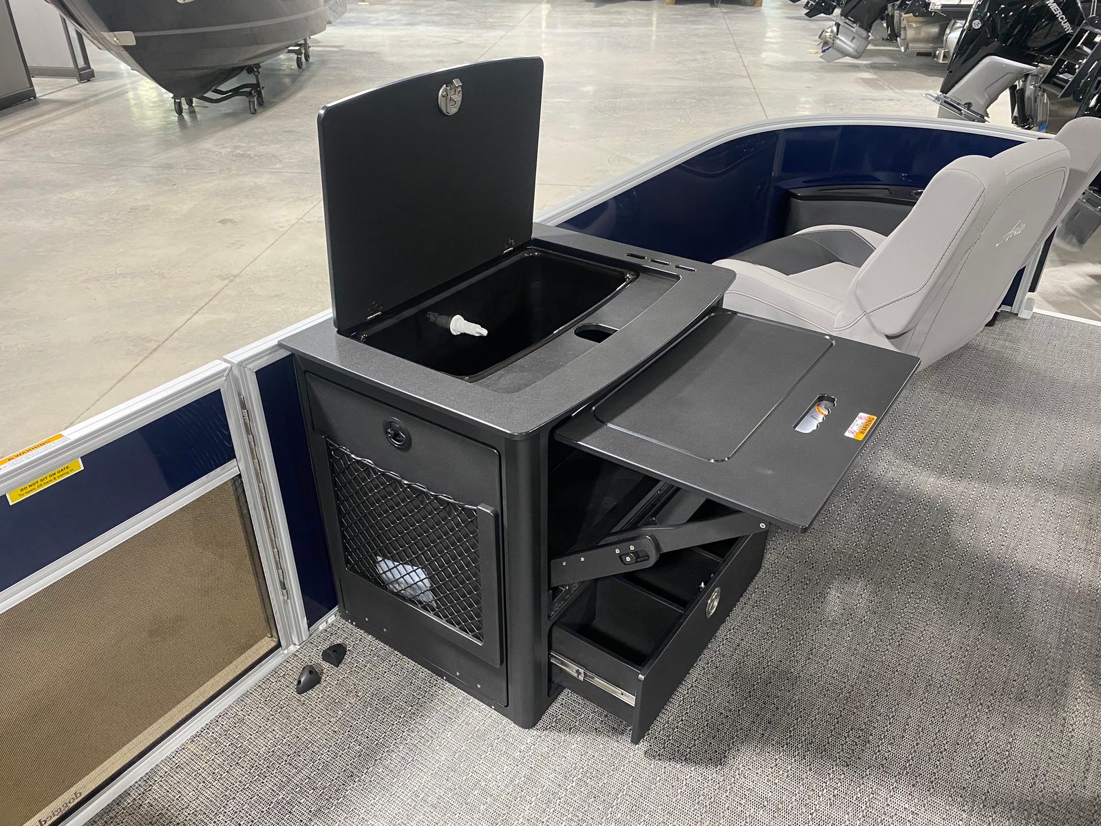 The 2025 Barletta Aria A22F is packed with features that enhance both functionality and comfort. The striking Railskin Color Aria in Blue Sapphire gives this pontoon a bold and sophisticated appearance, ensuring you stand out wherever you go. Inside, the Furniture Color in Tempest Gray creates a modern and inviting atmosphere, complemented by the Amore Gray flooring that is both stylish and easy to maintain.One of the standout features of this model is the Triple Toon Package Aria, which provides enhanced stability, buoyancy, and performance. This package is ideal for those who want a smooth ride and the ability to handle a variety of water conditions with ease. The in-floor midship storage, available thanks to the Triple Toon configuration, offers convenient space for storing gear, water toys, or personal items, keeping the deck clutter-free and organized.At the helm, the Hook 5 GPS system provides advanced navigation and fish-finding capabilities, making it easier than ever to explore new waters or locate the perfect fishing spot. Every detail of the Aria A22F is designed with the user in mind, ensuring a seamless and enjoyable boating experience from bow to stern.