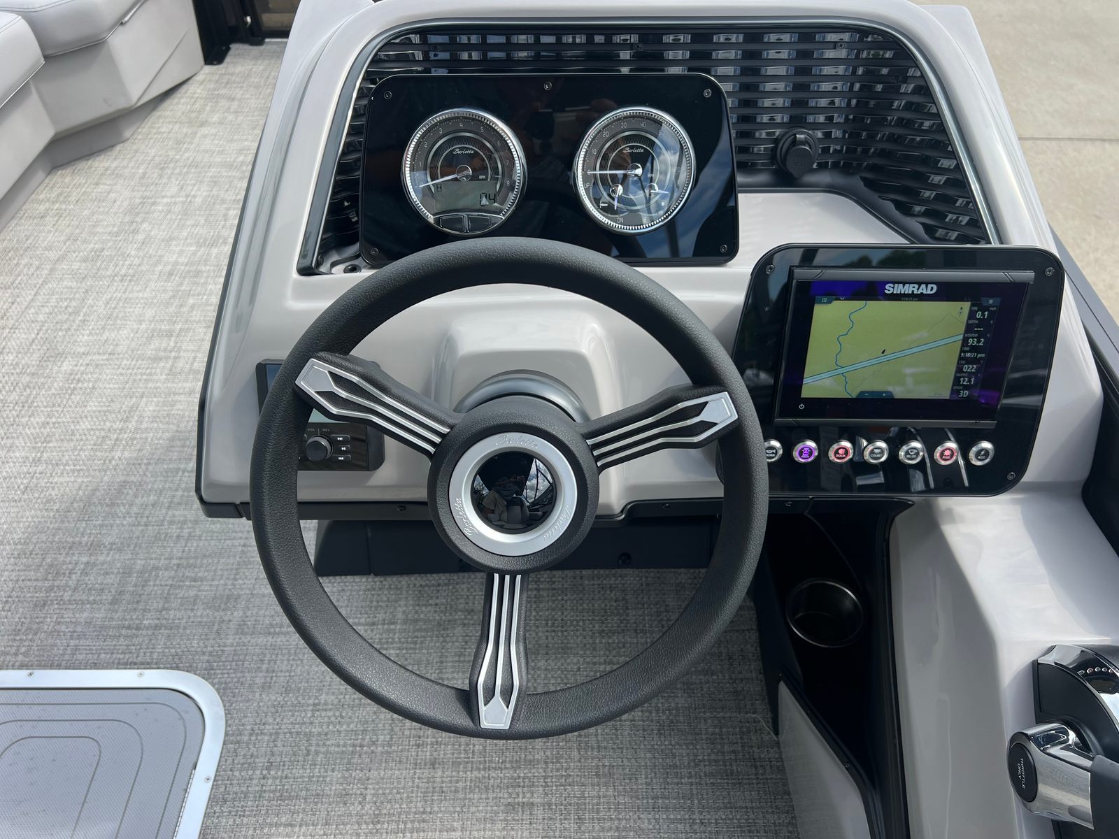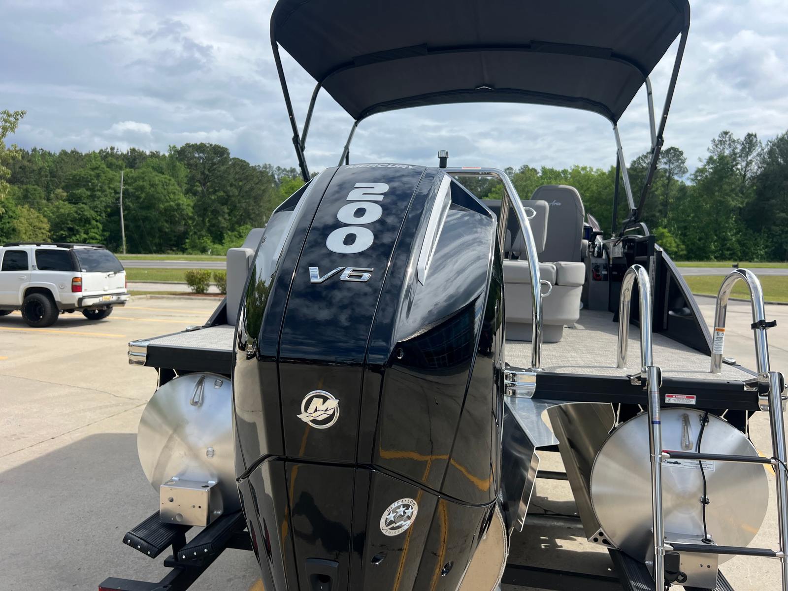 The 2026 Barletta Aria A22UC-Platinum is loaded with features designed to elevate your time on the water. The Aria Blackout Package adds a touch of elegance and exclusivity, while the Black Diamond Railskin color provides a bold, contemporary aesthetic. Inside, the Tempest Gray furniture offers plush seating for you and your guests, complemented by Alpine Gray flooring that is both stylish and easy to maintain. The in-floor midship storage compartment provides a convenient place to stow gear, water toys, or picnic supplies, keeping the deck clutter-free and organized. The clipped playpen cover with poles offers protection from the elements, ensuring your pontoon stays in pristine condition when not in use. Every detail, from the rigged engine with stainless steel prop to the Mercury mechanical pre-rig with power assist, is designed to enhance your boating experience.