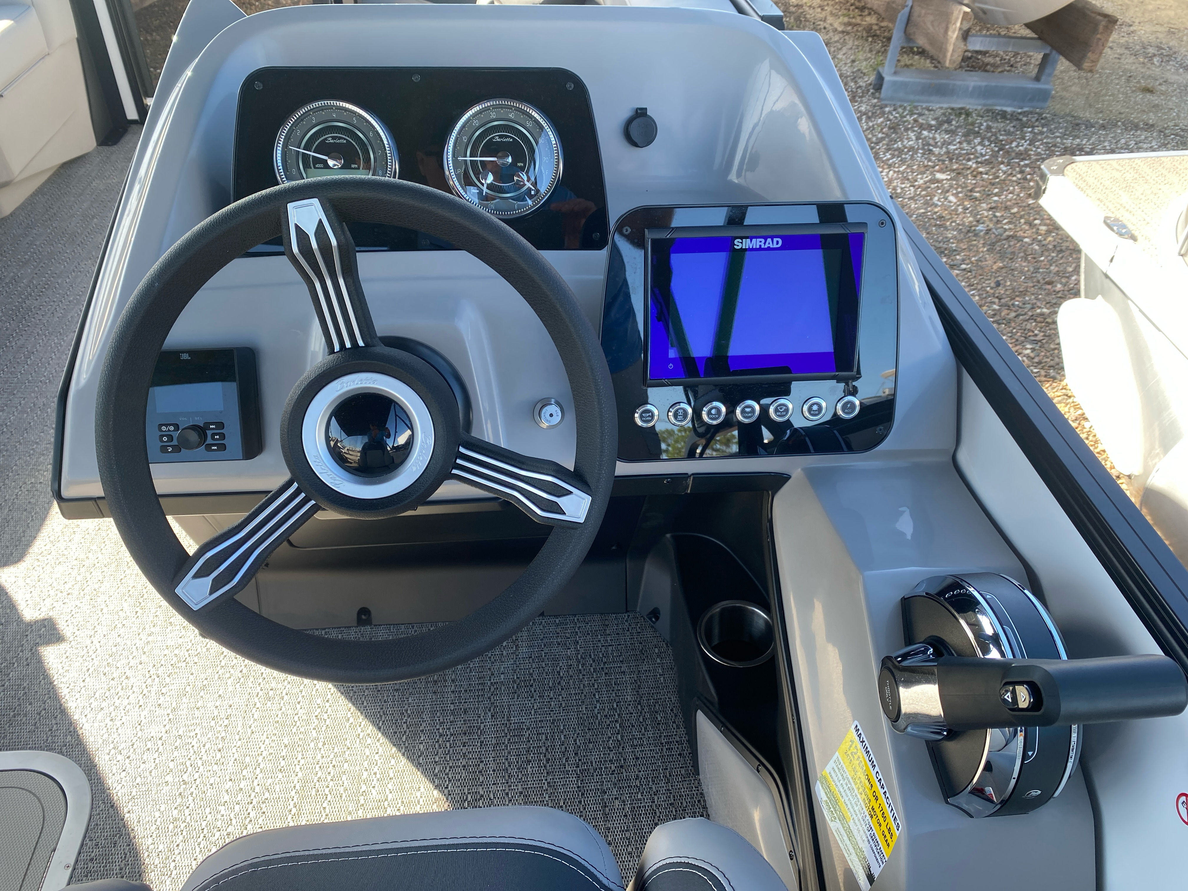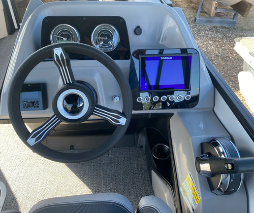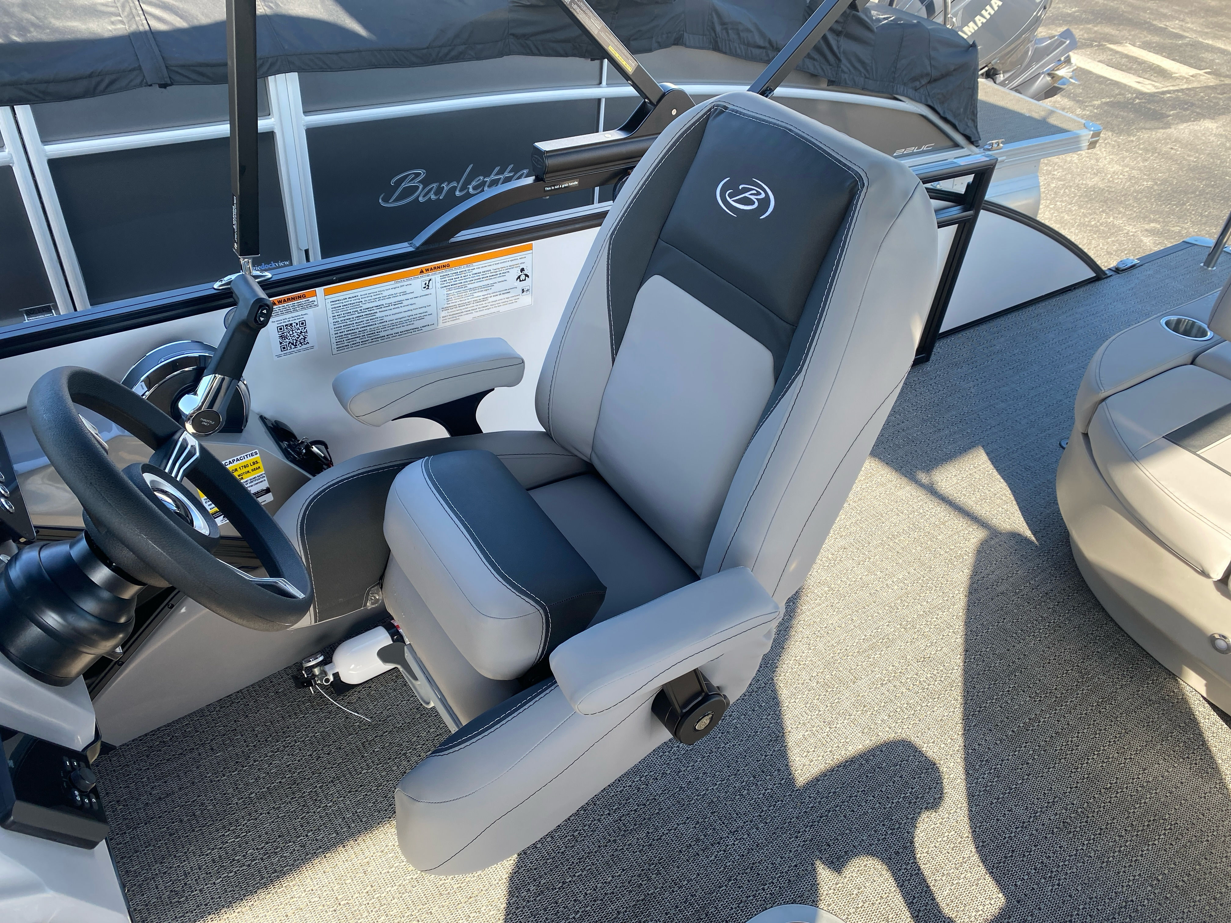 The Barletta Aria A22UC-Platinum is packed with special features that set it apart from other pontoon boats for sale. The Amore Gray flooring adds a touch of elegance and durability, creating a welcoming atmosphere for guests. The Canvas Double Bimini, including an additional Power Bimini, provides versatile shade options, allowing you to enjoy sunny days or seek shelter from unexpected weather. The exterior is enhanced by a Stainless Steel Flag Pole with an American Flag, showcasing your patriotic spirit as you cruise.Inside, the Tempest Gray furniture offers plush seating and modern aesthetics, while the Blackout Package Aria railskin delivers a sleek, contemporary look. The In Floor Midship Storage (available with the Triple Toon configuration) provides convenient space for stowing gear, water toys, and personal items, keeping the deck clutter-free. The Coastal Edition Aria ensures this pontoon is ready for a variety of environments, from freshwater lakes to saltwater bays. The On Board Charger Aria adds practicality for longer outings, and the Interior RGB Lighting Package Aria creates a customizable ambiance for evening gatherings and celebrations.