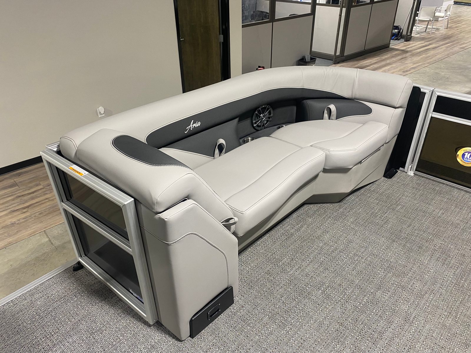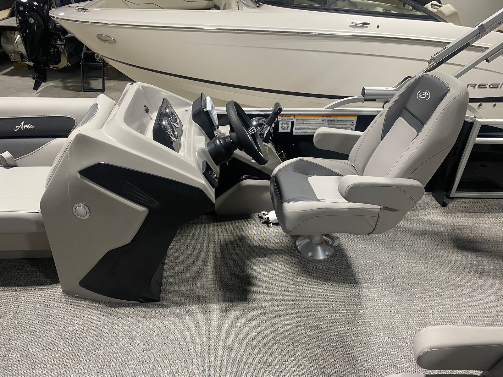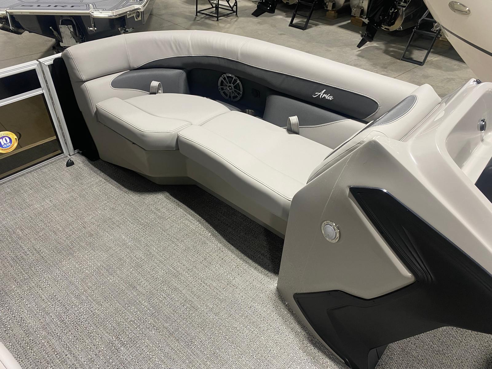 The Barletta Aria A22UC is a 2026 model pontoon boat that measures just over 21 feet in length, offering ample space for socializing, lounging, and enjoying the open water. Its contemporary aesthetic is highlighted by the Railskin Color Aria in Black Diamond, giving the boat a sophisticated and modern look that is sure to turn heads at any marina or lake. The Tempest Gray furniture and Amore Gray flooring create a harmonious and inviting atmosphere, making every outing a pleasure. As a new pontoon boat for sale, this vessel promises pristine condition and the latest advancements in pontoon design.