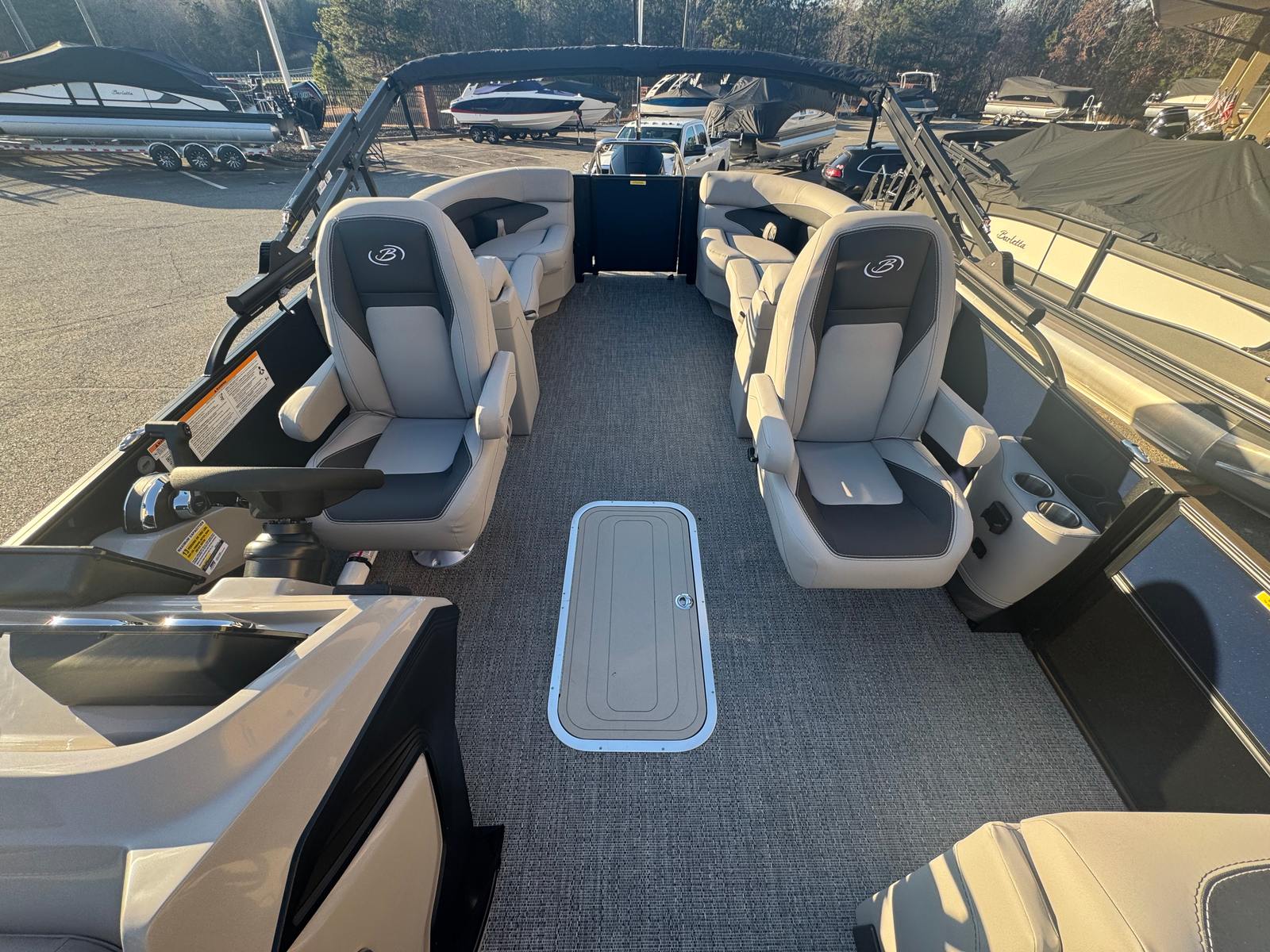 The 2026 Barletta Aria A24QC is a brand-new pontoon boat that measures just over 23 feet in length, making it the perfect size for both intimate family outings and lively gatherings with friends. With its sleek Blue Sapphire Railskin color and the striking Blackout Package Aria, this pontoon makes a bold statement wherever it goes. The contemporary Tempest Gray furniture and Amore Gray flooring create a sophisticated and inviting atmosphere, ensuring every moment on board is spent in comfort and style. As a new model, this Barletta boat for sale is ready to deliver years of reliable performance and enjoyment.