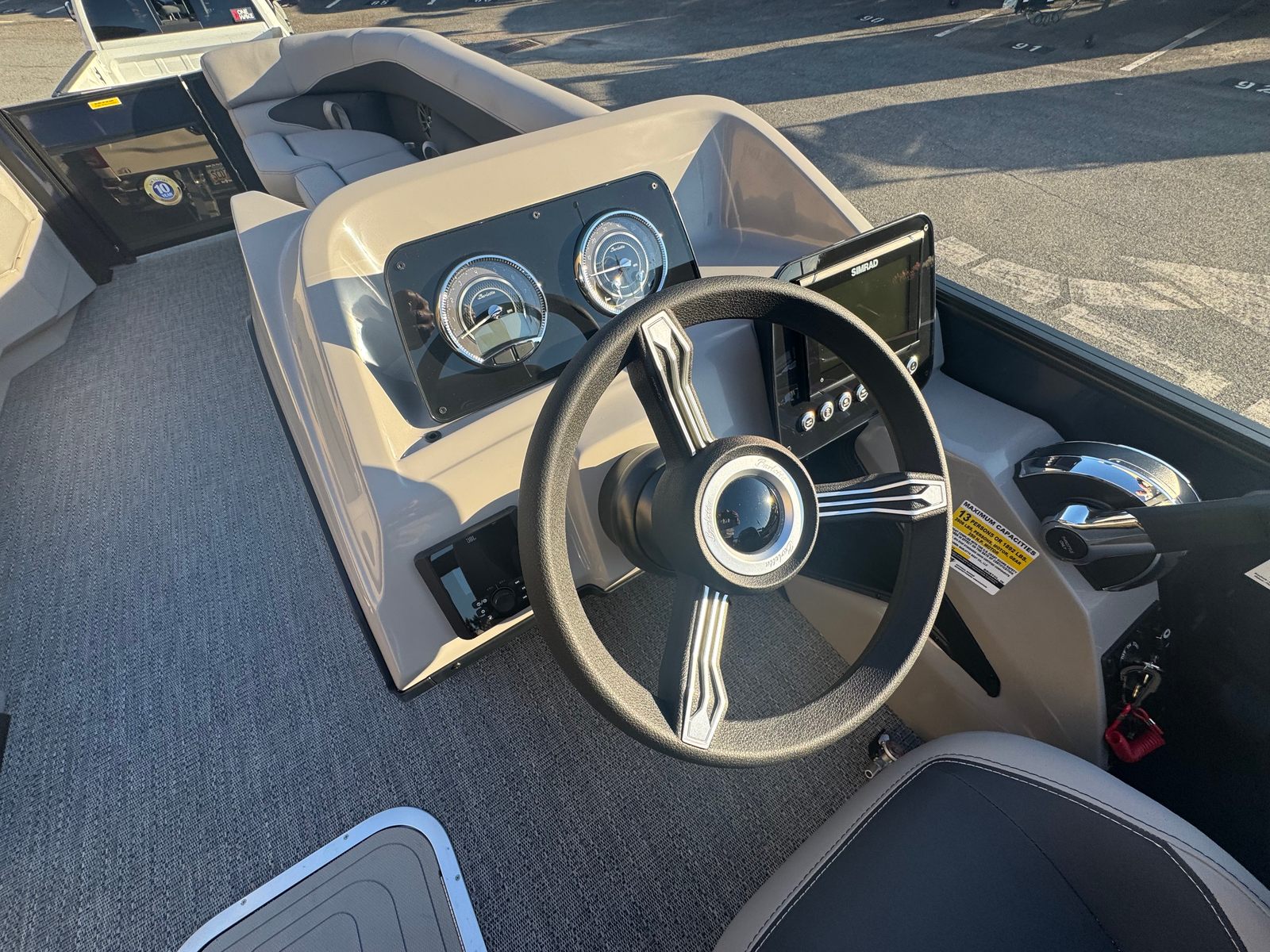 The Barletta Aria A24QC is packed with premium features that elevate your boating experience. The Blue Sapphire Railskin color and Blackout Package Aria give the exterior a modern, high-end look, while the Tempest Gray furniture offers plush, supportive seating for all your guests. The Amore Gray flooring is both stylish and practical, providing a comfortable, slip-resistant surface that is easy to maintain. The onboard battery charger ensures your single battery stays powered up and ready for every adventure. A stainless steel flag pole with an American flag adds a patriotic touch, making this pontoon boat a true standout on the water.