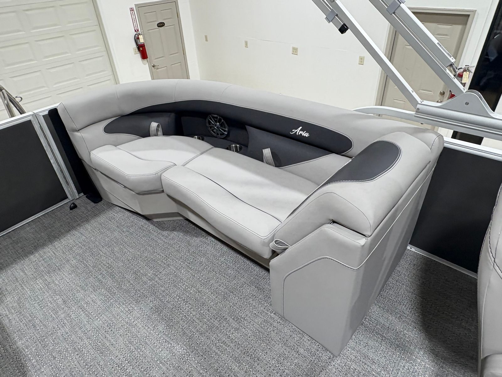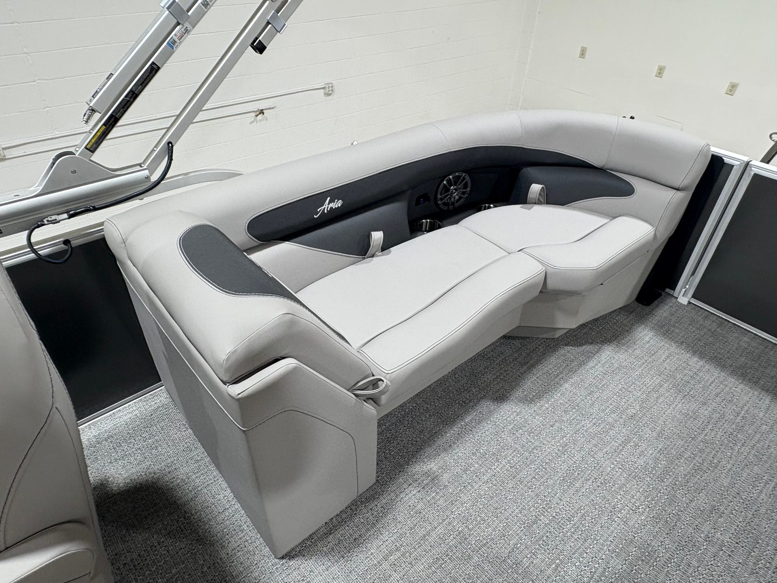 The Barletta Aria A24QC is loaded with features that enhance both functionality and enjoyment. The Triple Toon Package Aria provides superior stability and buoyancy, allowing for a smoother ride even in choppier conditions. The interior RGB lighting package creates a vibrant, customizable atmosphere for evening cruises or celebrations on the water. The in-floor midship storage, available thanks to the Triple Toon configuration, offers convenient space for stowing gear, water toys, or picnic essentials, keeping the deck clutter-free and organized.Aesthetically, the Aria A24QC shines with its Gray Moonstone Railskin and Tempest Gray furniture, complemented by Amore Gray flooring for a cohesive, modern look. The stainless steel flag pole with an American flag adds a touch of patriotic flair, making this pontoon a standout at any marina or dock. Every detail is thoughtfully designed to maximize comfort, style, and usability.