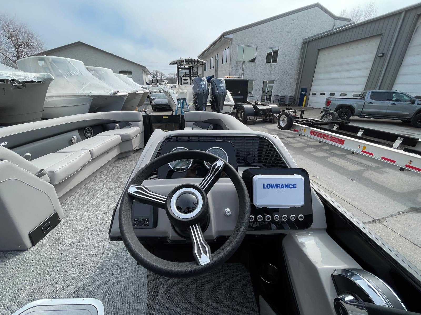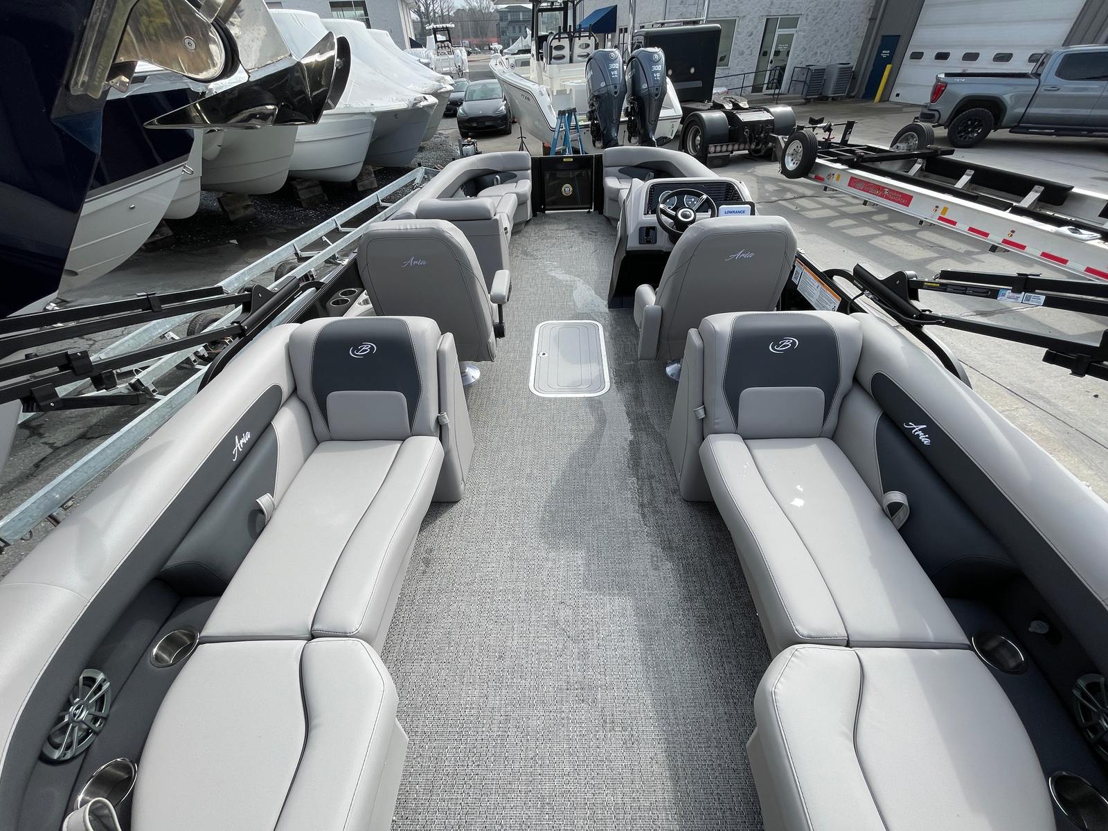 The Barletta Aria A24QC is packed with special features that set it apart from other pontoon boats for sale. The Railskin Color Aria in Black Diamond, complemented by the Blackout Package Aria, gives this pontoon a sophisticated and striking appearance. The Tempest Gray furniture provides plush seating and a modern look, while the Amore Gray flooring adds a touch of elegance and durability underfoot. The Coastal Edition Aria enhances the boat’s versatility, making it suitable for a variety of environments and activities.One of the standout features is the Triple Toon Package Aria, which offers enhanced stability, buoyancy, and performance. This package ensures a smooth and comfortable ride, even when the water gets choppy. The canvas seat covers with standard playpen protection help keep your seating area clean and protected, adding to the longevity and appeal of the boat.