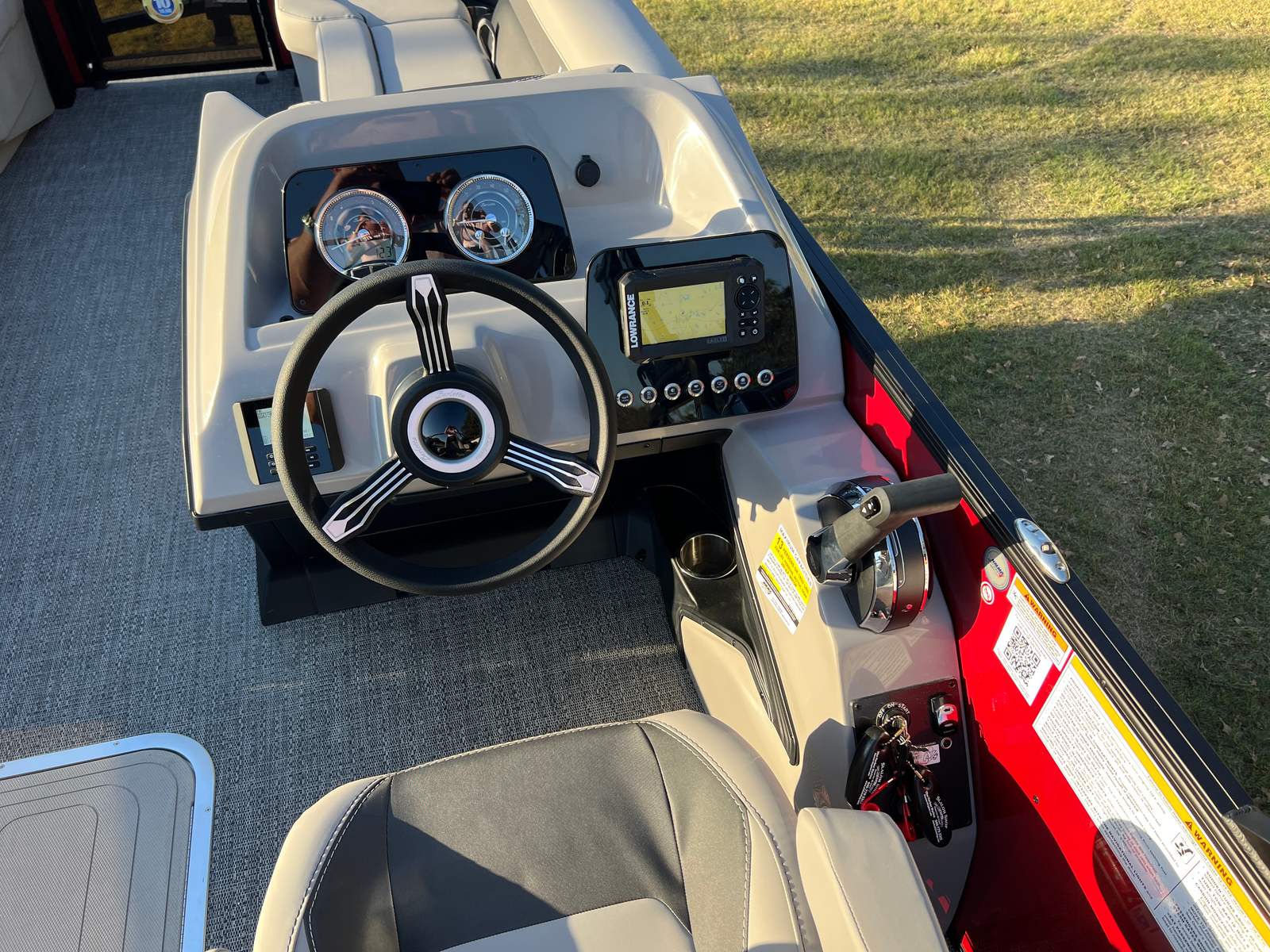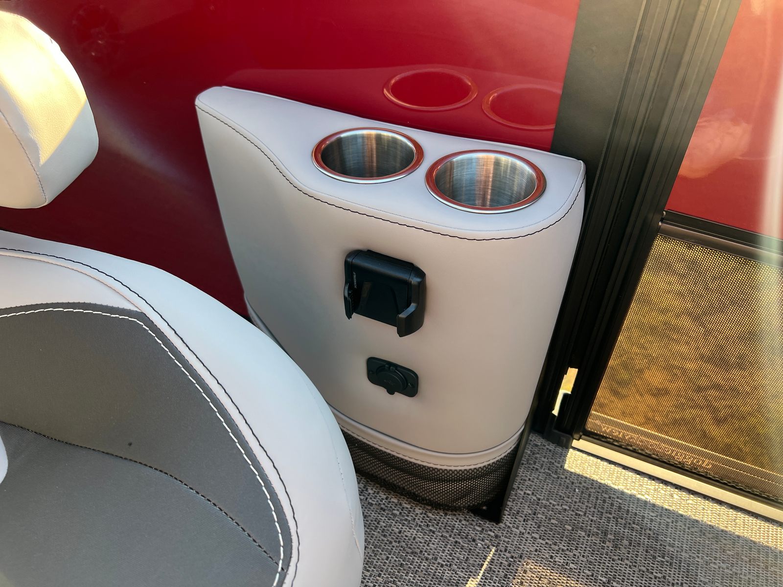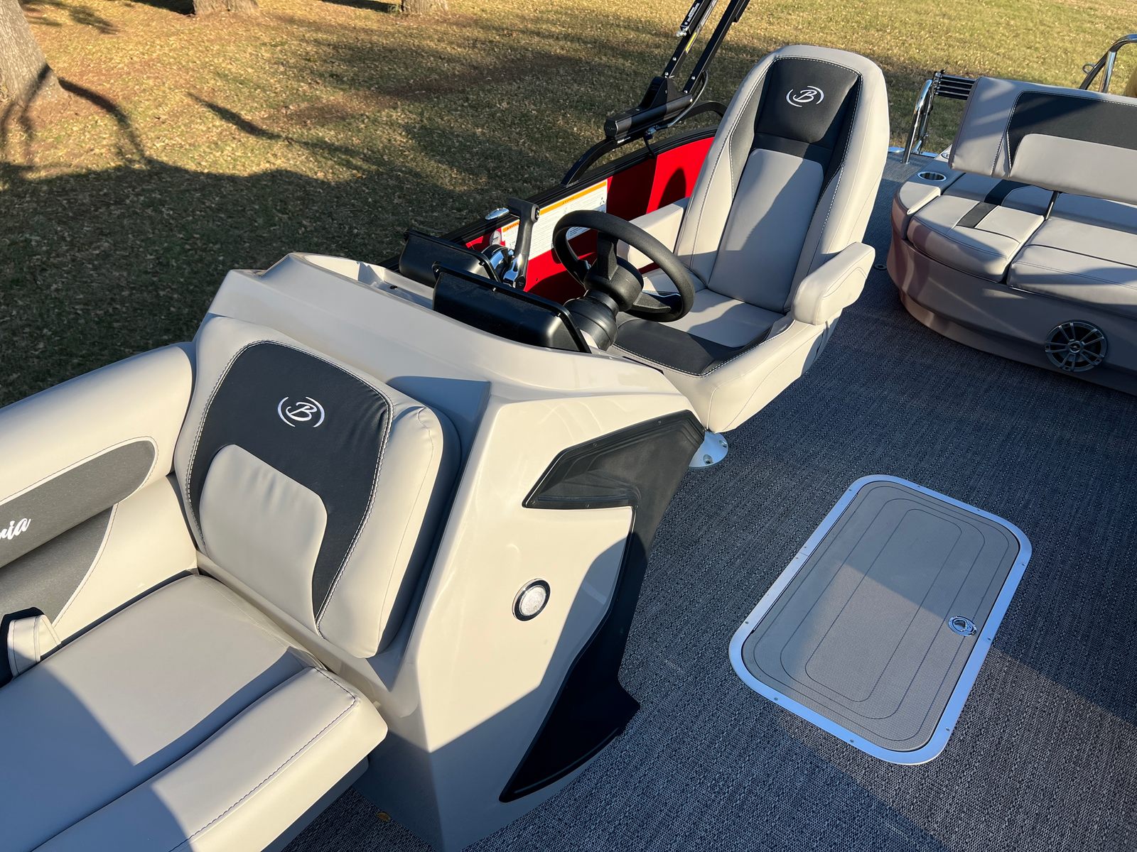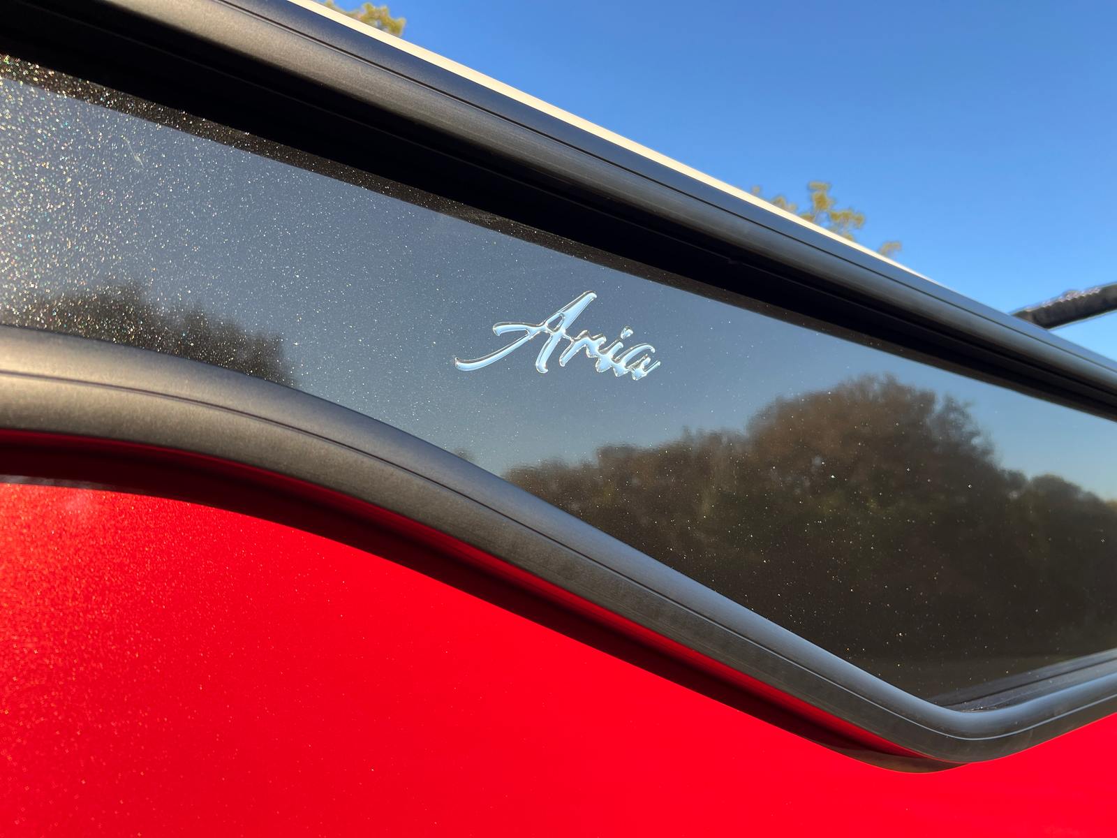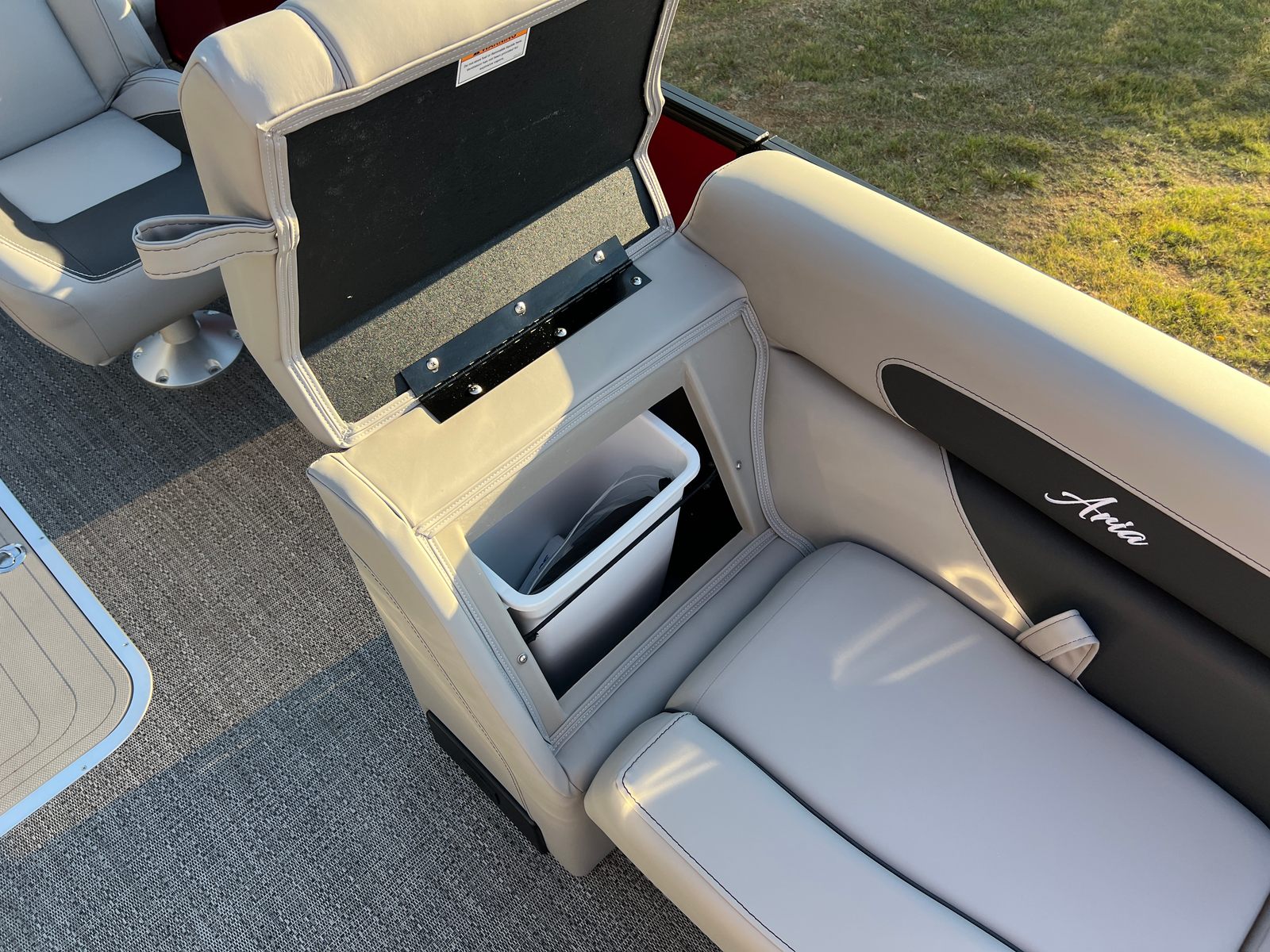 Step aboard the Aria A24UC and discover a world of premium features designed for comfort and convenience. The Tempest Gray furniture offers plush seating and a modern aesthetic, while the Amore Gray flooring provides a stylish and durable foundation for all your on-board activities. The in-floor midship storage is perfect for stowing away gear, water toys, or picnic essentials, keeping the deck clutter-free and organized. The stainless steel flag pole with an American flag adds a patriotic touch, making this pontoon boat a standout wherever you go.The Railskin Color Aria in Red Garnet, paired with the Black Diamond accent and Blackout Package Aria, creates a bold and sophisticated look that is sure to impress. Every detail, from the premium upholstery to the thoughtful storage solutions, is designed to enhance your boating experience and provide lasting value.