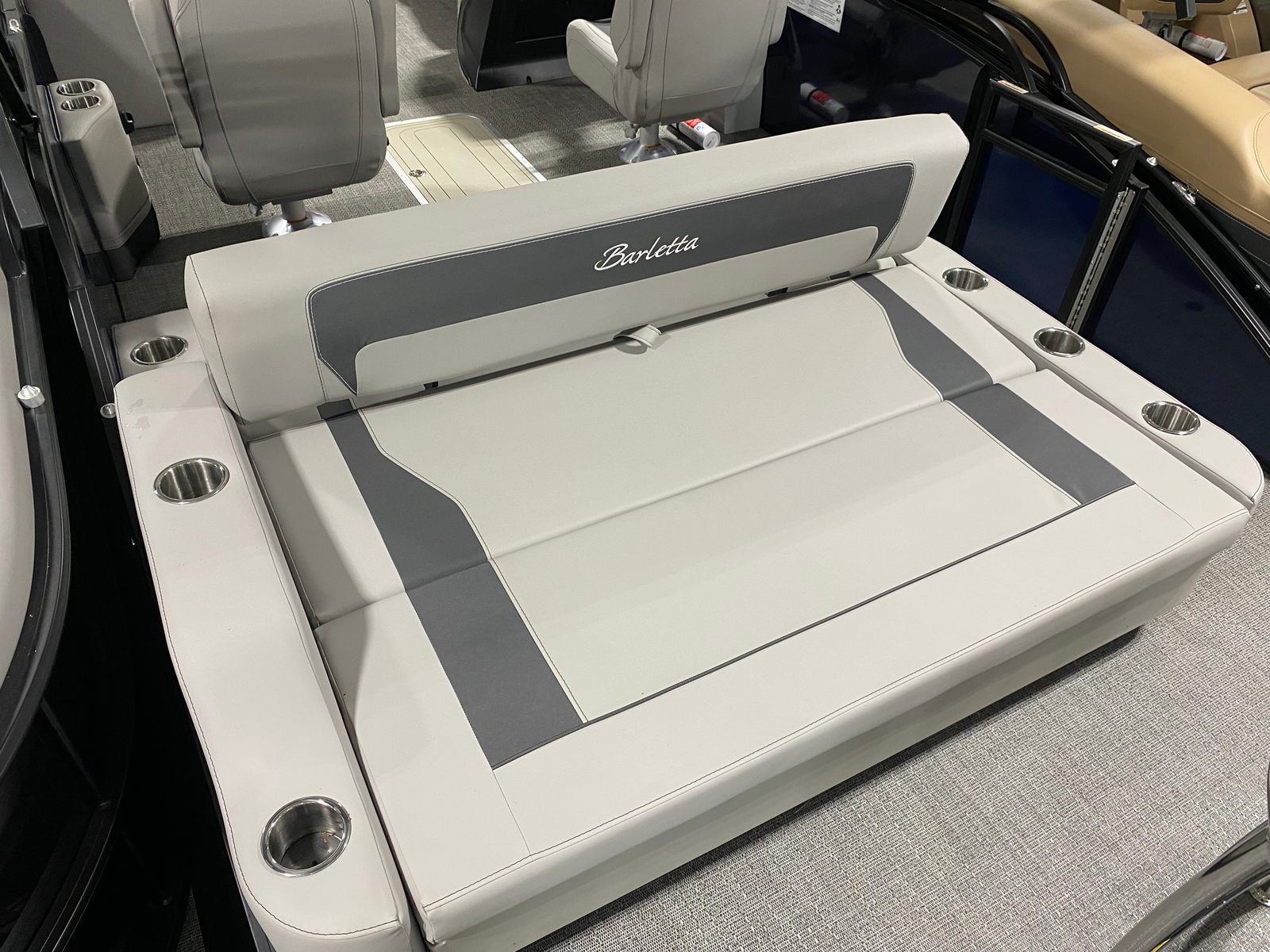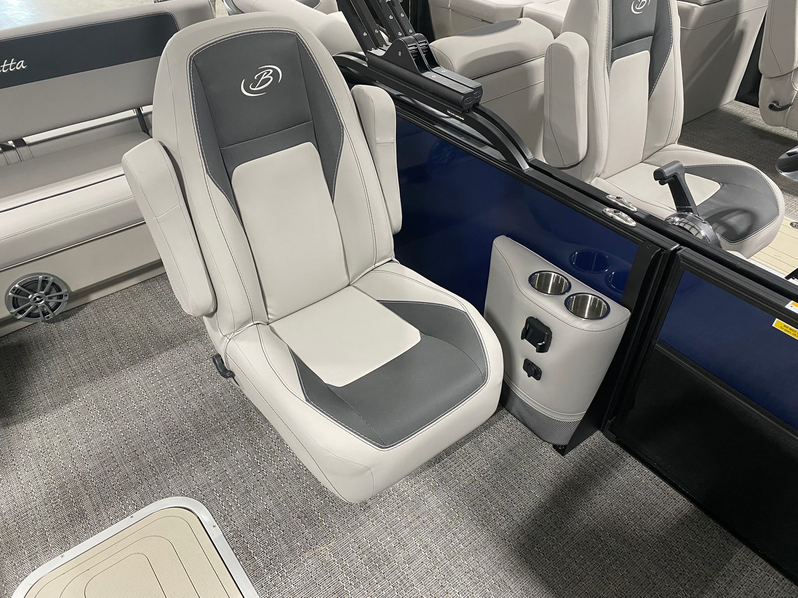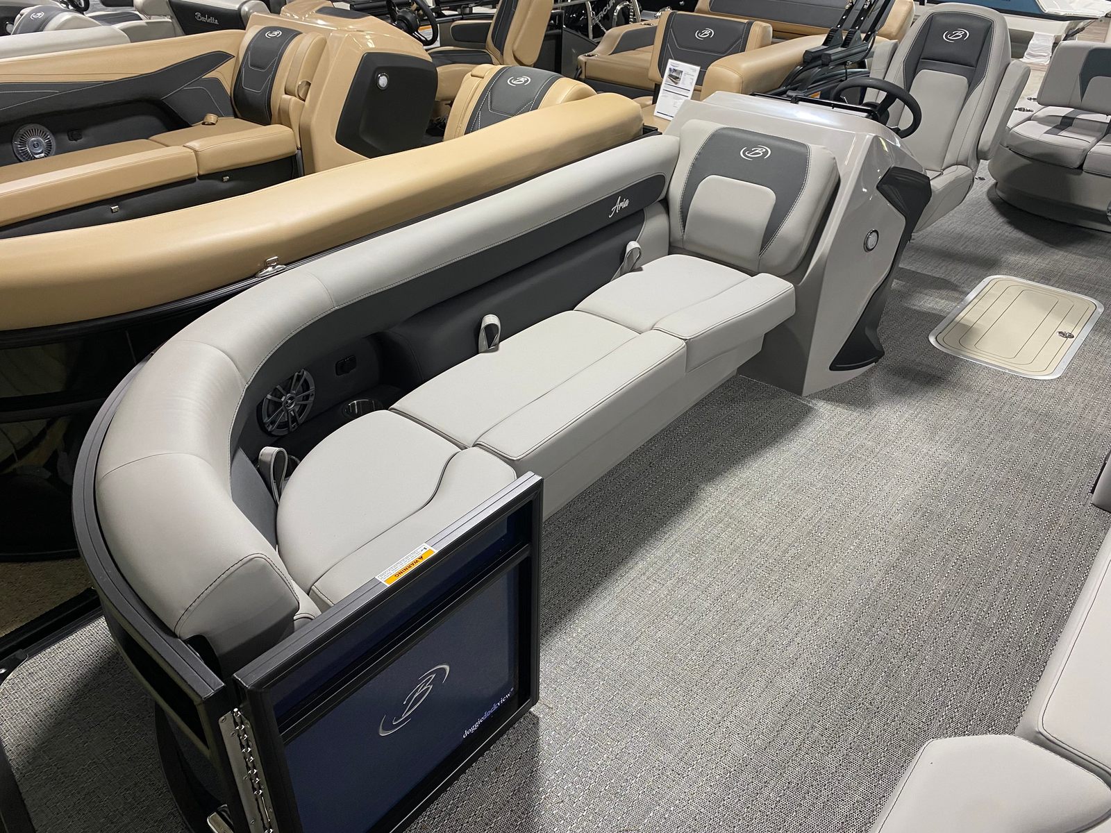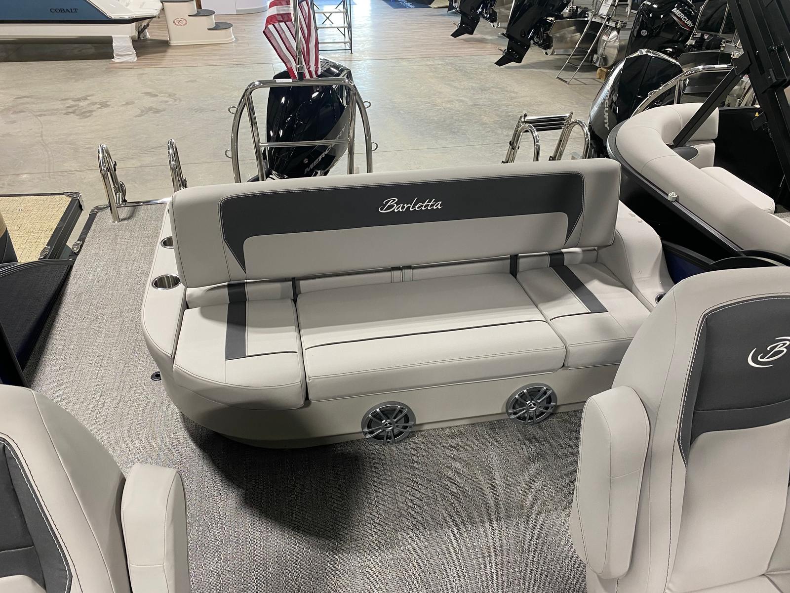The Barletta Aria A24UC is packed with special features that elevate your boating experience. The Railskin Color Aria in Blue Sapphire creates a striking visual impression, while the Blackout Package Aria adds a touch of sophistication to the exterior. Inside, the Tempest Gray furniture provides plush seating, complemented by Amore Gray flooring for a modern, cohesive look. The in-floor midship storage offers convenient space for stowing gear, keeping the deck clutter-free and organized.At the helm, the Simrad 7" G07 XSE delivers advanced navigation and control, ensuring you stay on course and informed throughout your adventures. The exterior is adorned with a stainless steel flag pole and American flag, adding a patriotic flair to your pontoon. These features combine to create a vessel that’s as functional as it is stylish.