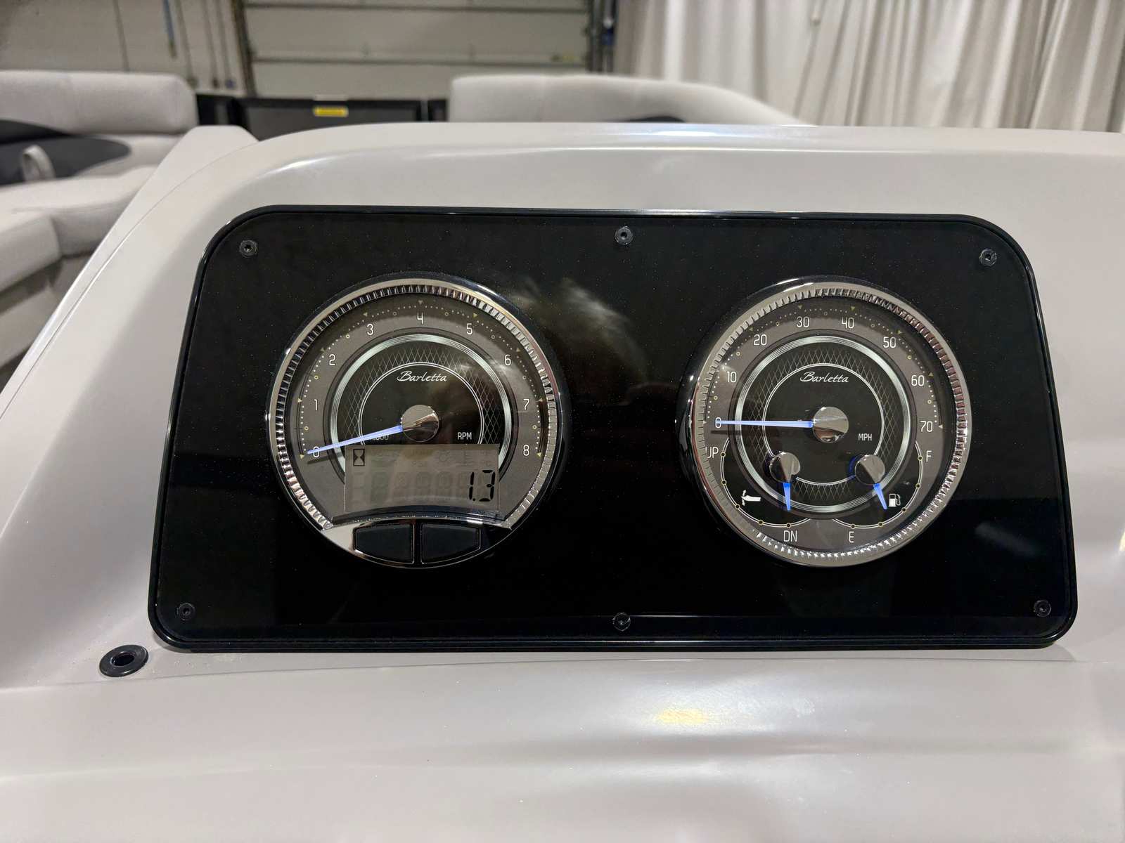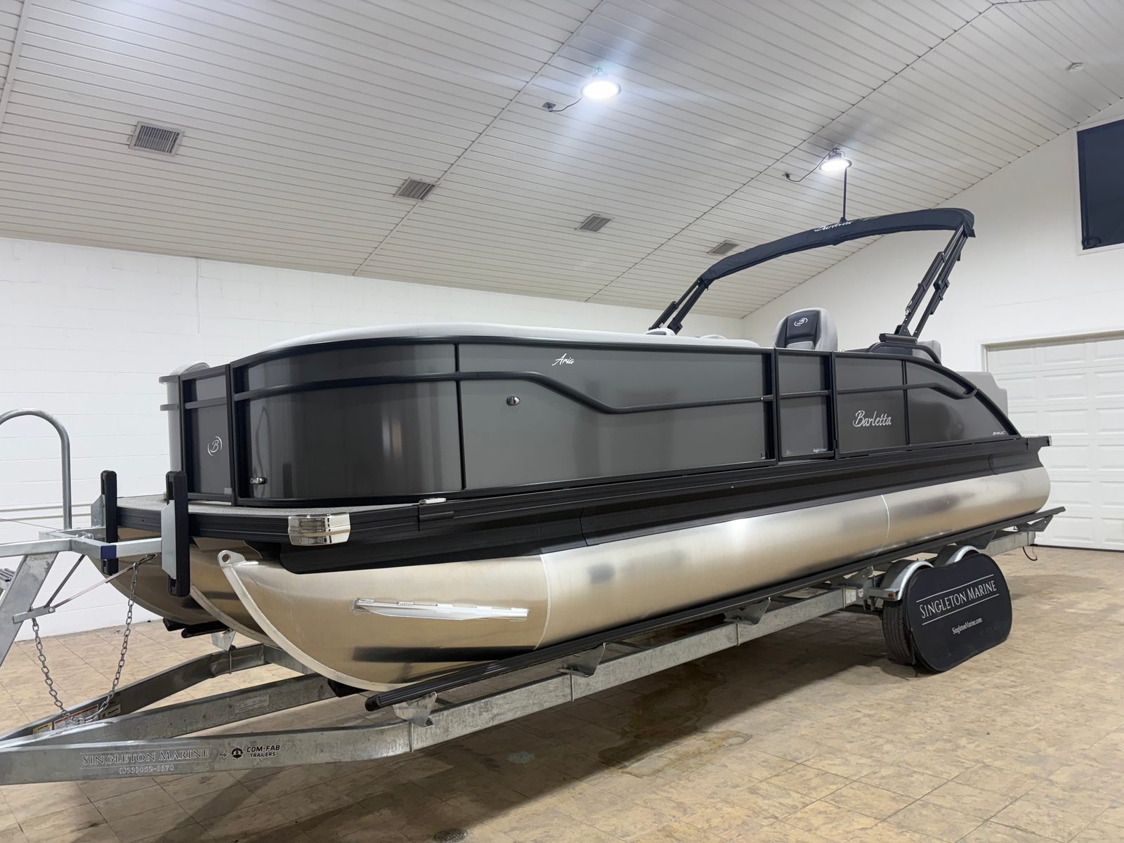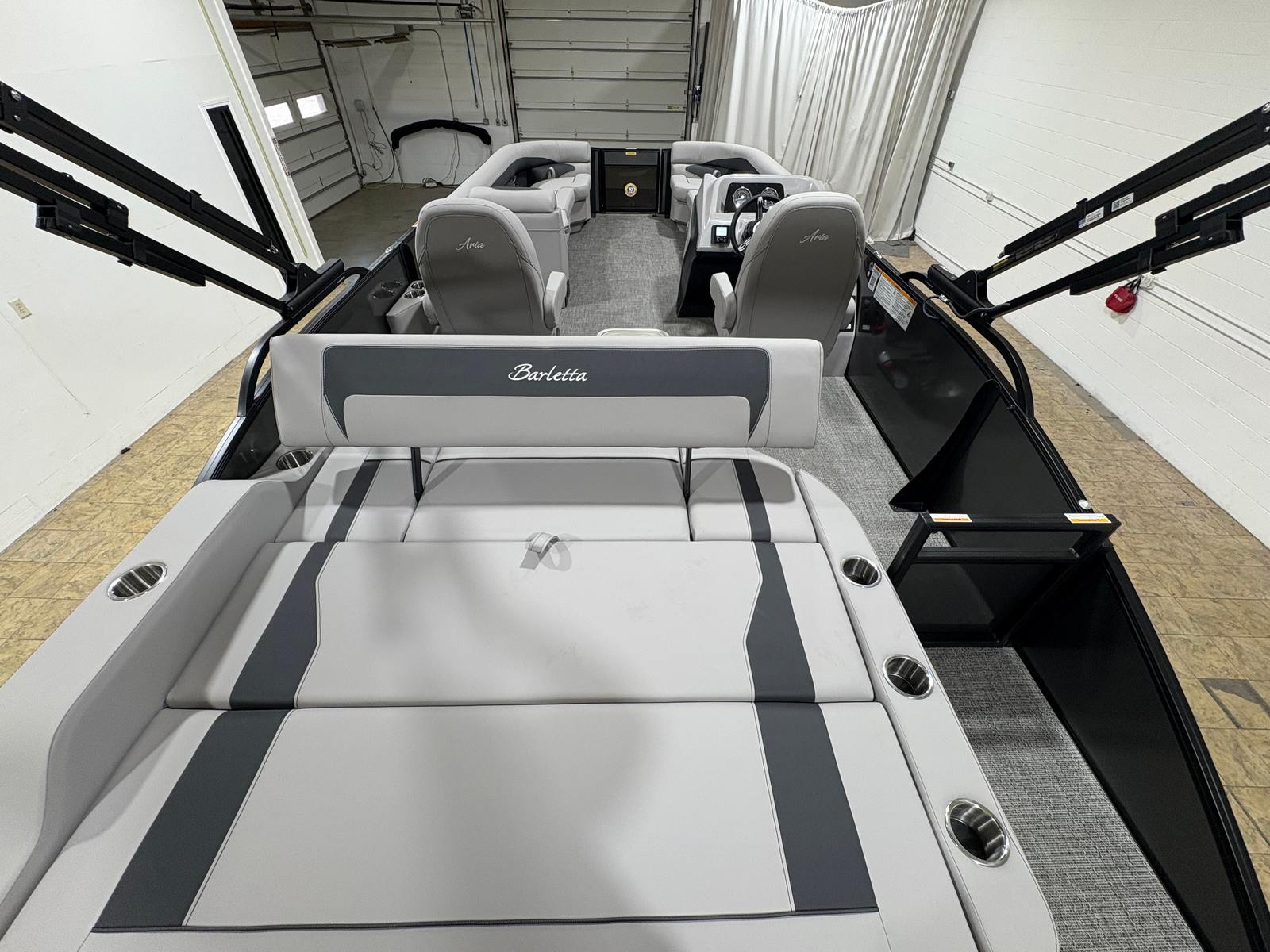 The 2026 Barletta Aria A24UC is a brand-new pontoon boat, measuring just over 23 feet in length. This spacious vessel offers ample room for family and friends, making it an ideal choice for those who love to entertain on the water. With its sleek lines and modern design, the Aria A24UC is sure to turn heads at any marina or lake. The combination of the Gray Moonstone Railskin color and the Blackout Package Aria gives this pontoon a sophisticated and contemporary appearance, while the Tempest Gray furniture and Amore Gray flooring create a welcoming and stylish interior.