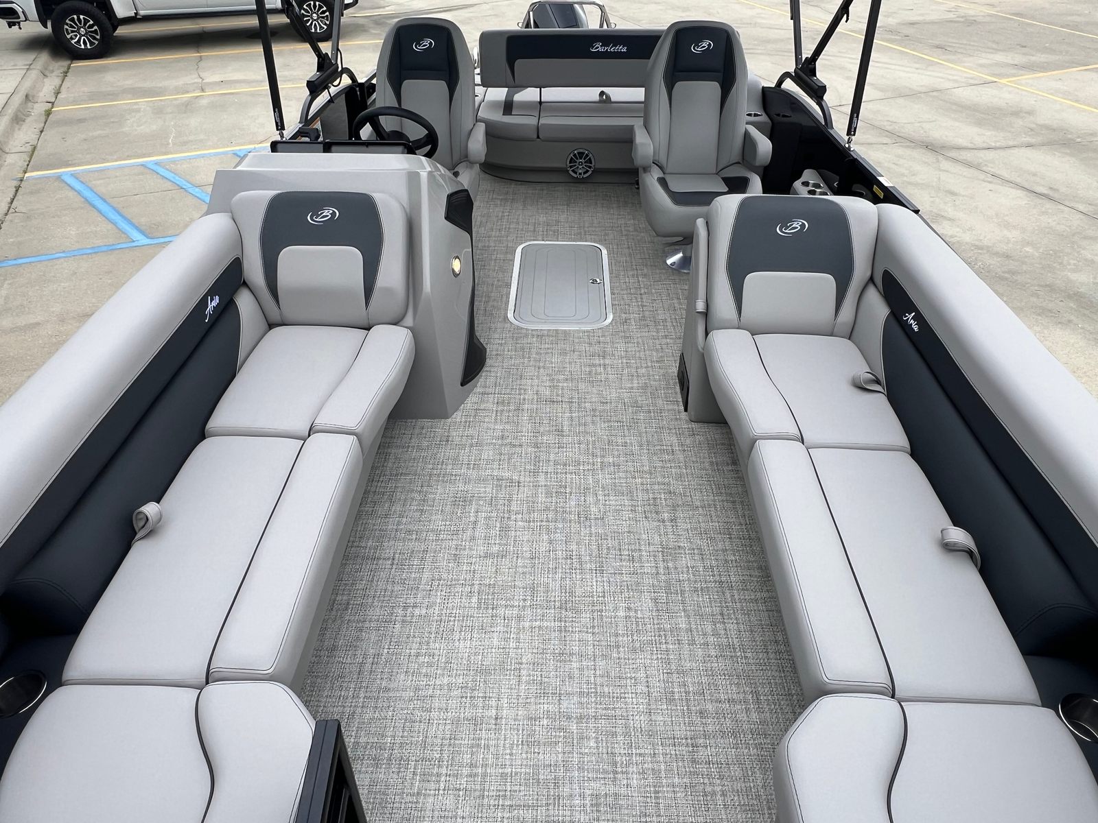 The Barletta Aria A24UC is packed with special features that elevate your boating experience. The Blackout Package Aria adds a bold, contemporary touch to the railskin, while the Black Diamond color scheme exudes elegance and style. The Tempest Gray furniture provides plush, supportive seating for all your guests, and the Amore Gray flooring is both attractive and easy to maintain. The Triple Toon Package Aria ensures superior buoyancy and handling, making this pontoon boat as capable as it is comfortable.For added convenience, the Aria A24UC includes a clipped playpen cover with poles, offering protection from the elements when your boat is not in use. The in-floor midship storage is perfect for stowing away gear, water toys, or personal items, keeping your deck clutter-free and organized. Every feature is thoughtfully designed to enhance your time on the water and make every outing more enjoyable.