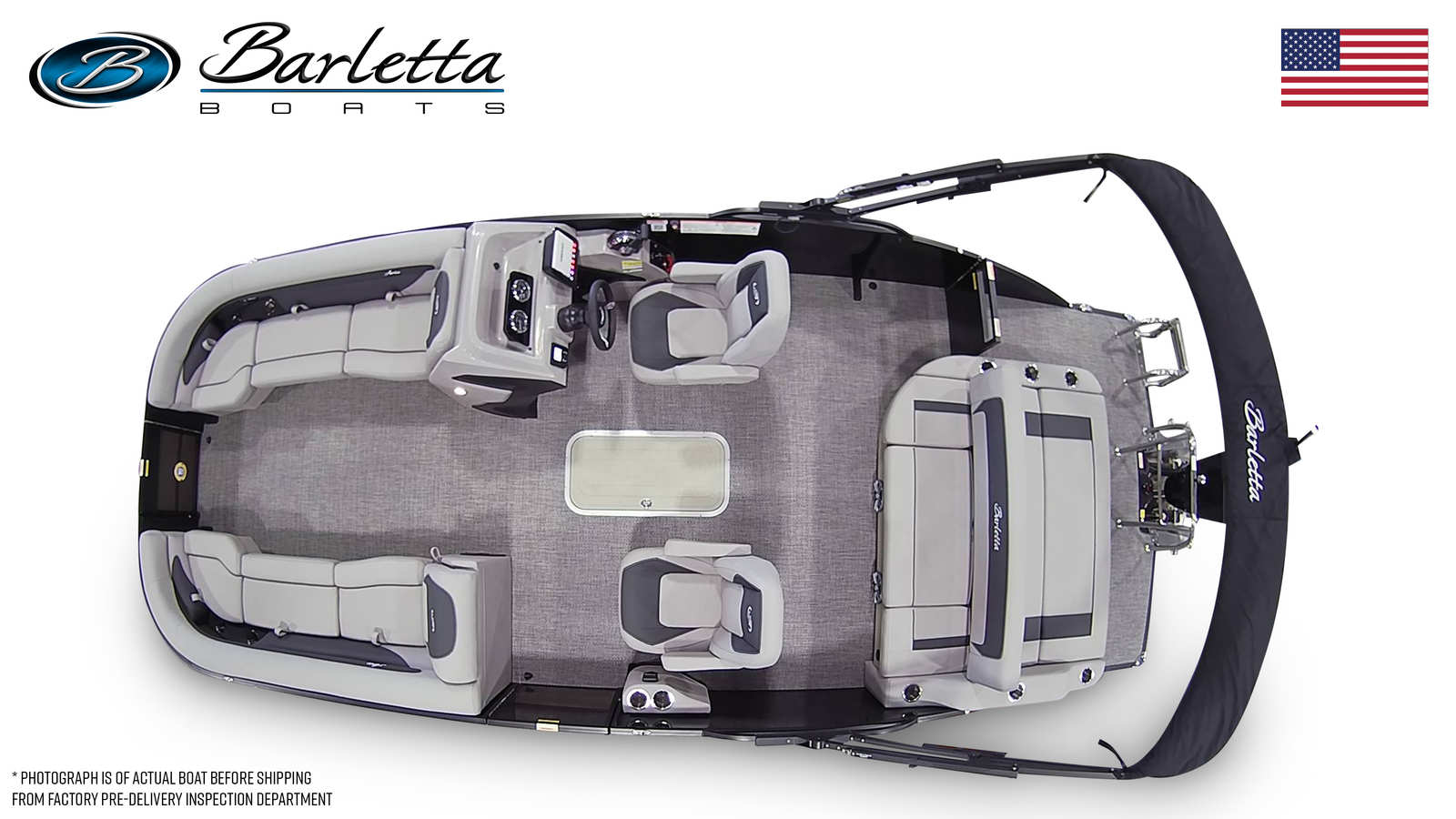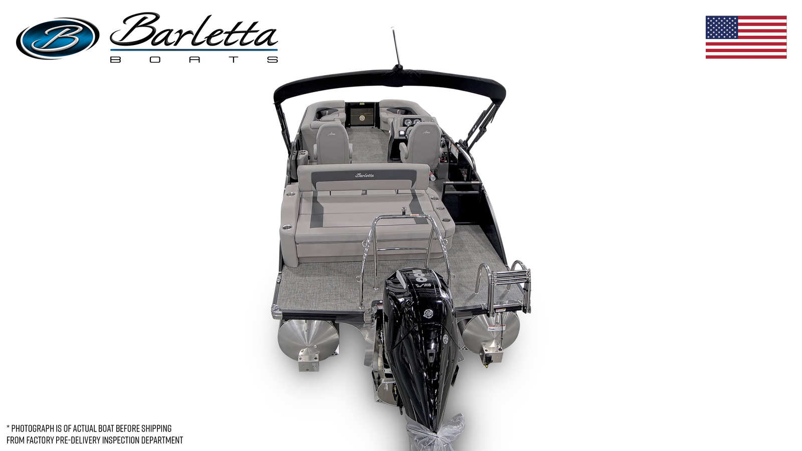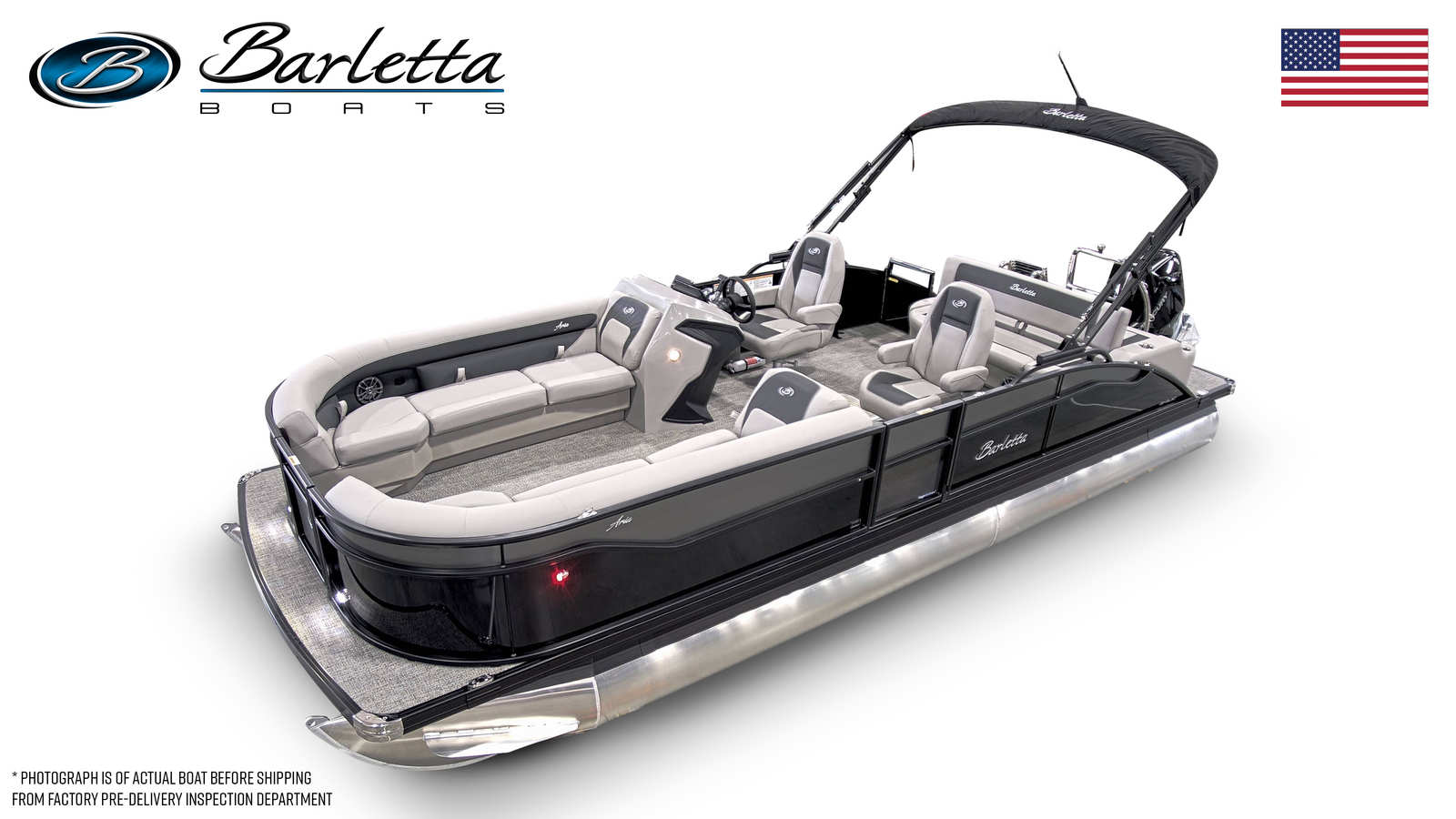 The Barletta Aria A24UC is packed with features designed to maximize comfort, convenience, and enjoyment on the water. The Triple Toon Package enhances stability and buoyancy, providing a smooth and secure ride even with a full crew on board. The railskin color in Black Diamond, complemented by the Gray Moonstone accent and Blackout Package, creates a sophisticated and modern look that stands out from the crowd. Inside, the Tempest Gray furniture offers plush seating and a welcoming atmosphere, while the Amore Gray flooring is both stylish and easy to maintain. A stainless steel flag pole with an American flag adds a patriotic touch, perfect for holiday outings and special occasions.