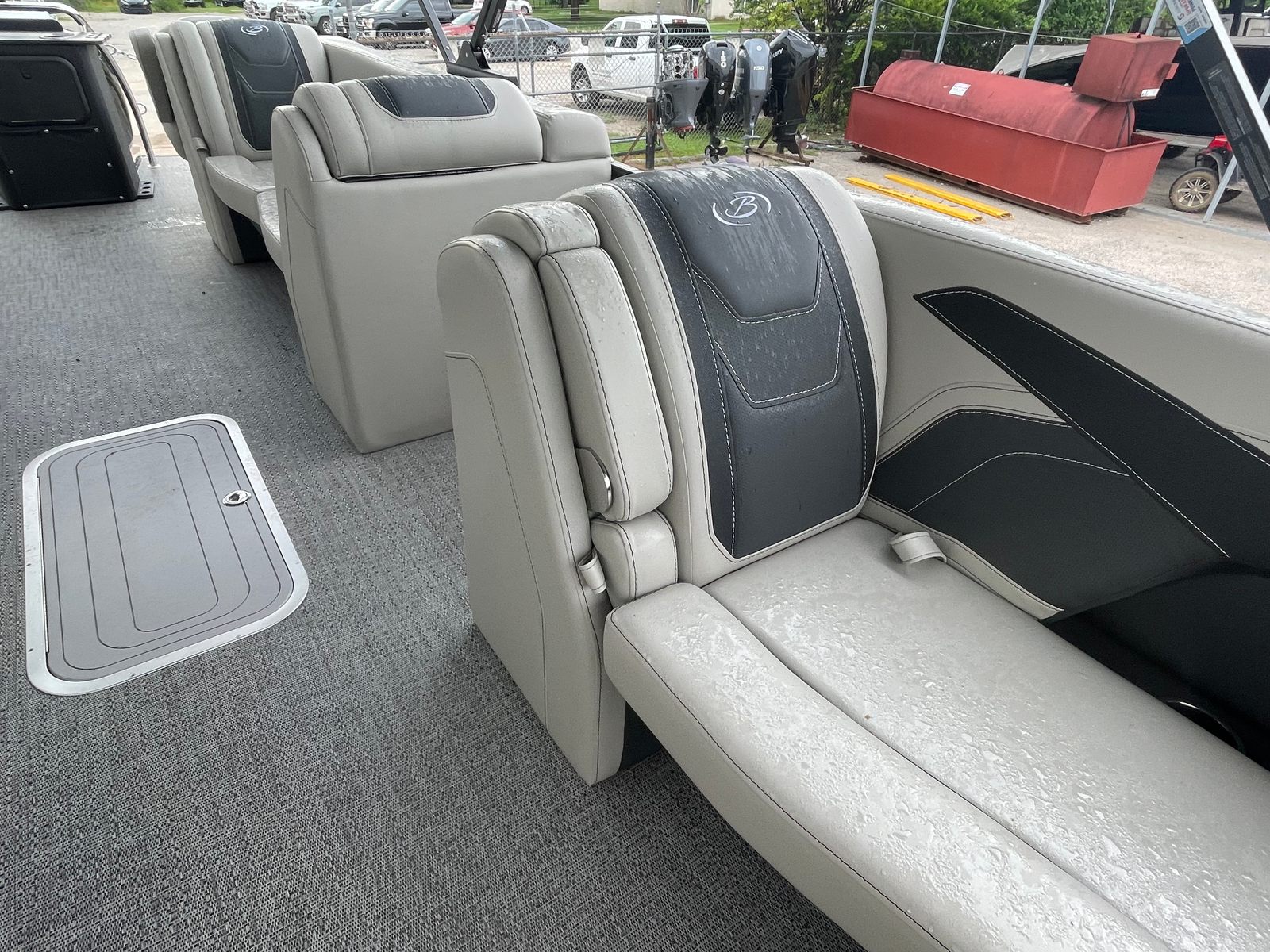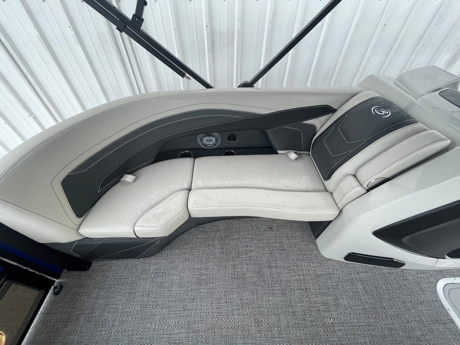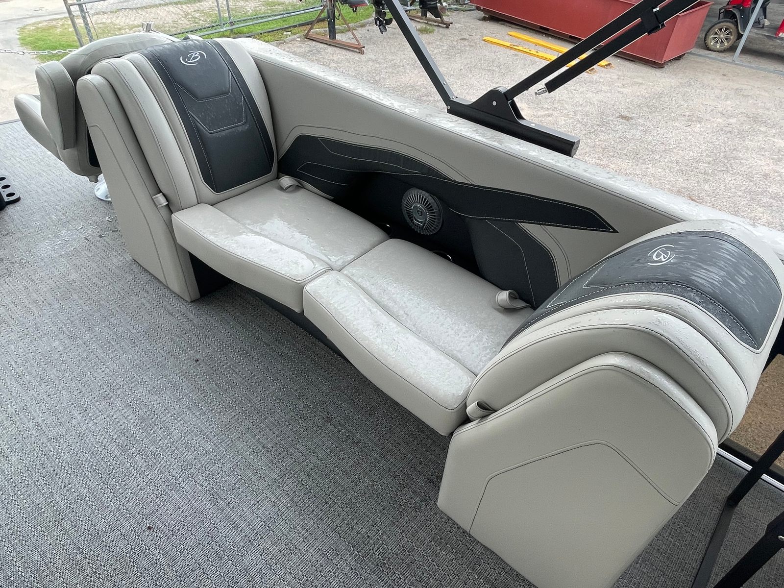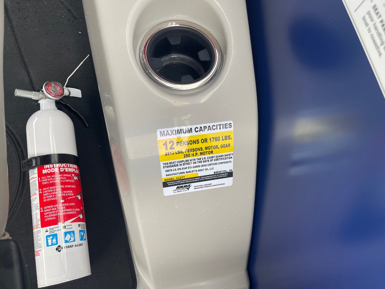 The Barletta Cabrio C22CC is loaded with premium features that elevate your boating experience. The Bohemian Blue Railskin color and Blackout Package Cabrio give the exterior a modern, sophisticated look, while the Metal Jacket Protectant ensures lasting beauty and protection against the elements. Inside, the Marquesan Gray with Onyx furniture offers plush seating and a refined aesthetic, complemented by the Amore Gray flooring that is both stylish and easy to maintain.The Triple Toon Package with midship storage adds stability, buoyancy, and ample space for storing gear, making it easy to keep the deck clutter-free. The double bimini canvas provides generous shade, allowing you and your guests to relax comfortably even on the sunniest days. Every detail, from the rigged engine with stainless steel prop to the thoughtfully designed seating arrangements, is crafted to maximize comfort, convenience, and enjoyment on the water.