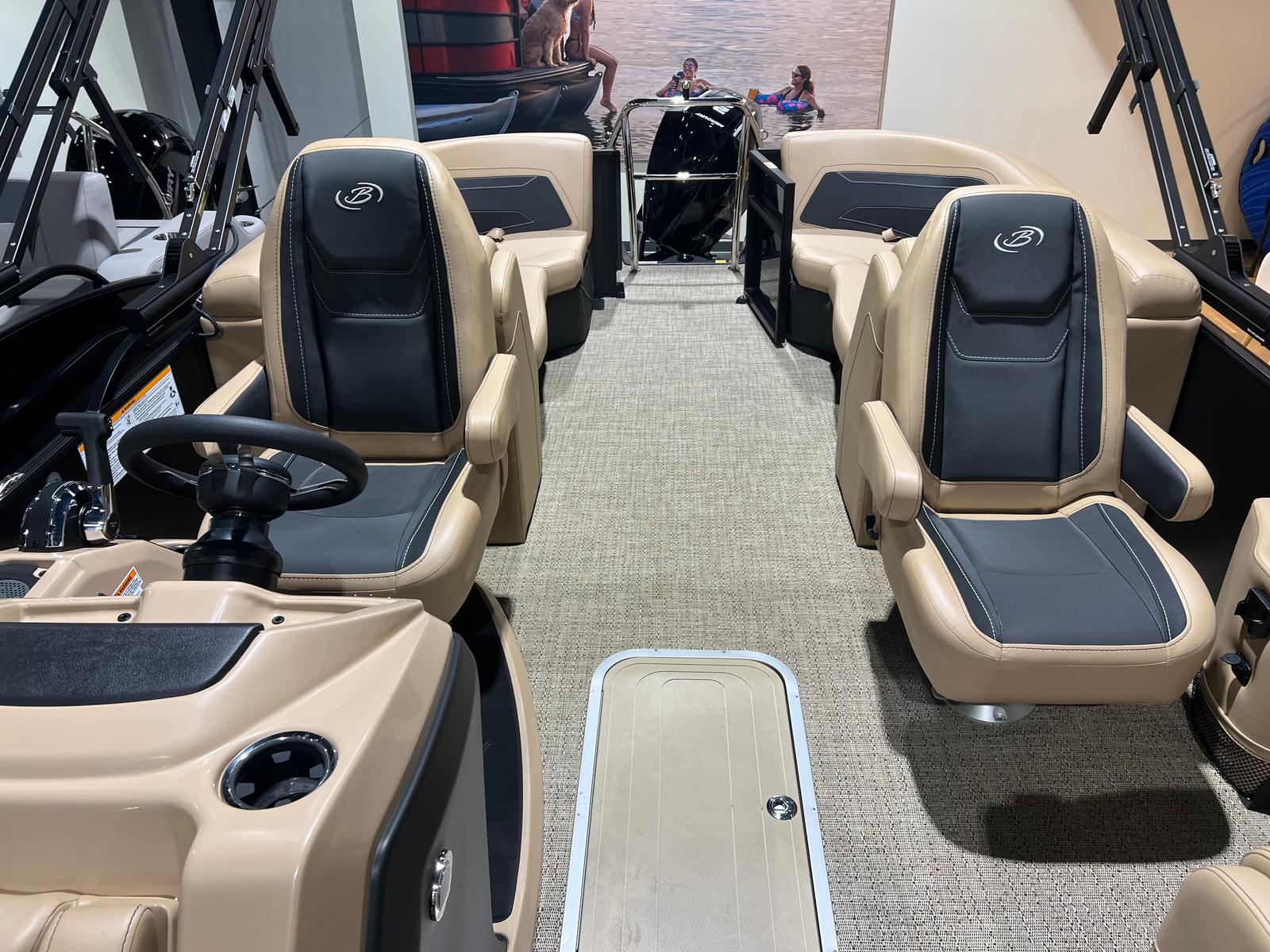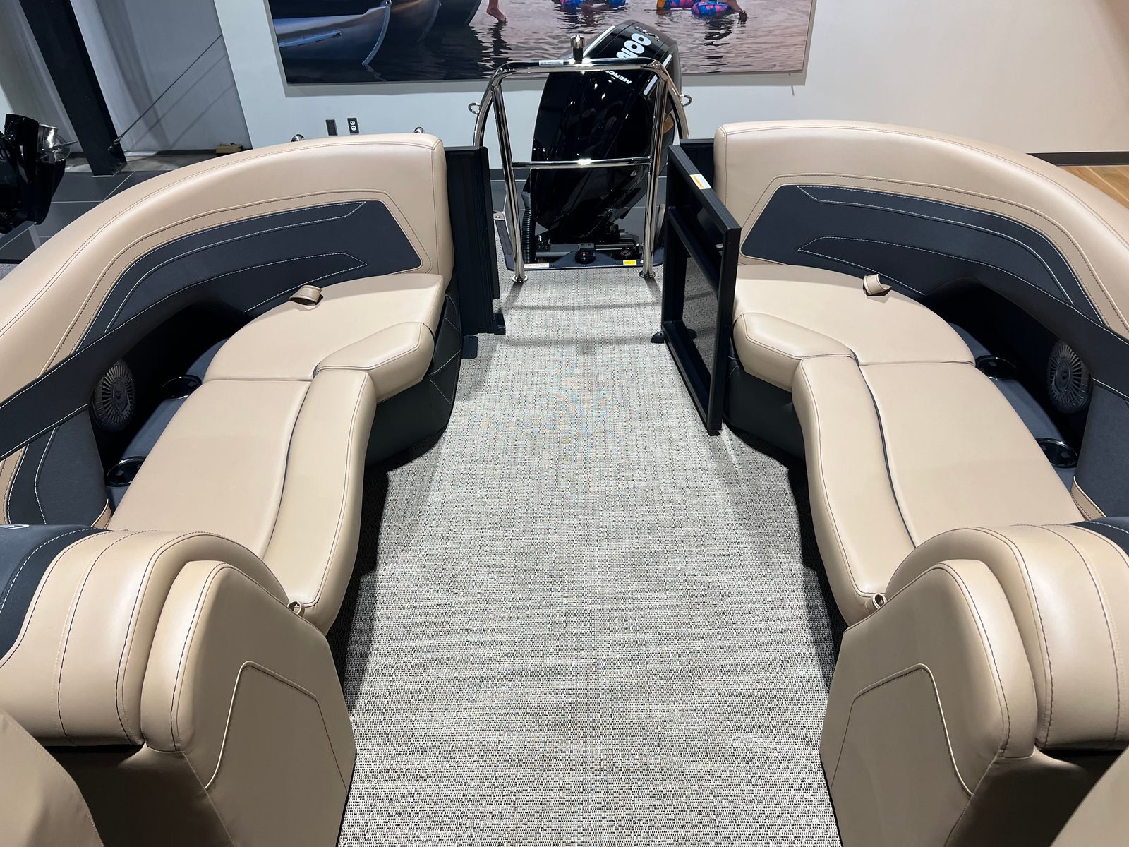 The Barletta Cabrio C22QC is packed with premium features that set it apart from other pontoon boats for sale. The triple toon package with midship storage provides extra space for gear, water toys, and essentials, keeping the deck clutter-free and organized. Navigation and entertainment are elevated by the Simrad 7" G07 XSR Chartplotter/Multifunction Display, offering intuitive controls and real-time information for a safer, more enjoyable boating experience.Aesthetically, the Railskin Color in Black Diamond, complemented by a Matte Black accent, gives the boat a striking, contemporary look. The interior RGB lighting package creates a customizable ambiance, perfect for evening cruises or lively gatherings. The furniture, finished in Carmella Tan with Onyx accents, offers plush seating and a refined atmosphere, ensuring every passenger rides in comfort and style.Additional touches like the stainless steel flag pole with an American flag add a sense of pride and personality to your vessel, making it truly unique. Every detail, from the rigged engine with a stainless steel prop to the thoughtfully designed interior, reflects Barletta’s commitment to quality and innovation.
