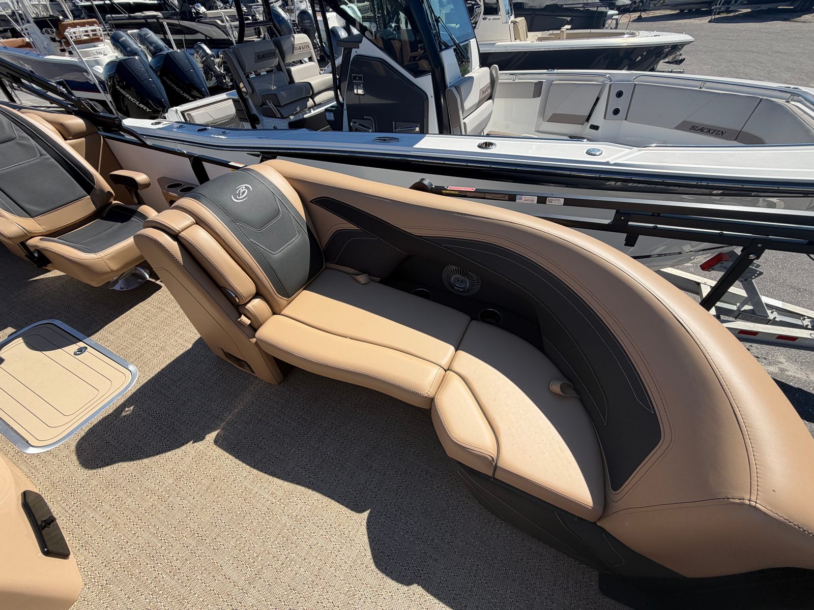 The Barletta Cabrio C22QC is packed with special features that elevate your boating experience. The Coastal Edition Cabrio ensures enhanced durability and style, making it ideal for a variety of environments. The Triple Toon Package with midship storage adds stability and extra space, allowing for smoother rides and convenient storage solutions. The furniture is finished in Carmella Tan with Onyx accents, providing plush seating and a luxurious atmosphere. The Amore Tan flooring complements the overall design, creating a warm and inviting space for you and your guests. Every detail, from the railskin packages to the premium upholstery, is thoughtfully crafted to deliver comfort and elegance.
