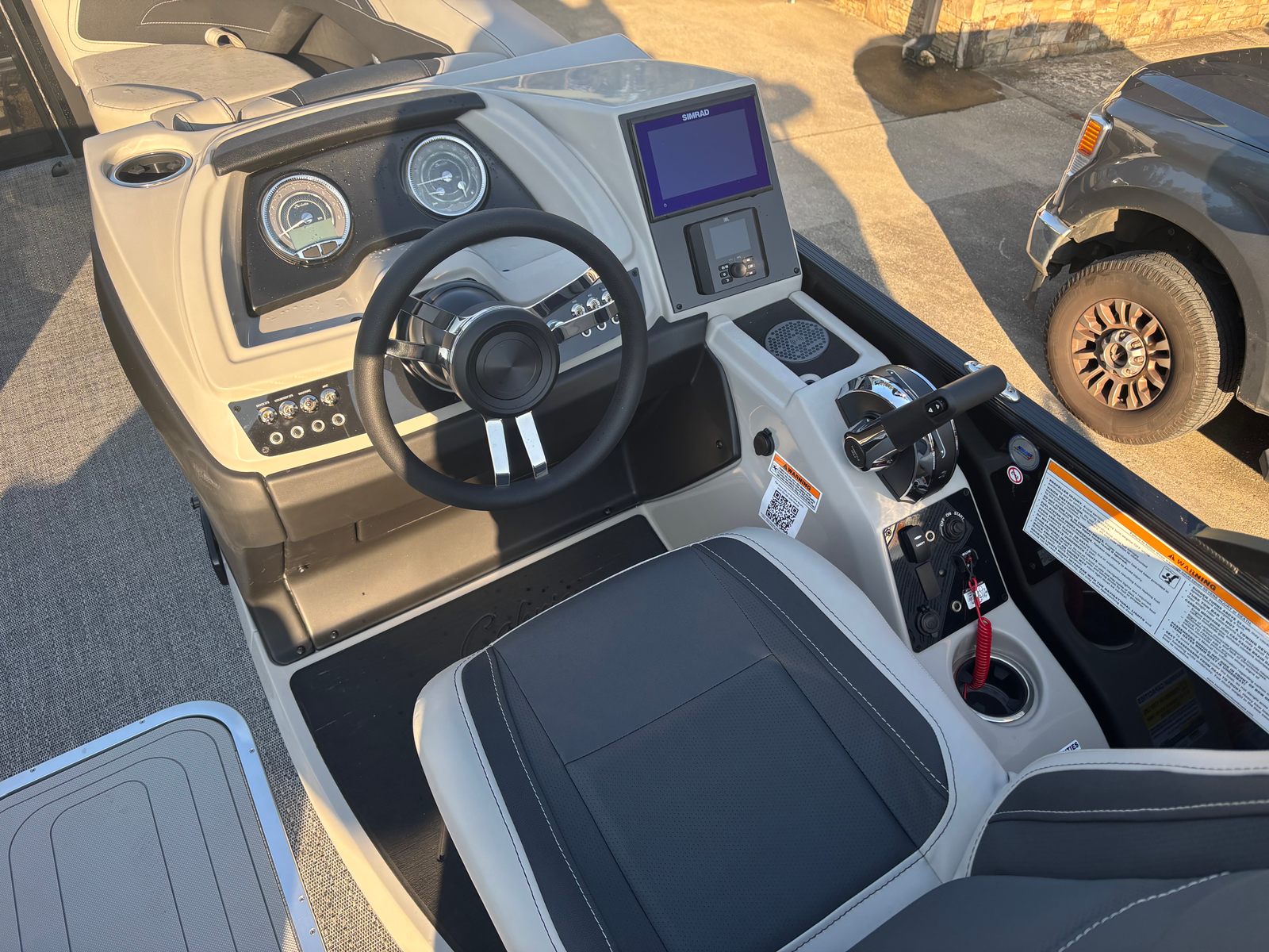 The 2026 Barletta Cabrio C22QC is loaded with features that elevate your boating experience. The Blackout Package Cabrio railskin adds a sleek, modern touch to the exterior, while the stainless steel prop ensures durability and optimal performance. Inside, the Marquesan Gray furniture with Onyx accents creates a sophisticated and inviting atmosphere, perfectly complemented by the Amore Gray flooring for a cohesive and stylish look.For those who appreciate advanced technology, the helm is equipped with a Simrad 7" G07 XSR chartplotter and multifunction display, providing essential navigation tools at your fingertips. The interior RGB lighting package allows you to set the mood for any occasion, while the stainless steel flag pole with an American flag adds a patriotic flair to your vessel. The Triple Toon Package with midship storage not only enhances performance but also offers convenient space for your gear and essentials, keeping the deck clutter-free and organized.