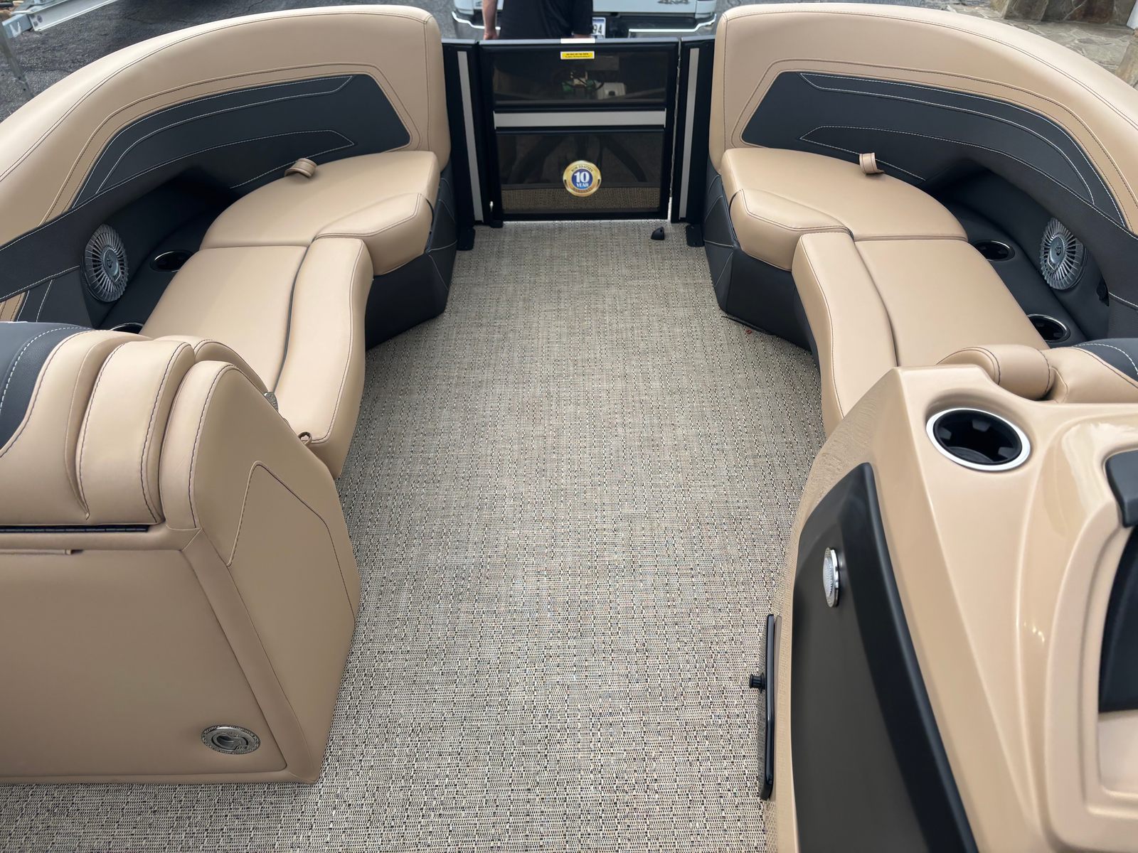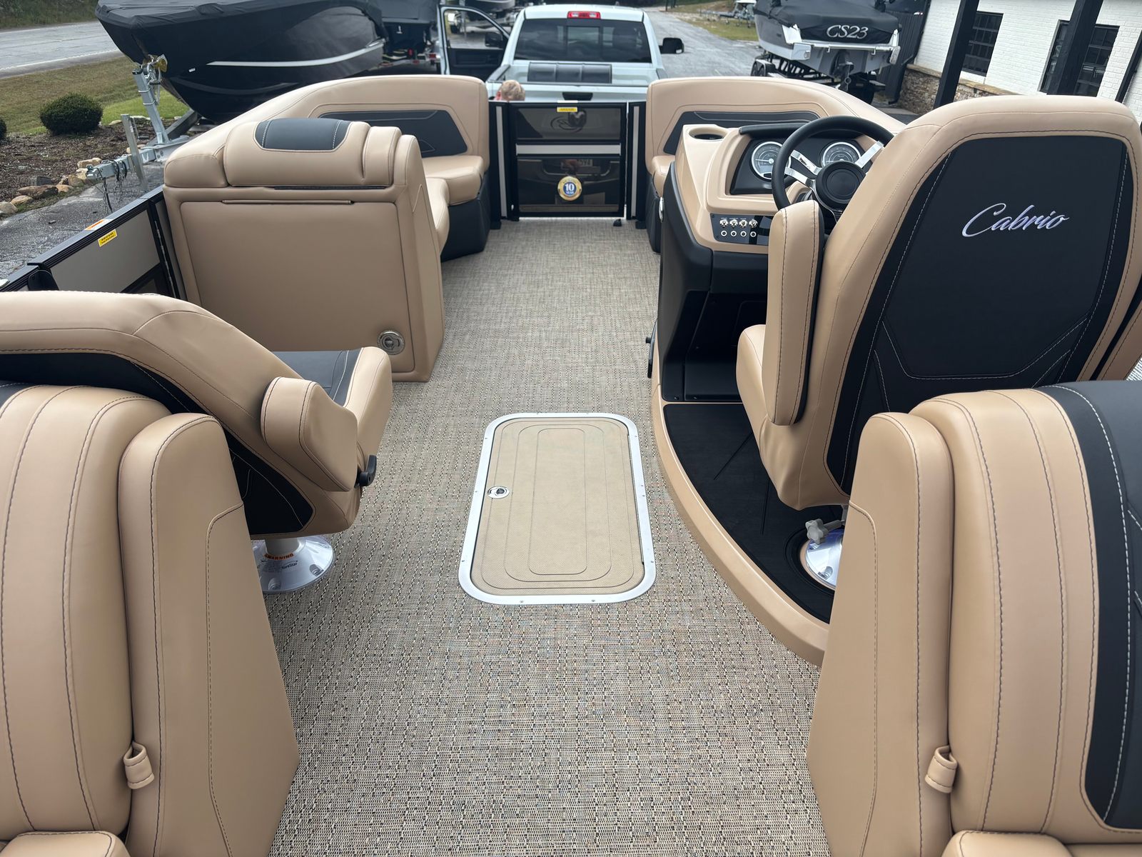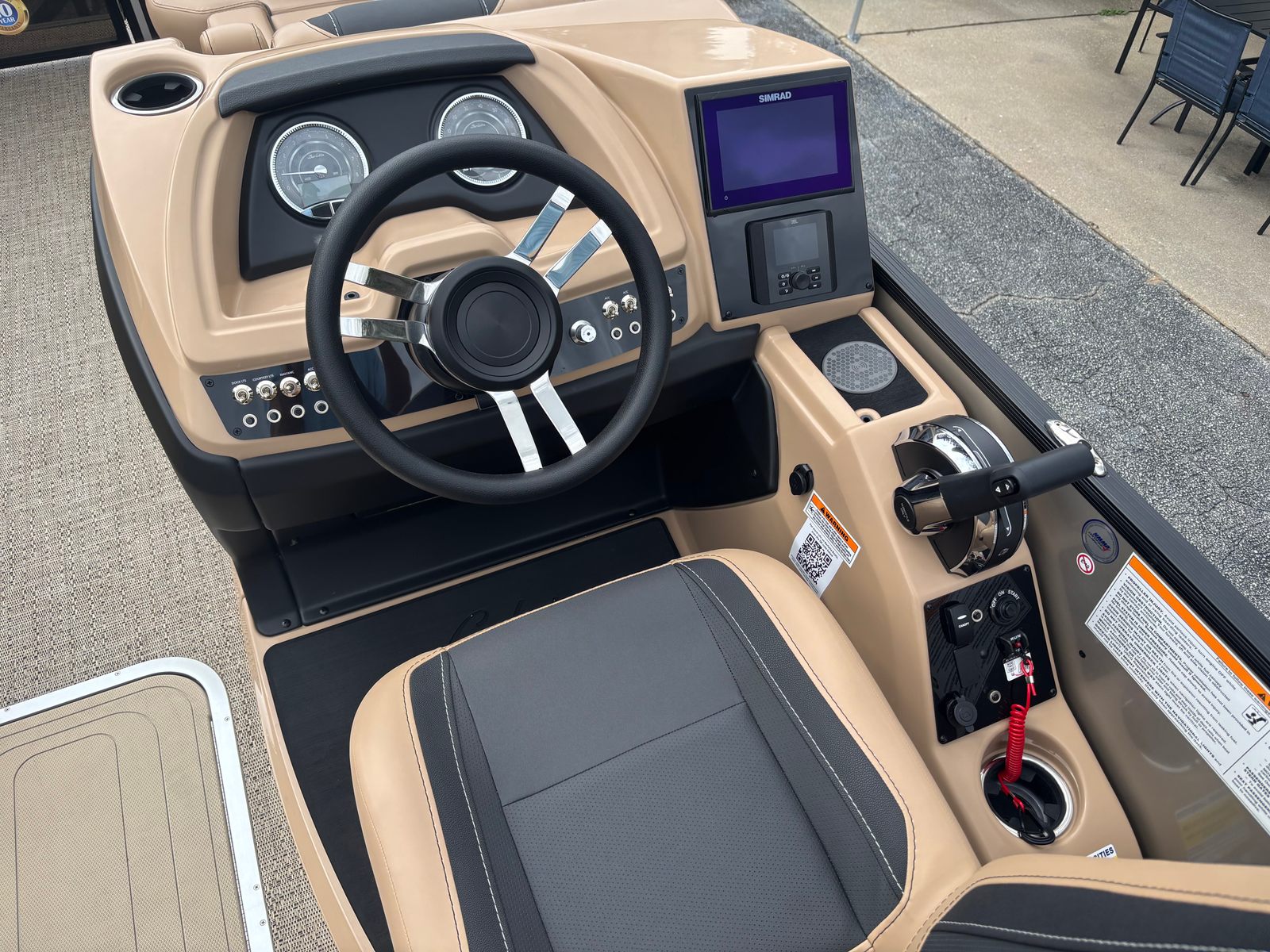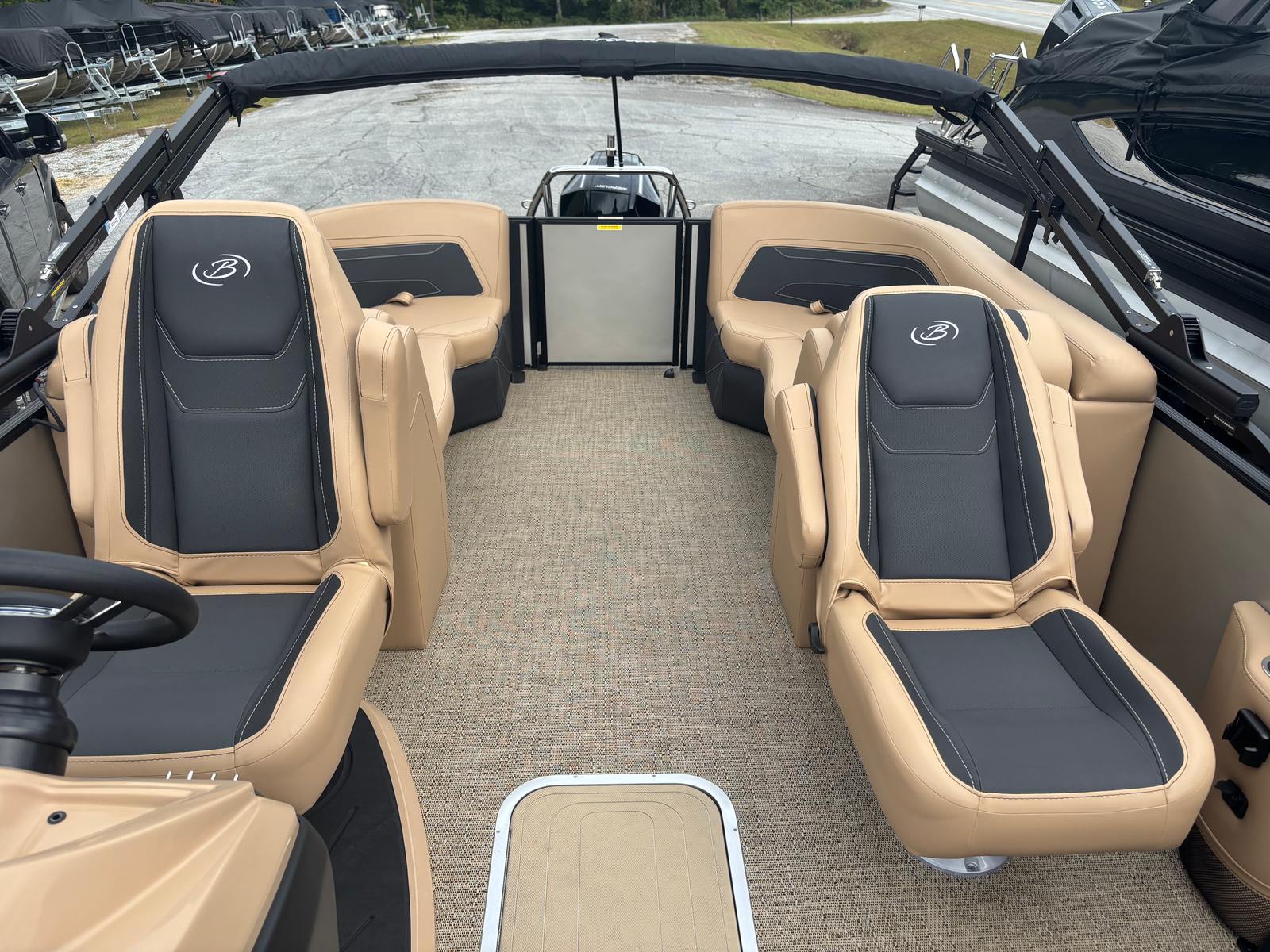 The 2026 Barletta Cabrio C22QC is packed with premium features designed to enhance your time on the water. The Blackout Package Cabrio railskin package gives the boat a bold, contemporary look, while the Champagne color accent adds a touch of elegance. The interior is adorned with Amore Tan flooring, providing both comfort and durability underfoot. The Carmella Tan with Onyx furniture offers plush seating and a refined aesthetic, making every journey a luxurious experience.At the helm, you’ll find a Simrad 7" G07 XSR Chartplotter/Multifunction Display, offering advanced navigation and system monitoring capabilities. The interior RGB lighting package creates a customizable ambiance, perfect for evening cruises or entertaining guests after sunset. The exterior is finished with a stainless steel flag pole and an American flag, adding a patriotic flair to your boating adventures.