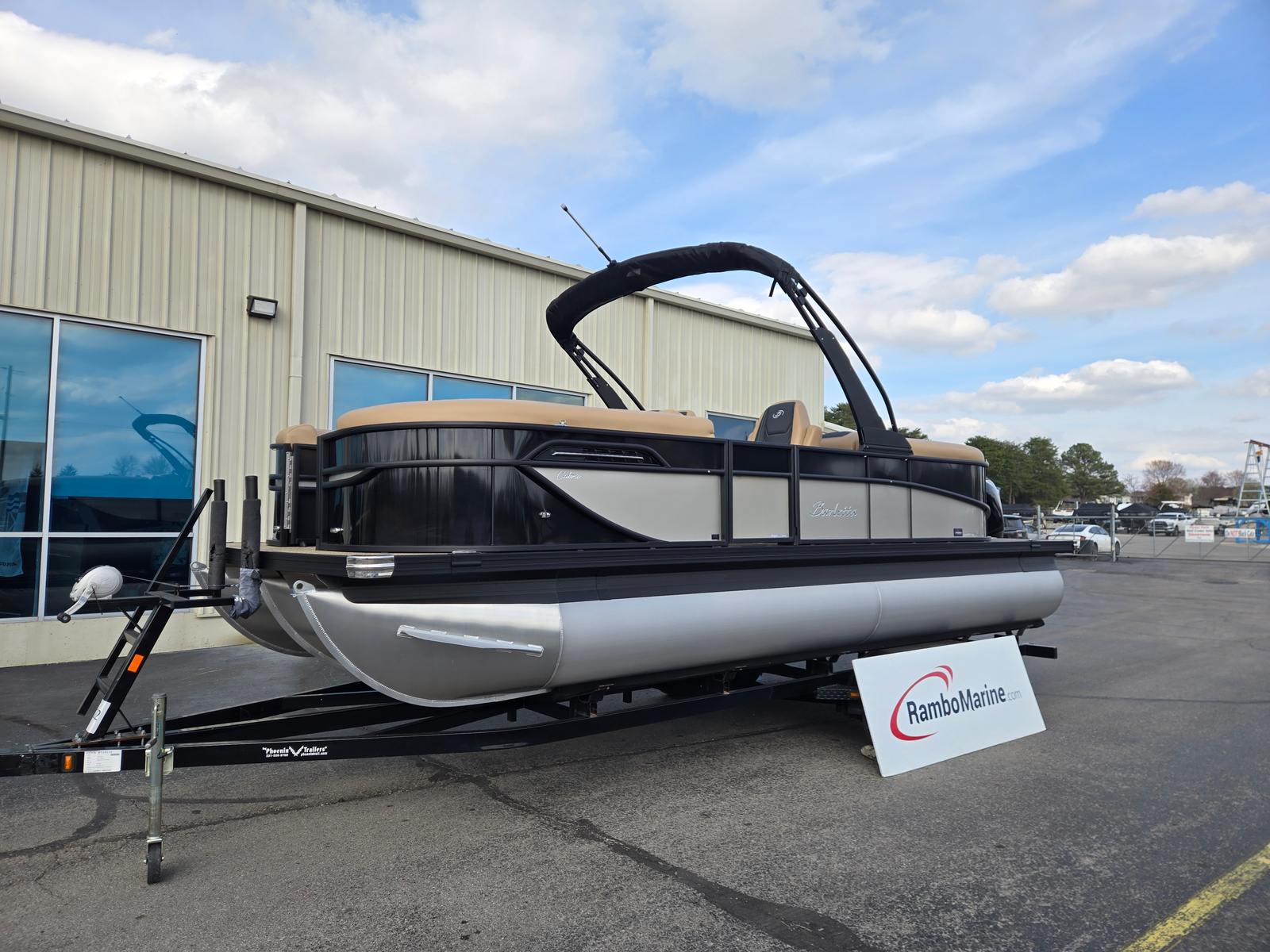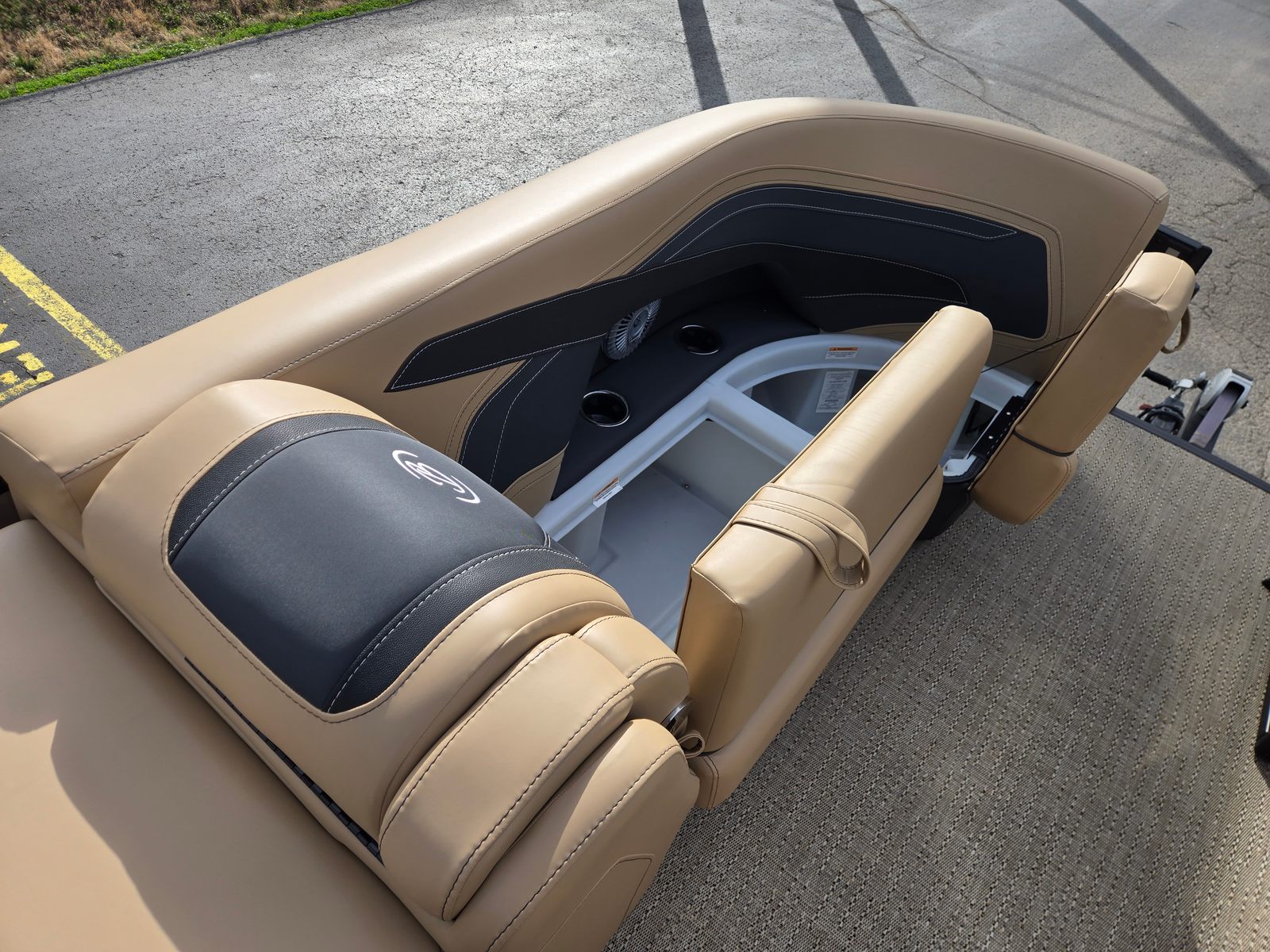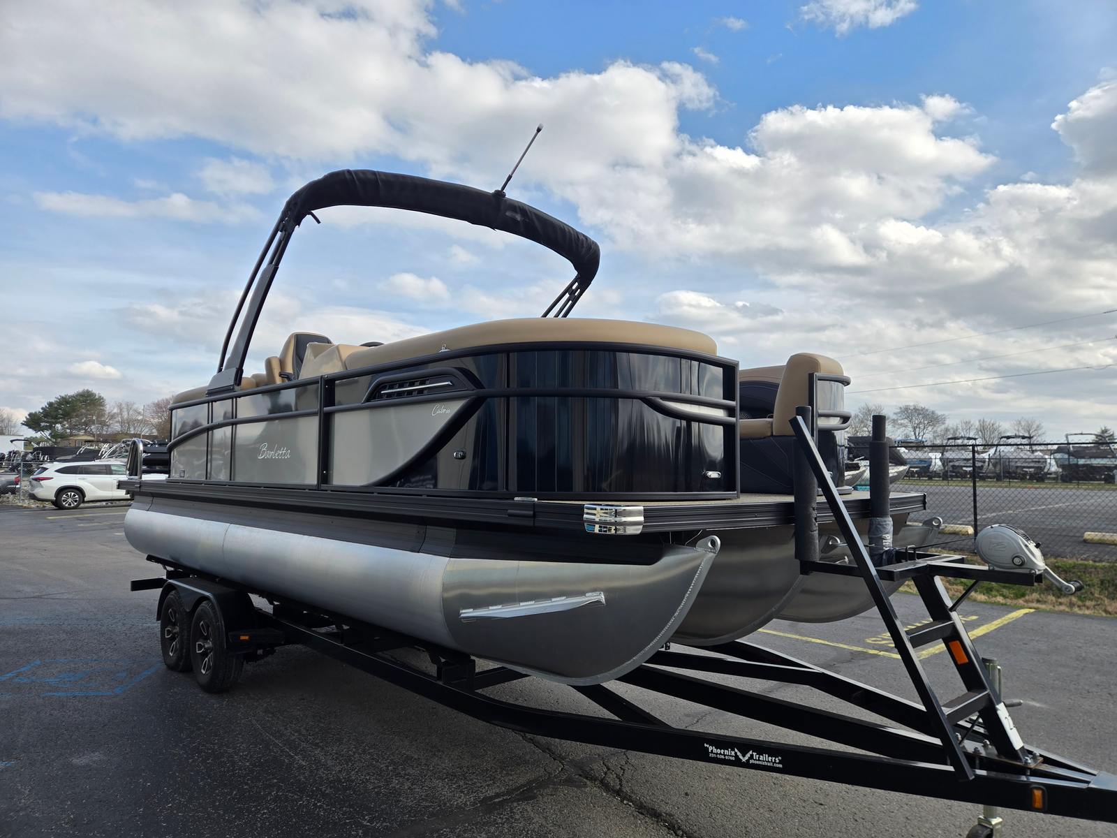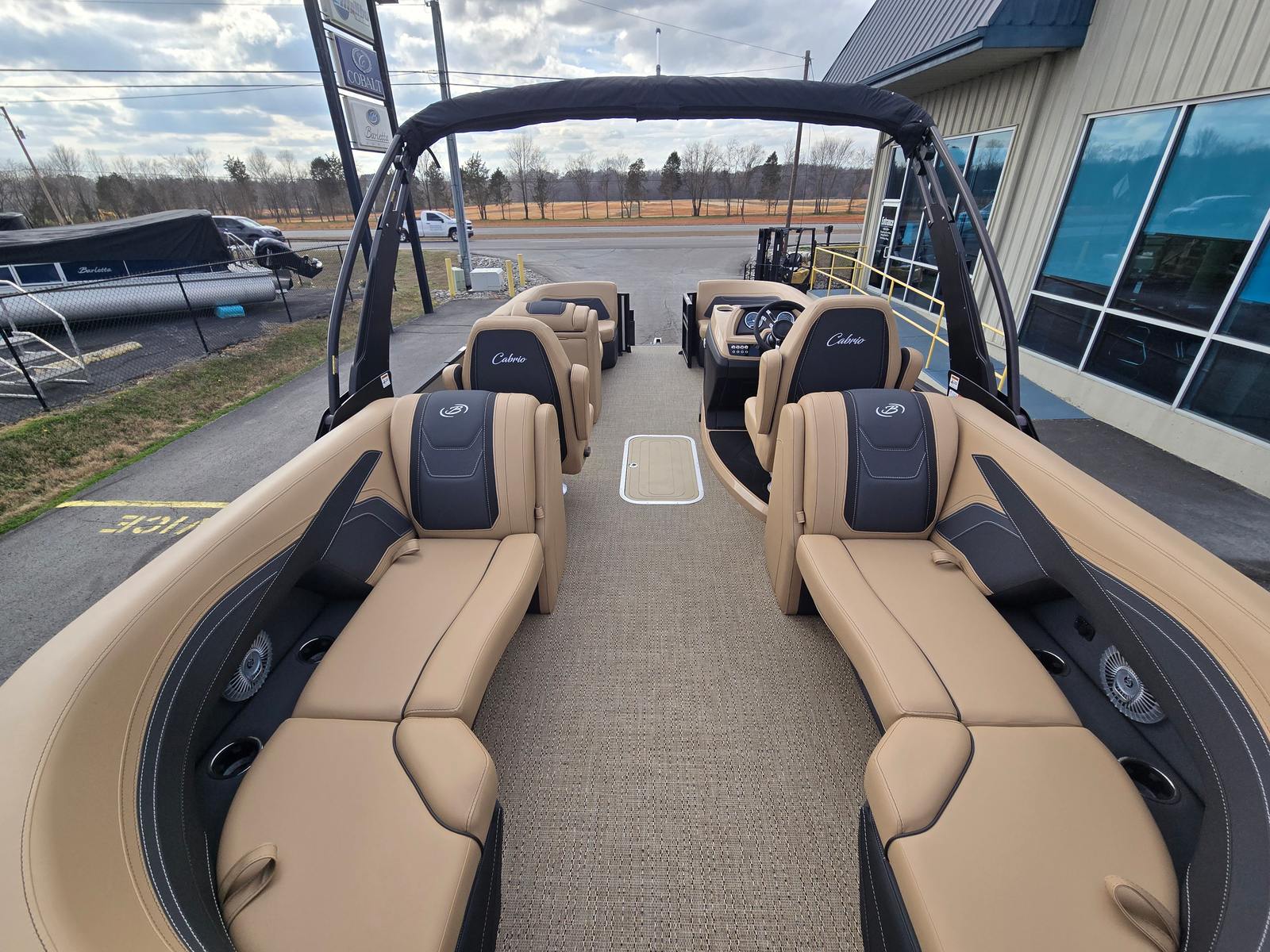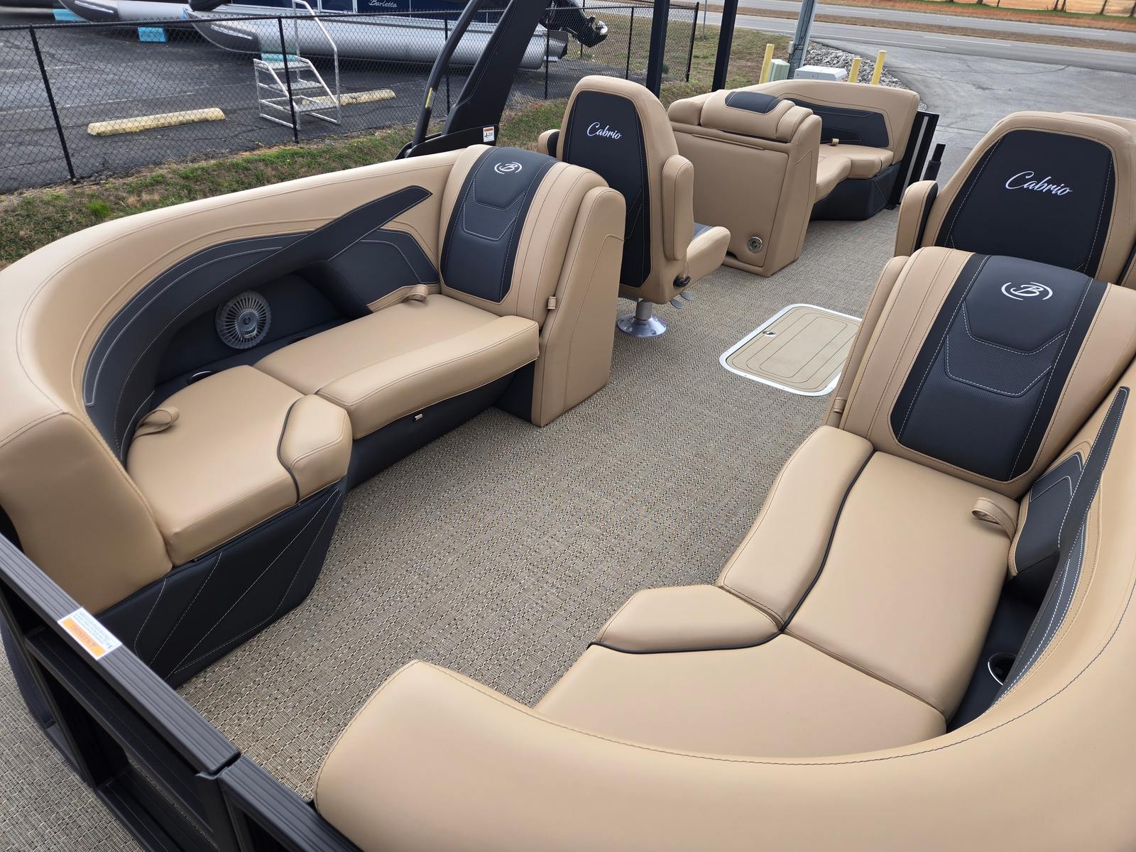 Step aboard and experience the luxury of Carmella Tan furniture accented with Onyx, providing a sophisticated and inviting atmosphere for you and your guests. The Amore Tan flooring offers both comfort and style, creating a warm and welcoming environment underfoot. The Railskin Color in Black Diamond, complemented by a Champagne accent, gives the boat a sleek and modern appearance, further enhanced by the Blackout Package Cabrio for a bold, contemporary look.The Triple Toon Package with midship storage is a standout feature, offering additional stability and ample space for storing gear, water toys, or picnic essentials. The Sport Bimini, installed in place of the standard bimini, provides superior shade and protection from the sun, allowing you to enjoy long days on the water in comfort. Every detail of the Barletta Cabrio C22QC is designed to maximize your enjoyment and convenience, making it a truly exceptional pontoon boat for sale.