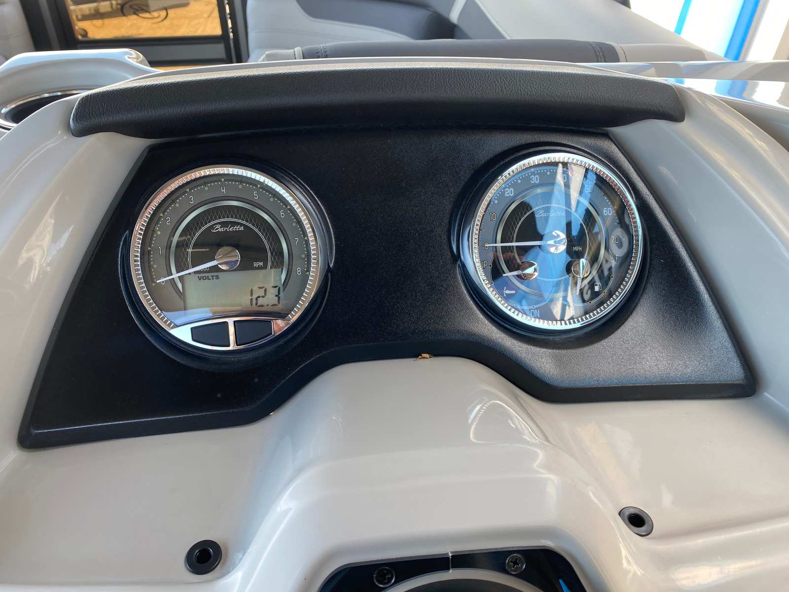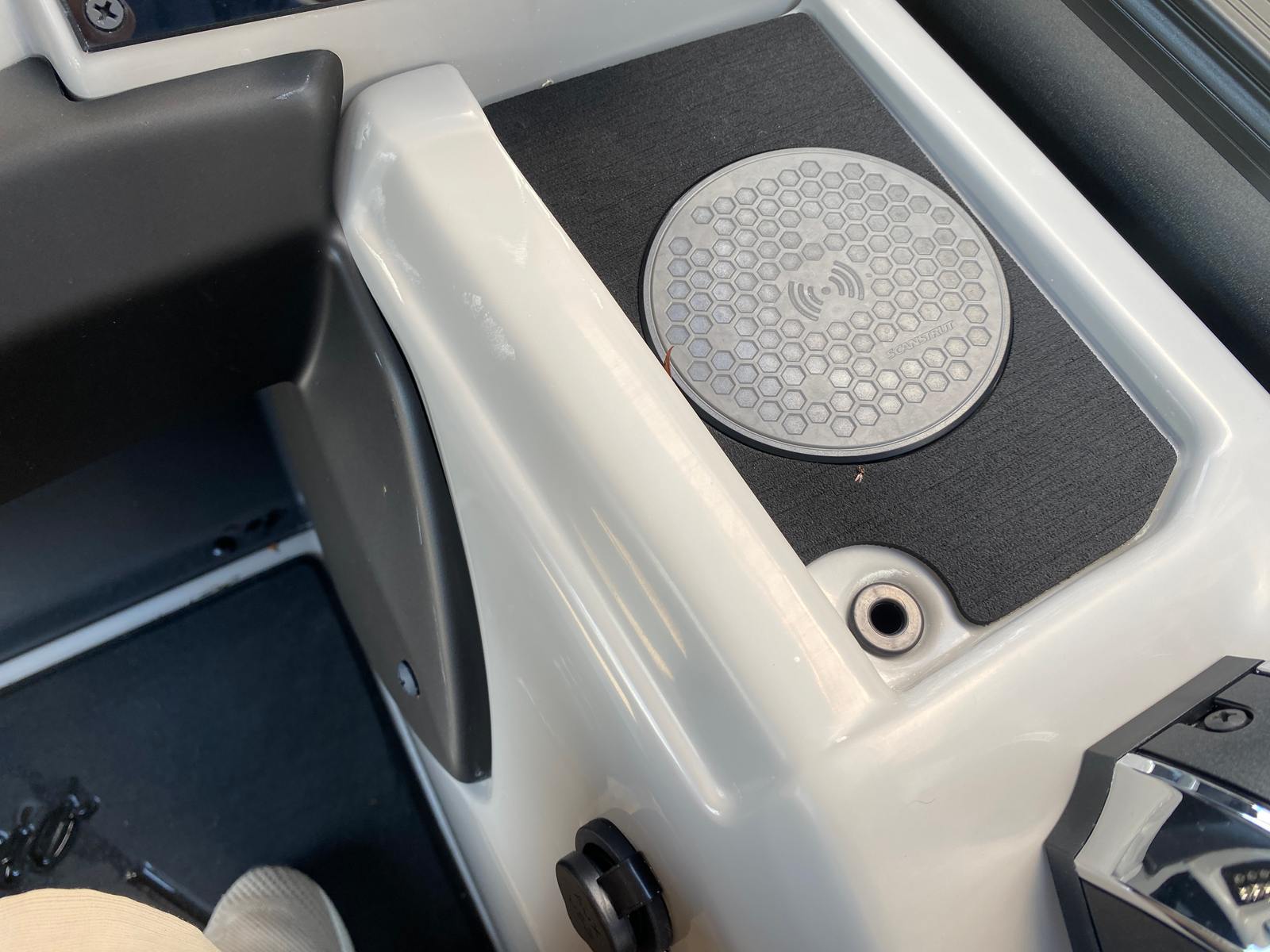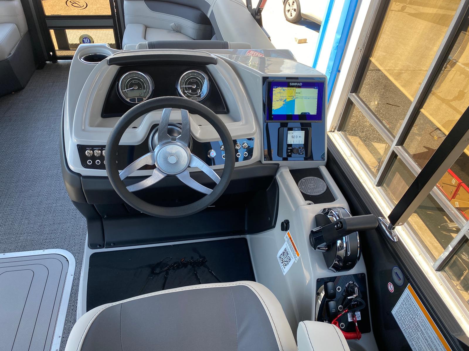 The Barletta Cabrio C22QC is packed with premium features that set it apart from other pontoon boats for sale. The triple toon package not only boosts performance but also provides convenient midship storage, making it easy to stow away gear and essentials for a clutter-free deck. The Blackout Package Cabrio railskin adds a touch of elegance and modern flair, while the Metal Jacket Protectant on the exterior ensures your investment stays looking pristine season after season.Enjoy shade and comfort with the double bimini setup, including an additional power bimini for effortless adjustment. Inside, you’ll find a thoughtfully designed table, pedestal, and base equipped with Yeti-ready cupholders, perfect for keeping refreshments close at hand during social gatherings. The helm features a Simrad 7 G07 XSR chartplotter/multifunction display, offering advanced navigation and control at your fingertips. Every detail, from the flooring to the railskin color, has been chosen to enhance your boating lifestyle.