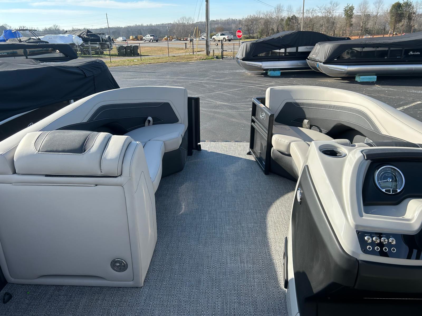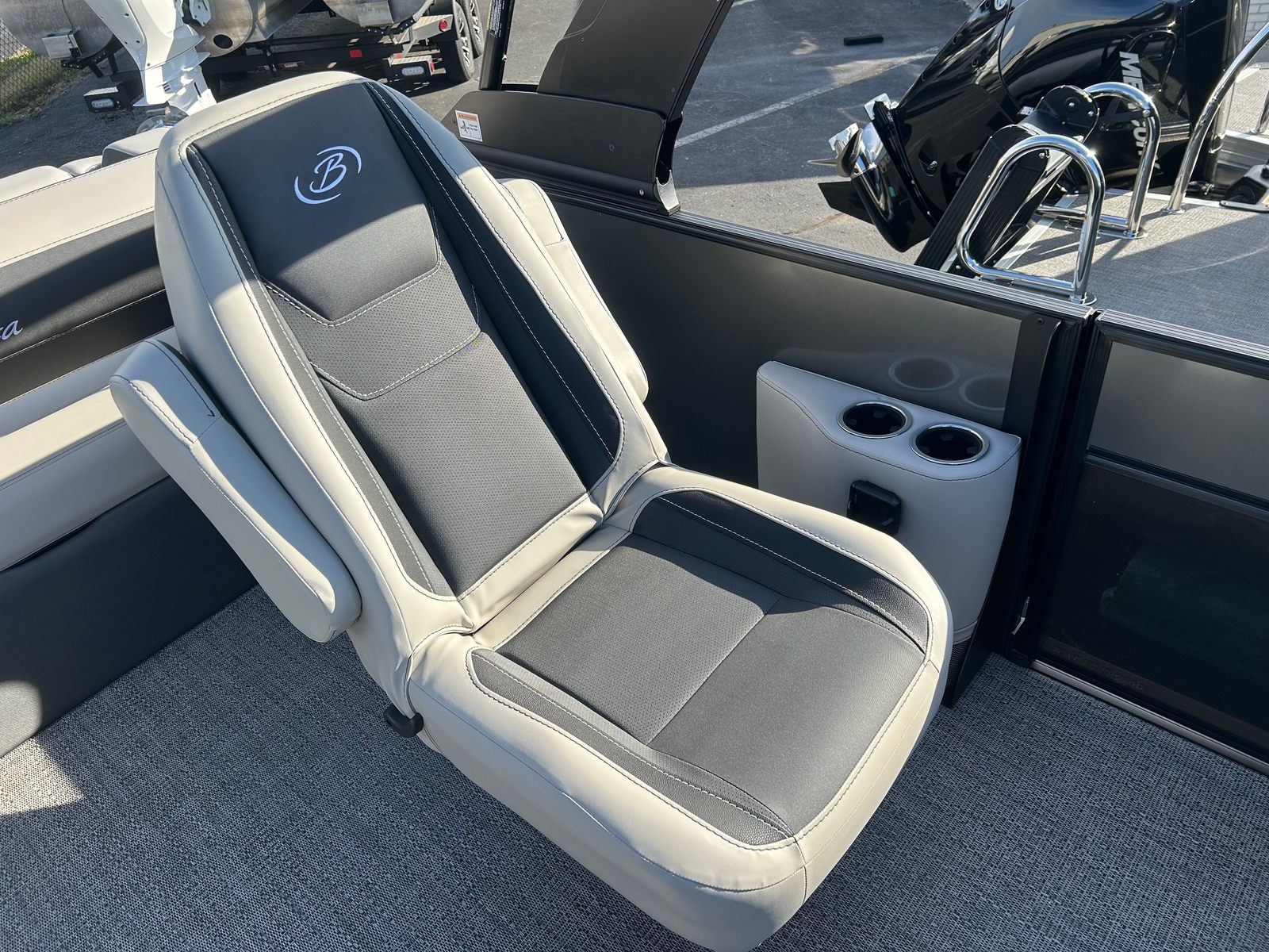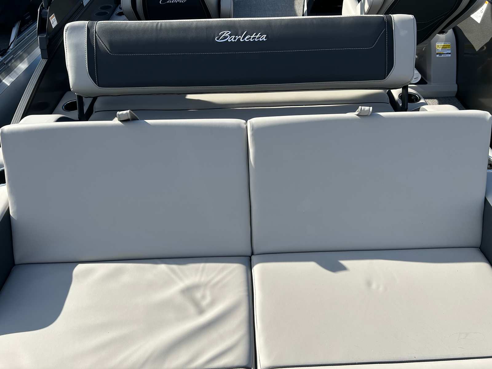 Step aboard the Barletta Cabrio C22UC and discover a world of comfort and style. The Railskin Color in Black Diamond, accented by Gray Moonstone, creates a striking visual appeal, while the Blackout Package Cabrio adds a touch of modern sophistication. The interior is adorned with Marquesan Gray furniture featuring Onyx accents, providing plush seating and a refined ambiance. The Amore Gray flooring is both elegant and durable, designed to withstand the rigors of active days on the water.The Triple Toon Package with midship storage not only boosts performance but also offers practical storage solutions for your gear and water toys. The Sport Bimini, installed in place of the standard bimini, provides generous shade and protection from the sun, ensuring comfort during long days on the water. Every detail of the Cabrio C22UC is thoughtfully designed to enhance your boating experience, from the premium materials to the innovative layout.