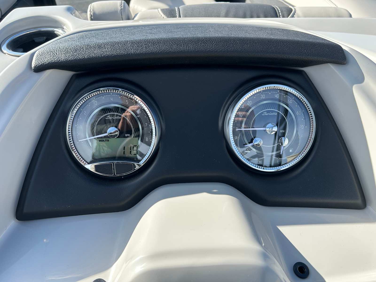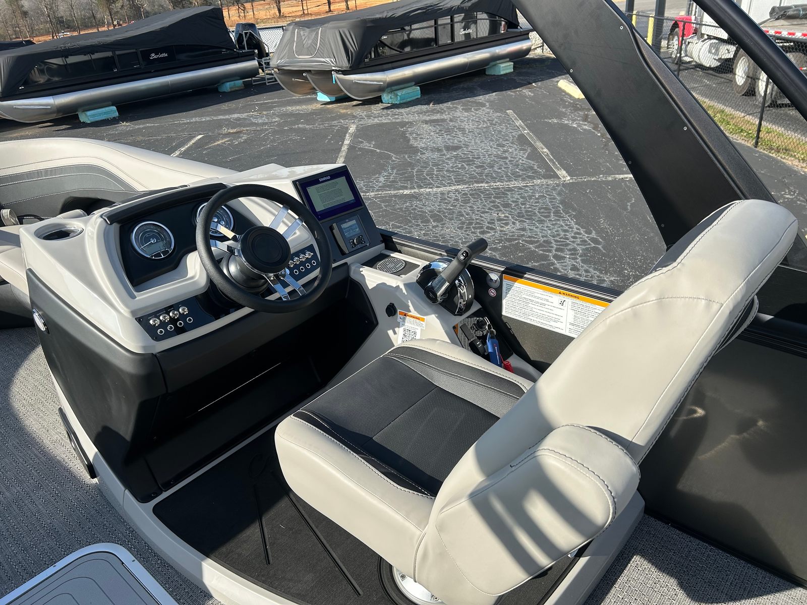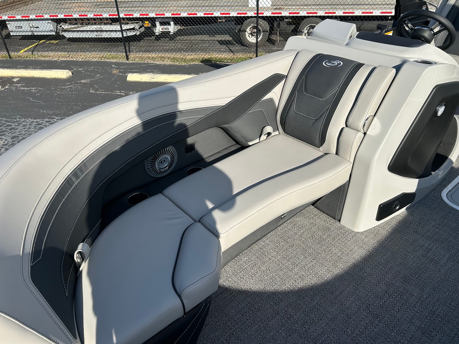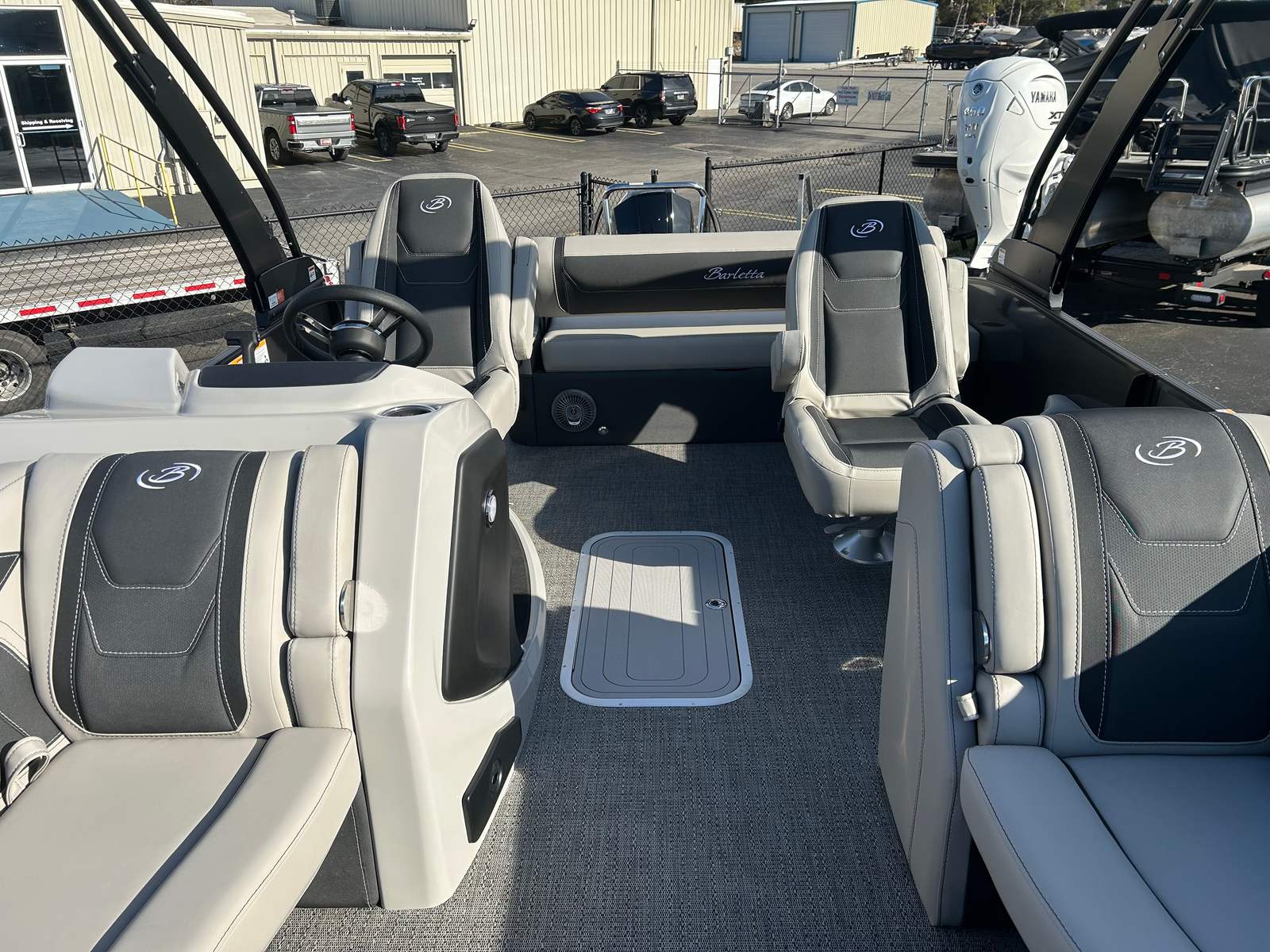 Step aboard the Barletta Cabrio C22UC and discover a world of comfort and style. The Railskin Color in Black Diamond, accented by Gray Moonstone, creates a striking visual appeal, while the Blackout Package Cabrio adds a touch of modern sophistication. The interior is adorned with Marquesan Gray furniture featuring Onyx accents, providing plush seating and a refined ambiance. The Amore Gray flooring is both elegant and durable, designed to withstand the rigors of active days on the water.The Triple Toon Package with midship storage not only boosts performance but also offers practical storage solutions for your gear and water toys. The Sport Bimini, installed in place of the standard bimini, provides generous shade and protection from the sun, ensuring comfort during long days on the water. Every detail of the Cabrio C22UC is thoughtfully designed to enhance your boating experience, from the premium materials to the innovative layout.