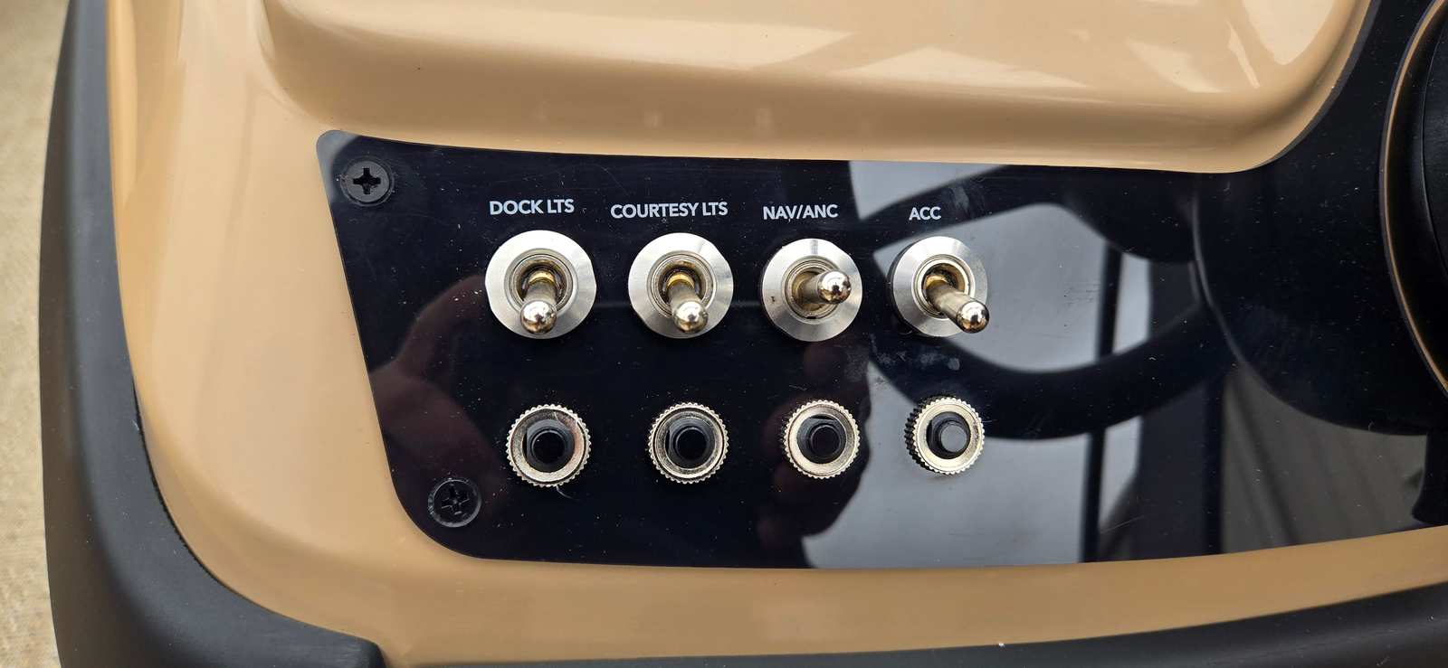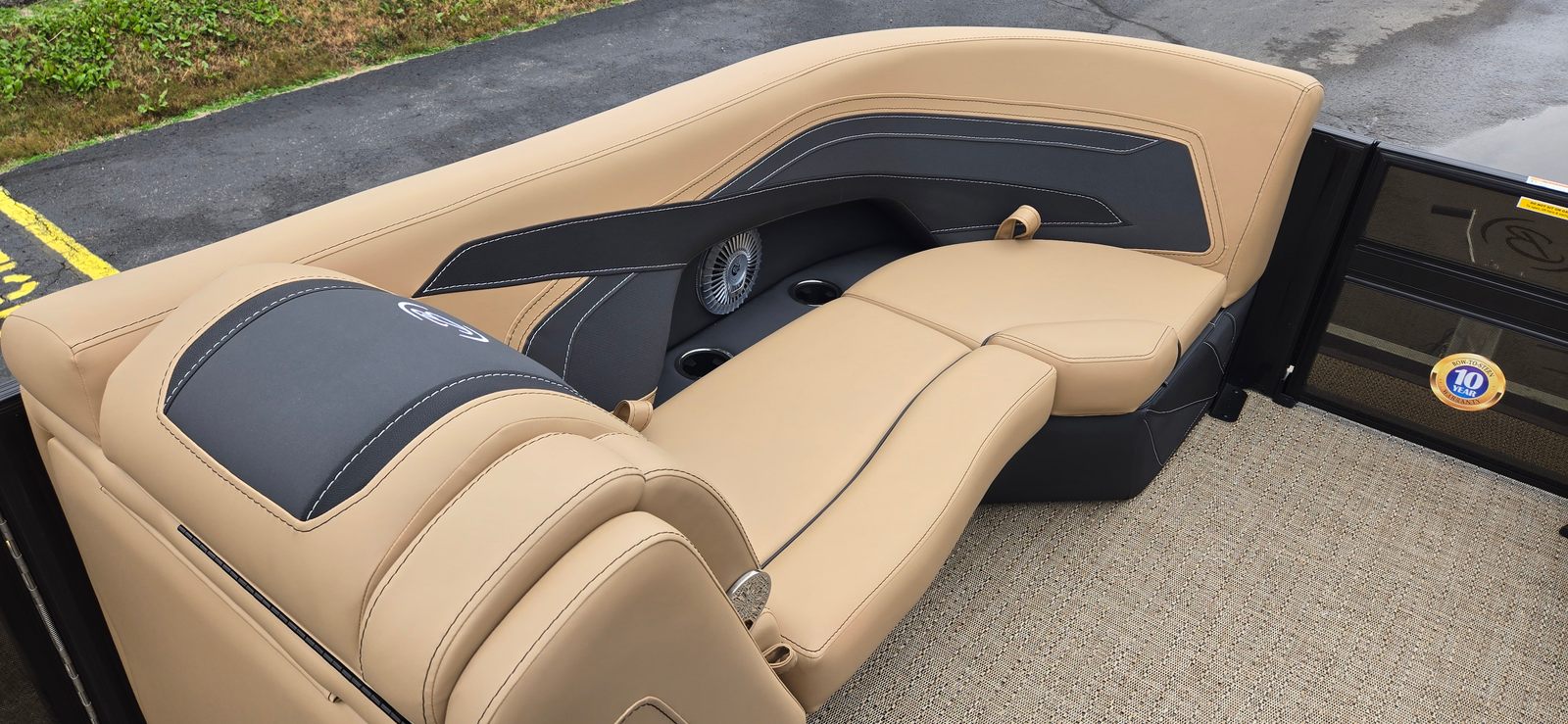 Step aboard and discover a world of thoughtful features and premium materials. The Railskin Color in Gray Moonstone, accented by Black Diamond, gives the exterior a sophisticated, modern appeal. The Blackout Package Cabrio adds a touch of elegance and exclusivity, ensuring your pontoon stands out wherever you go.Inside, the furniture is upholstered in Carmella Tan with Onyx accents, creating a warm and inviting atmosphere. The Amore Tan flooring is both stylish and practical, providing comfort underfoot and easy maintenance. The Triple Toon Package with midship storage on the Cabrio model offers enhanced stability and extra space for all your gear, making it easy to keep the deck clutter-free.For sun protection and relaxation, the Sport Bimini provides ample shade, allowing you to enjoy long days on the water in comfort. The on-board battery charger with two batteries ensures you have reliable power for all your electronic needs, so you can focus on fun without interruption.
