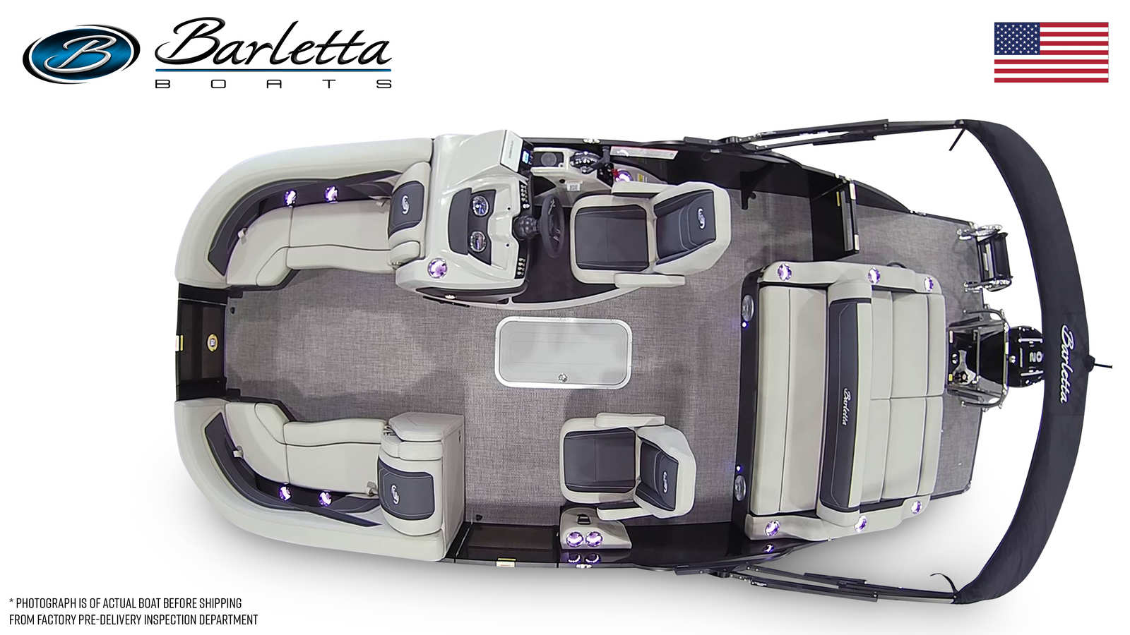 Step aboard the Barletta Cabrio C22UC and discover a world of comfort and convenience. The Marquesan Gray/Onyx furniture offers plush seating and a refined aesthetic, perfectly complemented by the Amore Gray flooring that’s both stylish and easy to maintain. The Triple Toon Package with midship storage provides enhanced stability, smoother rides, and generous space for stowing your essentials. The Blackout Package Cabrio adds a touch of elegance, while the stainless steel flag pole with an American flag showcases your pride and adds a unique finishing touch.