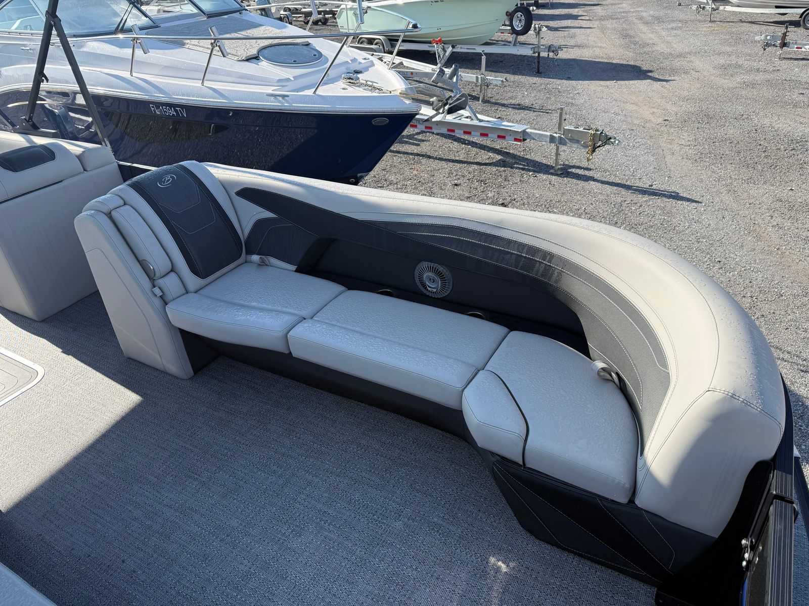 The Barletta Cabrio C24CC is packed with special features that elevate your boating experience. The Railskin Color in Bohemian Blue, complemented by the Blackout Package Cabrio, creates a striking visual impression that’s sure to turn heads at the marina. Inside, the Marquesan Gray furniture with Onyx accents offers both comfort and sophistication, while the Amore Gray flooring adds a touch of elegance and practicality.This model is part of the Coastal Edition Cabrio (CC Models), designed to withstand the unique challenges of coastal environments while maintaining style and functionality. The Triple Toon Package with midship storage provides enhanced stability, improved handling, and convenient storage options for your gear and essentials. The exterior is adorned with a stainless steel flag pole featuring an American flag, adding a patriotic touch to your vessel.