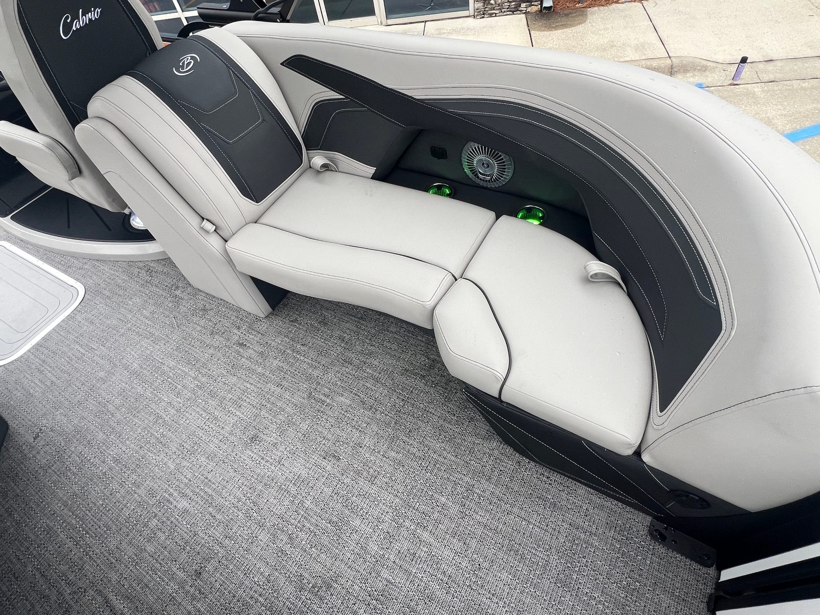 Step aboard the Barletta Cabrio C24Q and you will immediately notice its attention to detail and premium finishes. The Railskin Color in Blue Sapphire, accented by Winter White, creates a striking visual impression, while the Blackout Package Cabrio adds a touch of modern sophistication. The furniture is finished in Marquesan Gray with Onyx accents, providing both comfort and style for all passengers. The Amore Gray flooring is not only visually appealing but also designed for durability and easy maintenance.One of the standout features of this pontoon is the Triple Toon Package with Midship Storage, exclusive to the Cabrio line. This innovative design enhances stability, buoyancy, and storage capacity, making it ideal for longer outings and larger groups. The onboard battery charger with two batteries ensures you have reliable power for all your electronics and accessories, so you can focus on fun without worry.