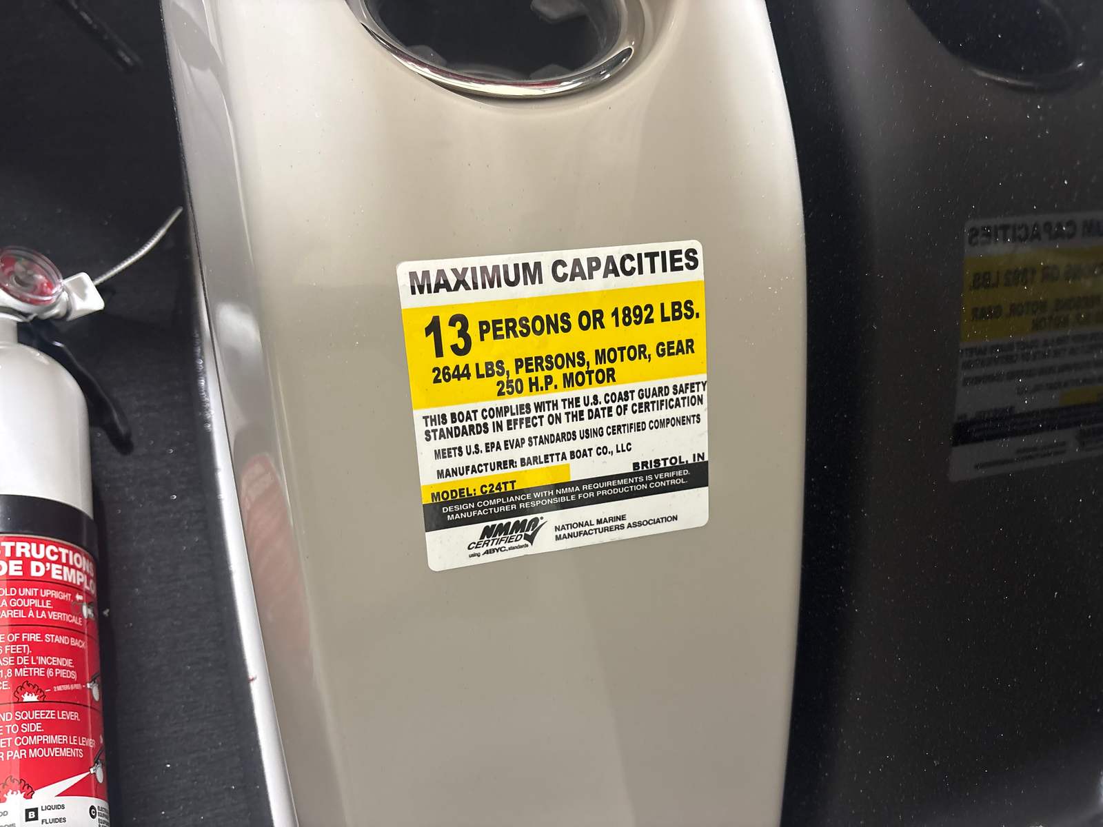 The Barletta Cabrio C24Q is equipped with a host of premium features designed to maximize comfort, convenience, and style. The striking Railskin Color in Black Diamond gives the pontoon a sleek, modern appearance, while the Marquesan Gray with Onyx furniture offers plush seating and a sophisticated aesthetic. The Amore Gray flooring is both durable and attractive, providing a comfortable surface that’s easy to maintain.One of the standout features is the Triple Toon Package with midship storage, which enhances stability and provides additional space for gear, water toys, or personal items. The interior RGB lighting package creates a customizable ambiance, perfect for evening cruises or festive gatherings. The Simrad 7" G07 XSR chartplotter/multifunction display delivers advanced navigation and system monitoring, ensuring you stay informed and in control throughout your journey.Additional touches like the stainless steel flag pole with an American flag add a sense of pride and distinction, while the rigging with a stainless steel prop ensures optimal performance and longevity.