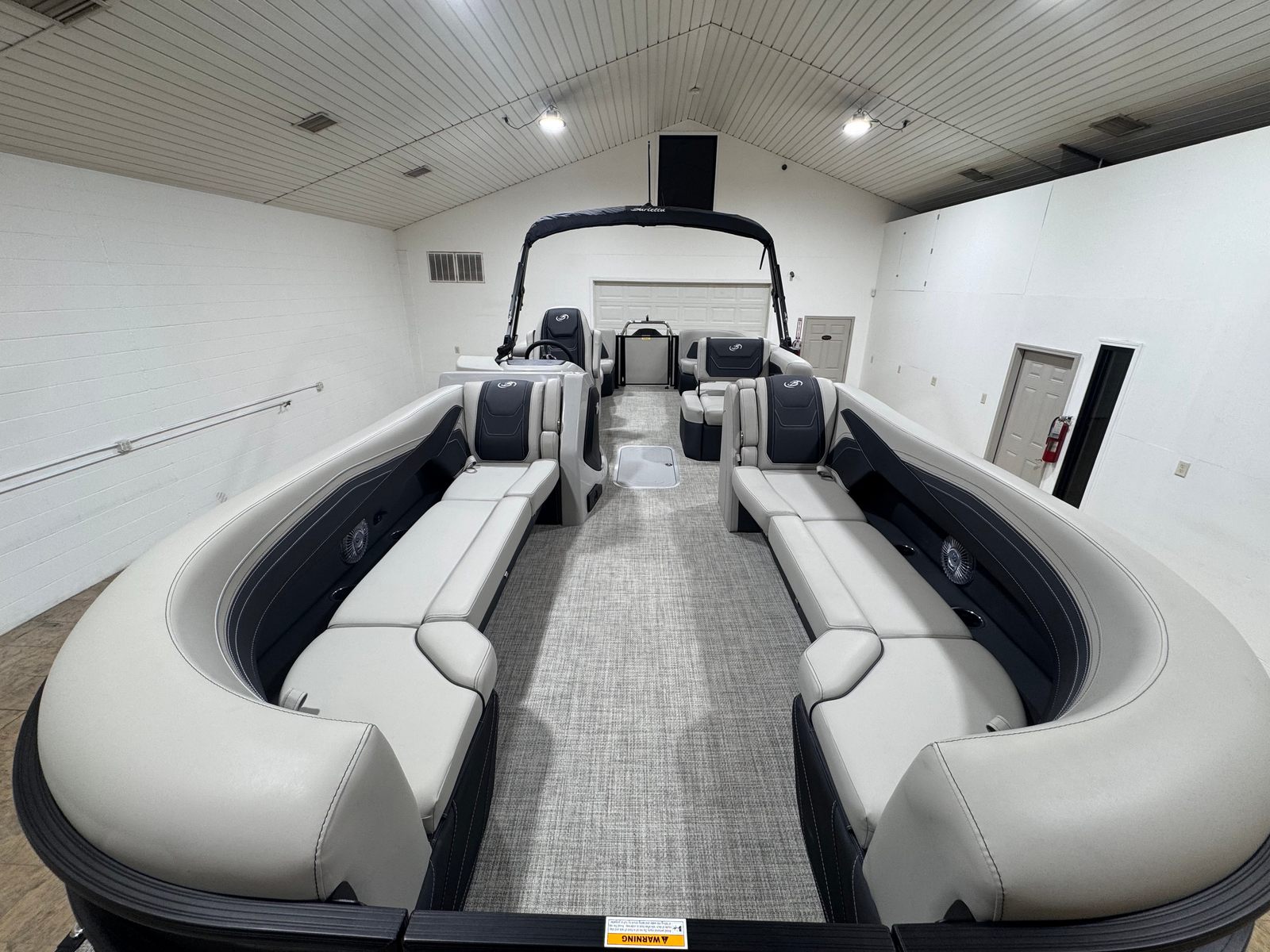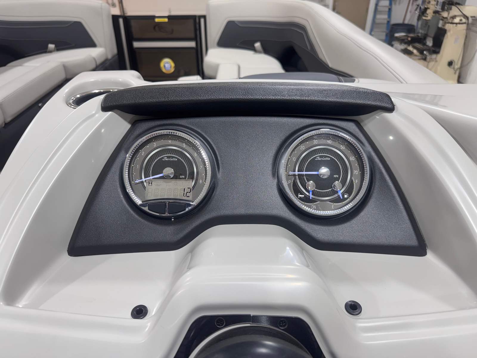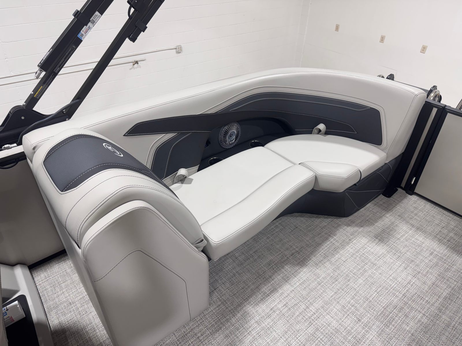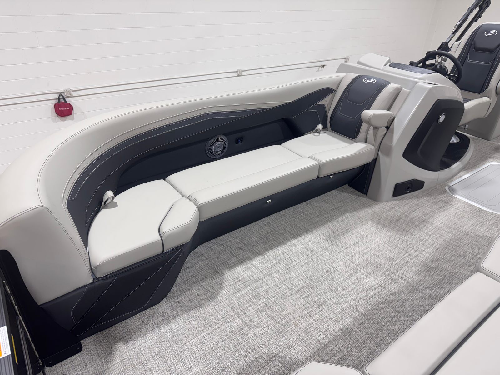 The Barletta Cabrio C24Q is loaded with special features that elevate your boating experience. The striking Gray Moonstone railskin color, accented by Champagne highlights and the Blackout Package Cabrio, gives this pontoon a modern and sophisticated look that is sure to turn heads at the marina. Inside, the Marquesan Gray furniture with Onyx accents creates a luxurious and inviting atmosphere, perfectly complemented by the Amore Gray flooring that is both stylish and easy to maintain.One of the standout features is the Triple Toon Package with midship storage, exclusive to the Cabrio series. This configuration enhances stability and handling, while the additional storage space ensures you have room for all your gear, water toys, and essentials. The clipped playpen cover with poles offers convenient protection from the elements, keeping your pontoon boat in pristine condition when not in use.