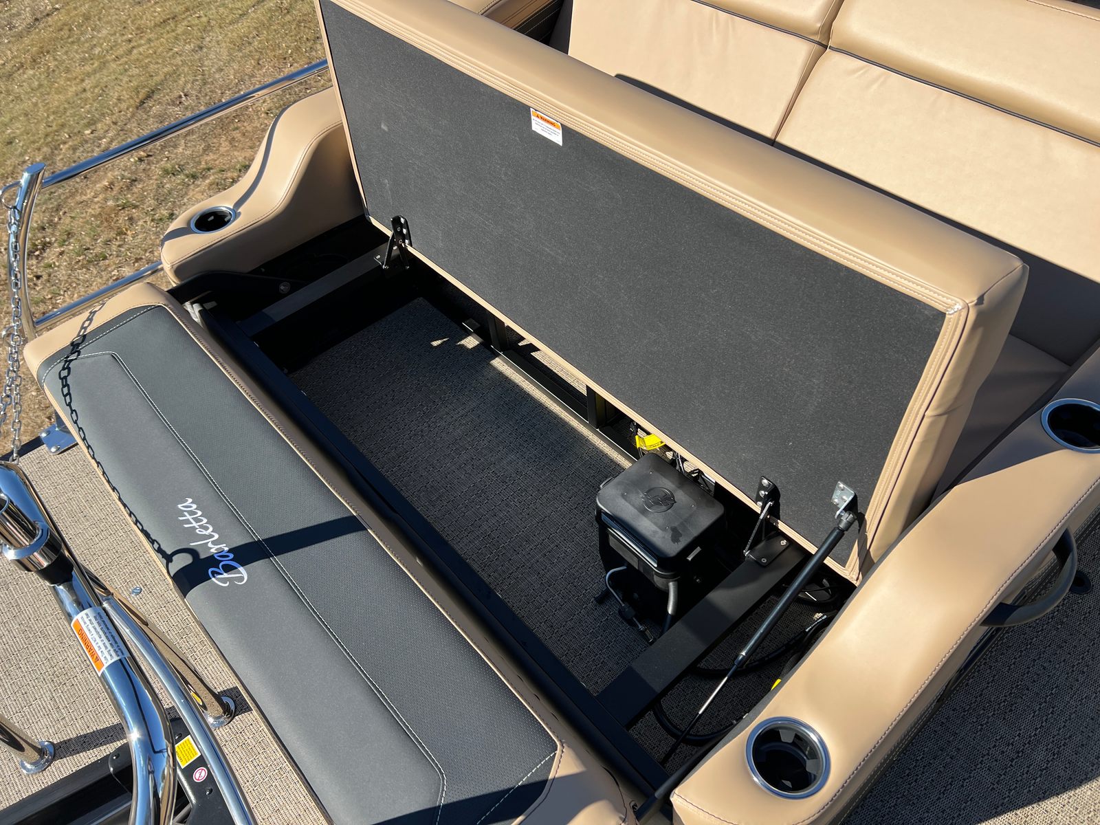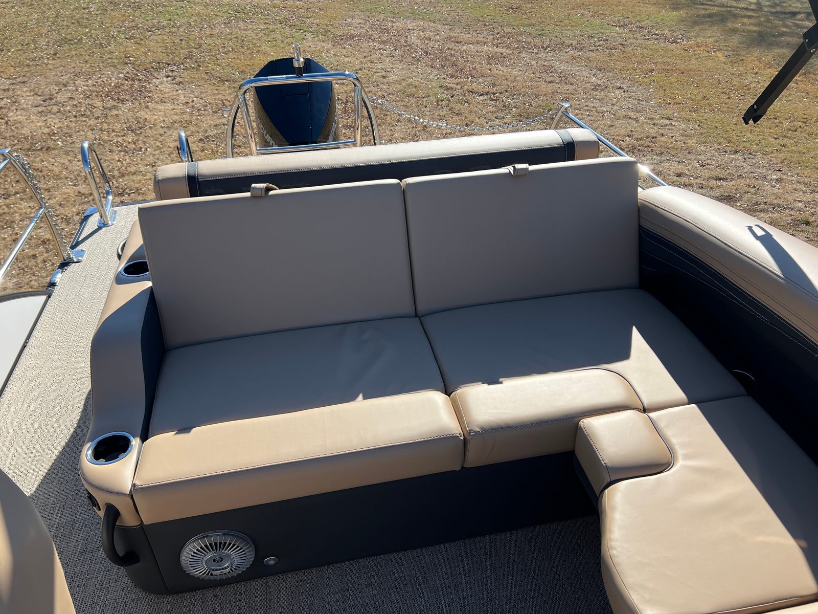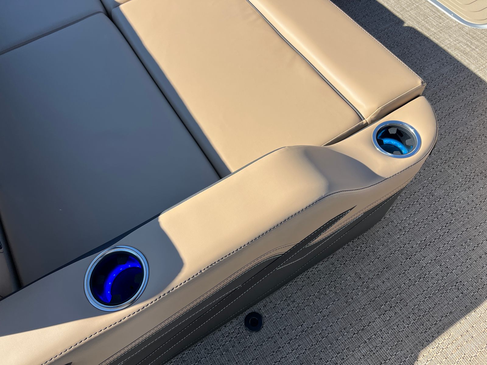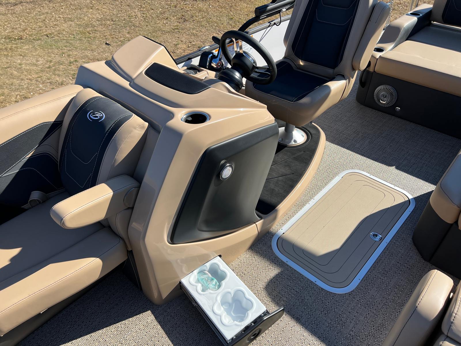 Step aboard the Barletta Cabrio C24U and you are greeted by a luxurious interior featuring Carmella Tan furniture with Onyx accents, creating an inviting and upscale atmosphere. The Amore Tan flooring not only adds to the visual appeal but also provides a comfortable and slip-resistant surface underfoot. The Blackout Package Cabrio, combined with the Black Diamond railskin and Winter White accent, gives this pontoon a distinctive and sophisticated look. The Triple Toon Package with midship storage offers ample space for stowing gear, water toys, and other essentials, keeping the deck uncluttered and organized. The boat is protected with Metal Jacket Protectant, ensuring its finish remains pristine and resistant to the elements.
