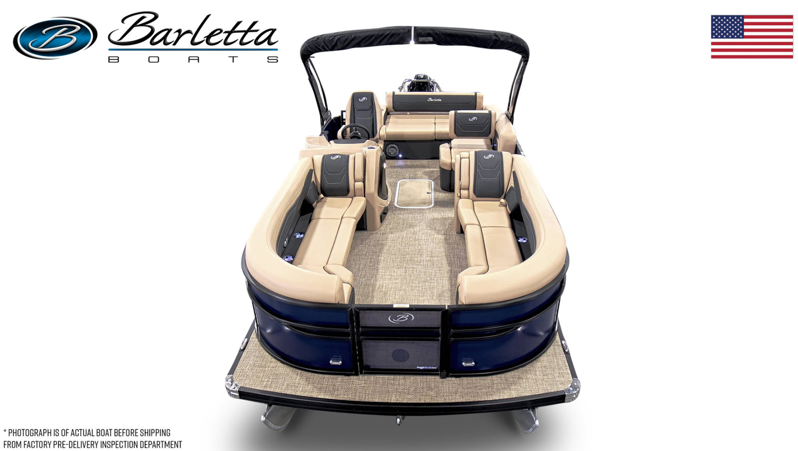 The 2026 Barletta Cabrio C24U is a standout pontoon boat for sale that combines performance, luxury, and practicality in one impressive package. With its powerful 250-horsepower engine, stylish Bohemian Blue railskin, premium Carmella Tan with Onyx furniture, and advanced features like the Simrad 7" G07 XSR chartplotter and sport bimini, this Barletta boat for sale is ready to transform your time on the water. The triple toon package with midship storage, Blackout Package Cabrio, and stainless steel flag pole with American flag further enhance its appeal.If you are looking for a new pontoon boat that offers comfort, style, and exceptional performance, the Barletta Cabrio C24U is the perfect choice. Don’t miss your chance to experience the ultimate in boating enjoyment—contact your local dealer today to learn more about this incredible pontoon and start planning your next adventure.