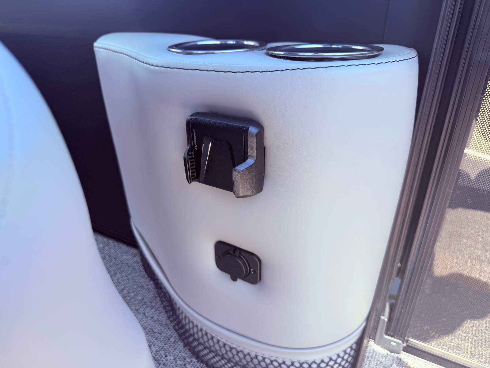 The Barletta Cabrio C24UC is packed with special features designed to enhance your boating experience. Its 25-inch transom construction provides added stability and durability, ensuring a safe and comfortable ride in various conditions. The onboard charger keeps your electronics powered throughout the day, while the Amore Gray flooring offers both style and easy maintenance. Entertain guests with the convenient table, pedestal, and base, complete with Yeti-ready cupholders for your favorite beverages. The adjustable pedestal on both the captain’s and co-captain’s chairs allows for personalized comfort at the helm.Inside, the Marquesan Gray/Onyx furniture creates a sophisticated atmosphere, complemented by the Interior RGB Lighting Package Cabrio, which lets you set the mood for any occasion. The Coastal Edition Cabrio adds a layer of versatility, making this pontoon suitable for a variety of aquatic environments. For those who appreciate premium sound, the added subwoofer and amplifier deliver rich, immersive audio, perfect for parties or relaxing afternoons on the water.
