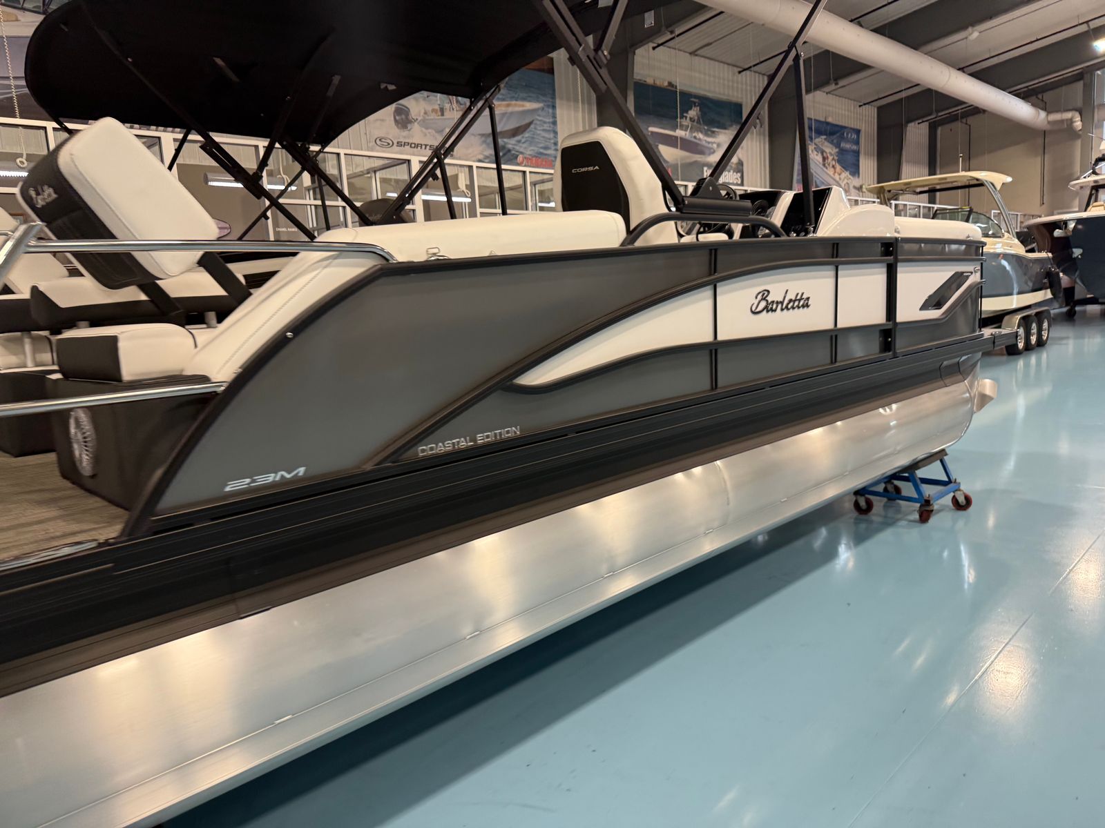 The 2026 Barletta Corsa 23M is a 25-foot pontoon that exudes contemporary style and premium craftsmanship. With its sleek lines, bold color accents, and innovative features, this new pontoon is designed to impress at every turn. The Gray Moonstone railskin, accented by Winter White and complemented by the Blackout Package Corsa, gives the boat a striking presence on the water. The Coastal Edition Corsa further enhances its appeal, making it a true head-turner at any marina or lakeside gathering.