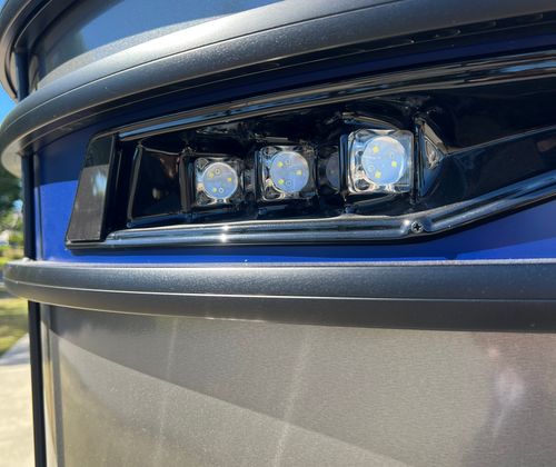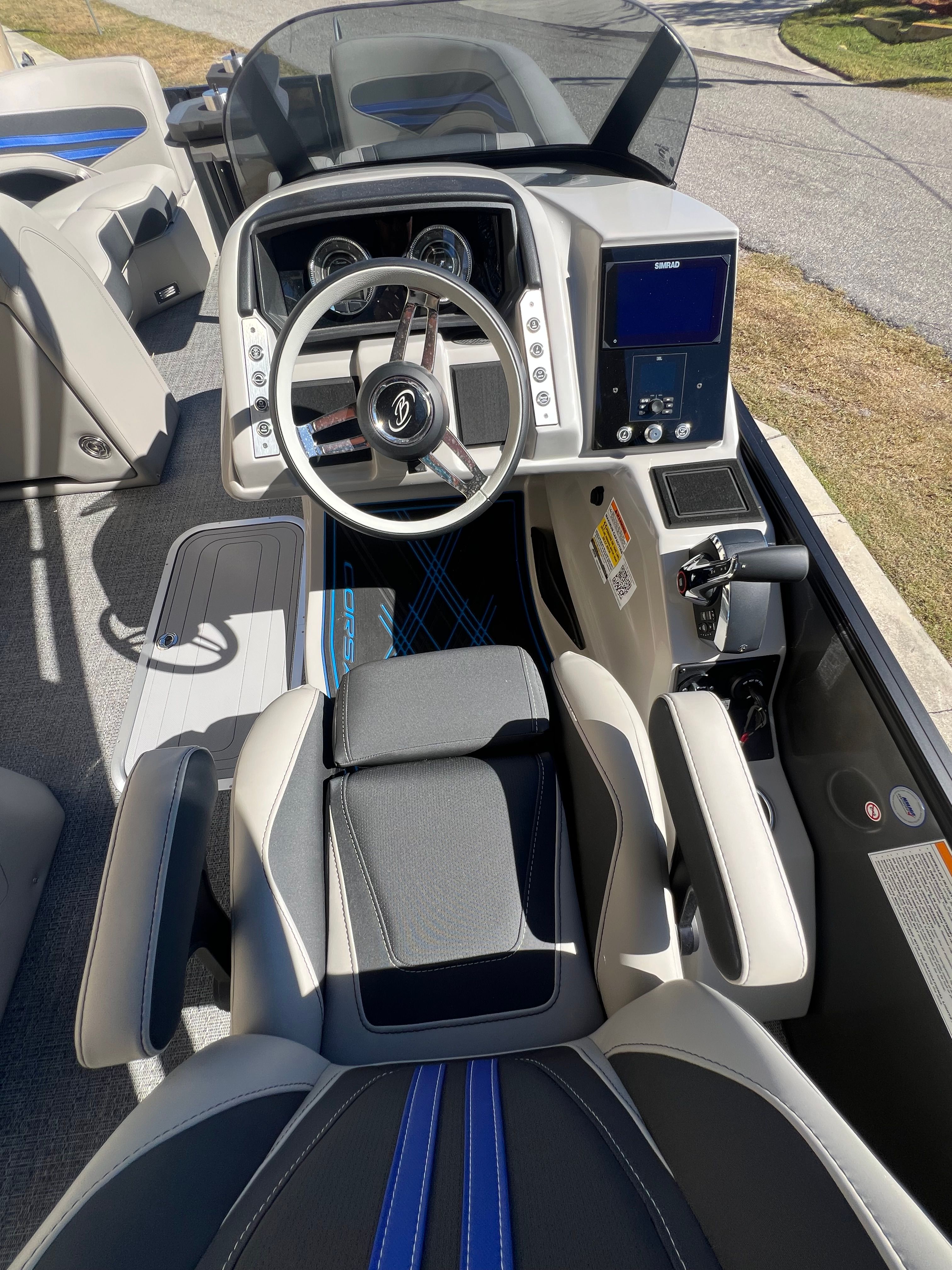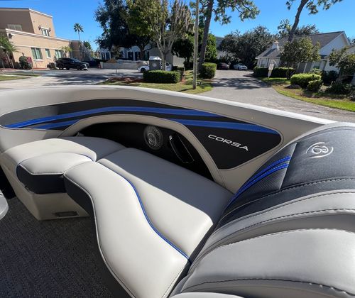 The Barletta Corsa 23MA is packed with special features that set it apart from other pontoon boats for sale. The exterior lighting includes white underdeck and underwater illumination, creating a striking visual effect during evening cruises and enhancing safety around the boat. The stainless steel flag pole with an American flag adds a touch of patriotic flair and sophistication to the vessel’s profile.Entertainment is at the forefront with the Arch Sound Bar, ensuring high-quality audio for your favorite music and enhancing the atmosphere for social gatherings. The flooring is finished in Amore Gray, providing both durability and a modern aesthetic that complements the boat’s overall design. The Blackout Package Corsa railskin package gives the exterior a sleek, contemporary look, while the Coastal Edition Corsa adds unique styling elements that make this pontoon truly distinctive.Inside, comfort is paramount. The adjustable pedestal on the captain’s chair at the helm allows for personalized seating, ensuring the captain enjoys optimal visibility and control. The furniture features Soft Touch Marquesan Gray with Blue Accent, offering plush seating and a stylish color scheme that invites relaxation. Every detail has been thoughtfully designed to maximize comfort and enjoyment for all passengers.