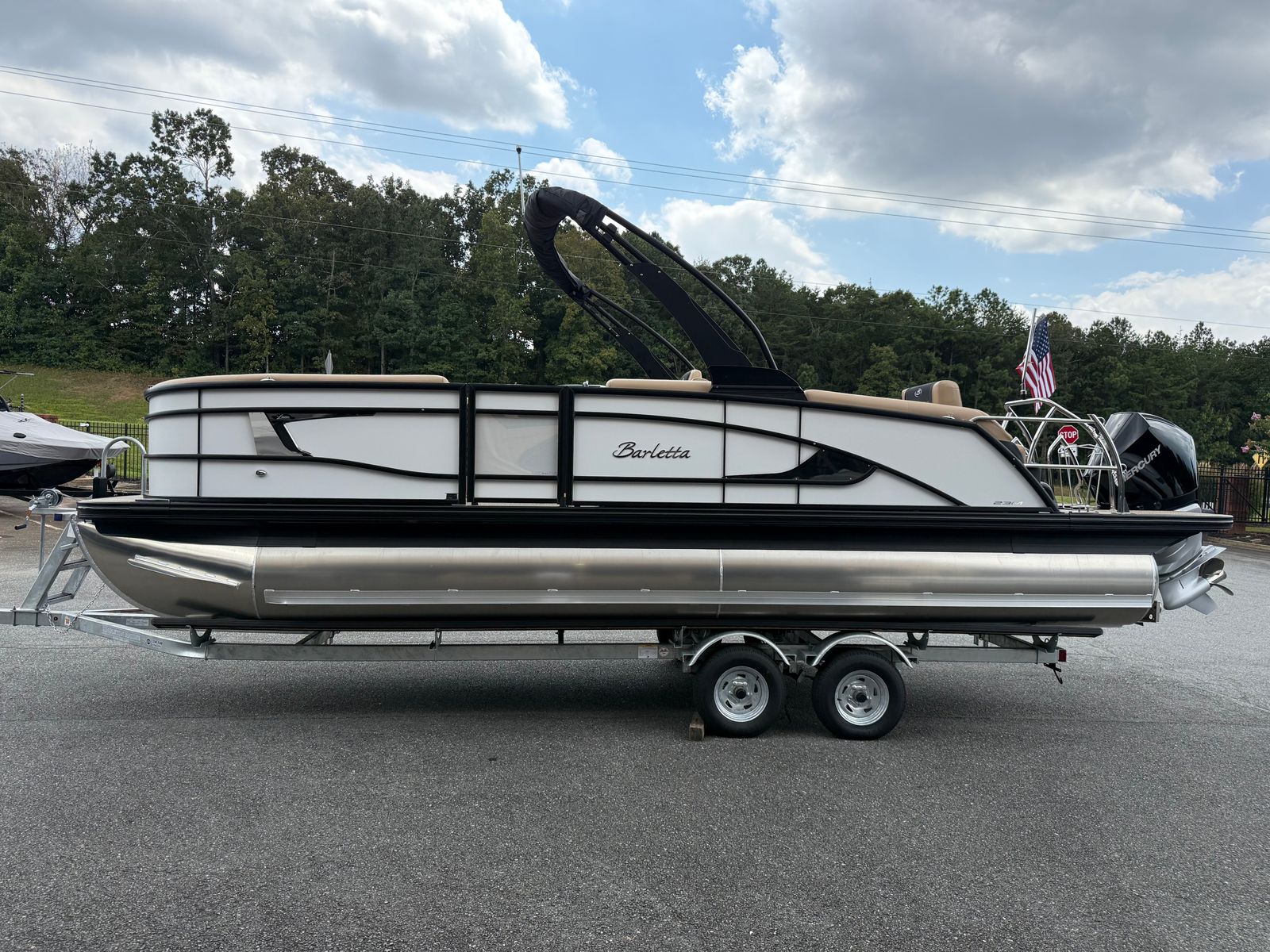The 2026 Barletta Lusso L23M is loaded with premium features that set it apart from other pontoon boats for sale. The exterior boasts a striking Sweep Color in Winter White, complemented by the Blackout Package Lusso railskin, creating a bold and sophisticated look. The flooring is finished in Amore Tan, providing both durability and a touch of elegance underfoot. The furniture, upholstered in Carmella Tan with Onyx accents, offers plush comfort and a refined aesthetic, ensuring that every seat is the best in the house.For those who appreciate shade and protection from the elements, the Lusso L23M comes equipped with a Sport Bimini (installed in place of the standard Bimini), allowing you to enjoy the sun or seek shelter as needed. Digital gauges provide clear and accurate information at a glance, while the rigging includes a stainless steel prop for optimal performance and longevity. Every detail, from the accent color in Winter White to the thoughtfully designed seating arrangements, reflects Barletta’s commitment to quality and innovation.
