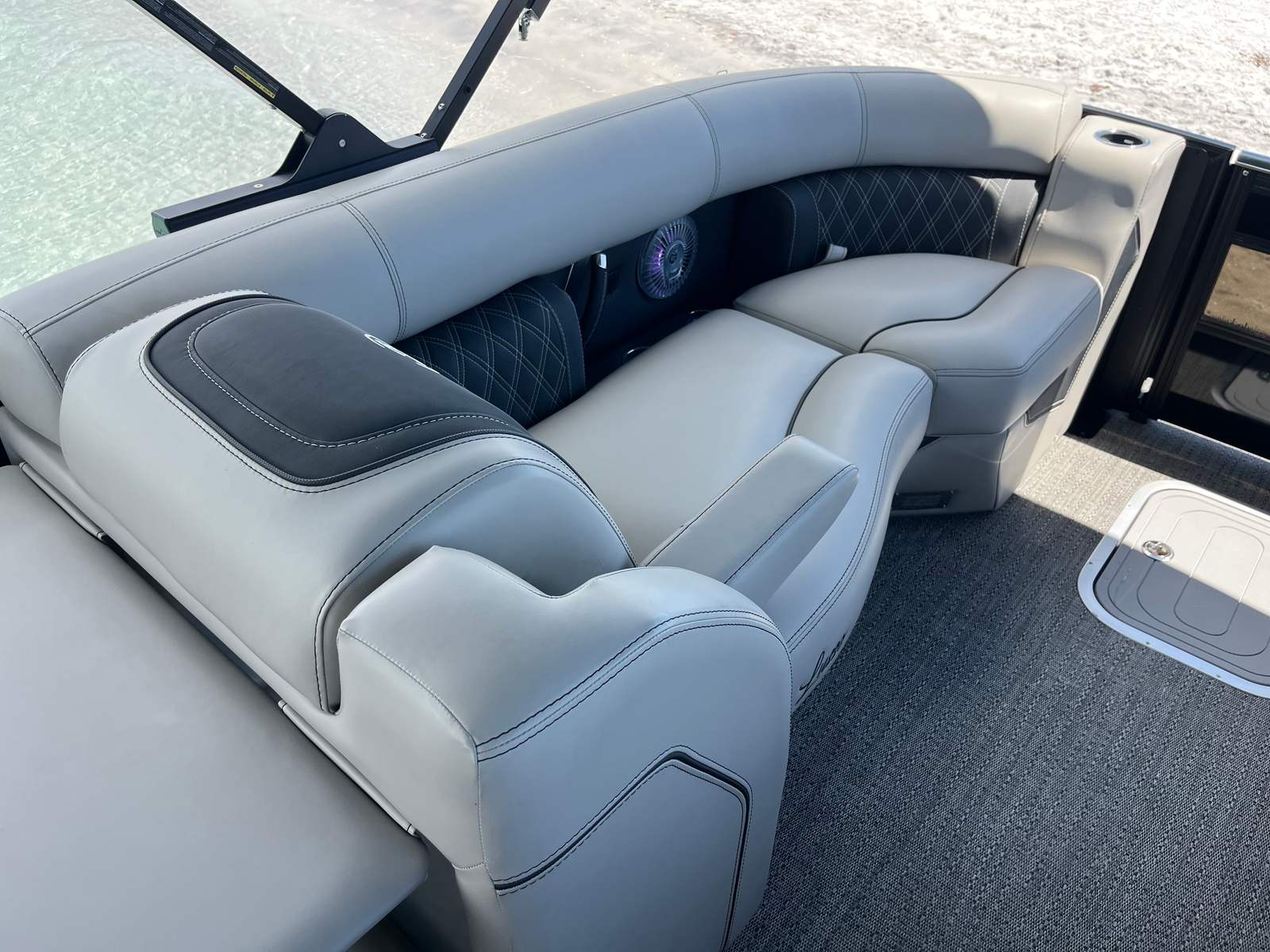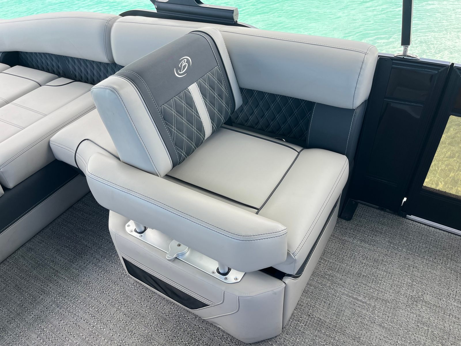 This Barletta boat for sale is packed with premium features designed to enhance comfort, convenience, and style. The Blackout Package Lusso adds a bold, modern touch to the railskin, while the Coastal Edition Lusso ensures durability and resilience in a variety of environments. The double bimini, including an additional power bimini, offers versatile shade options, allowing you to customize your comfort level throughout the day. The Marquesan Gray with Onyx furniture provides plush seating and a refined look, while the Amore Gray flooring is both stylish and easy to maintain. Every detail of the Lusso L23U is crafted to deliver a first-class boating experience.