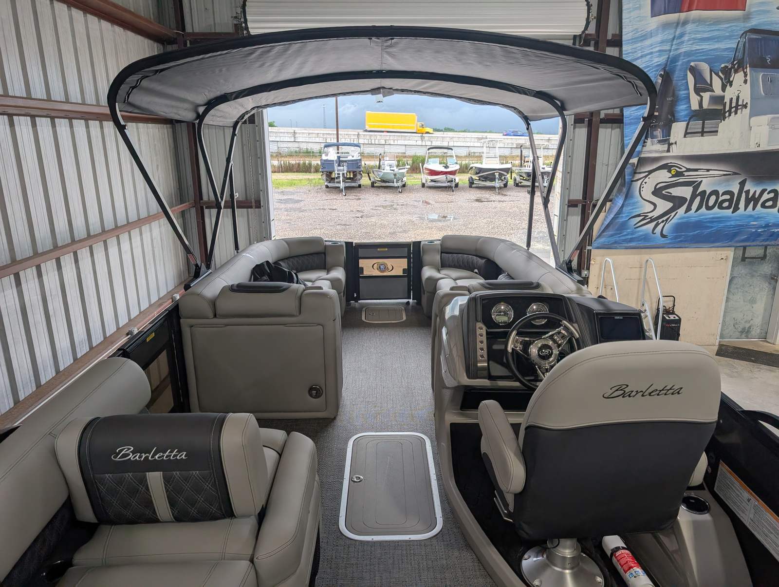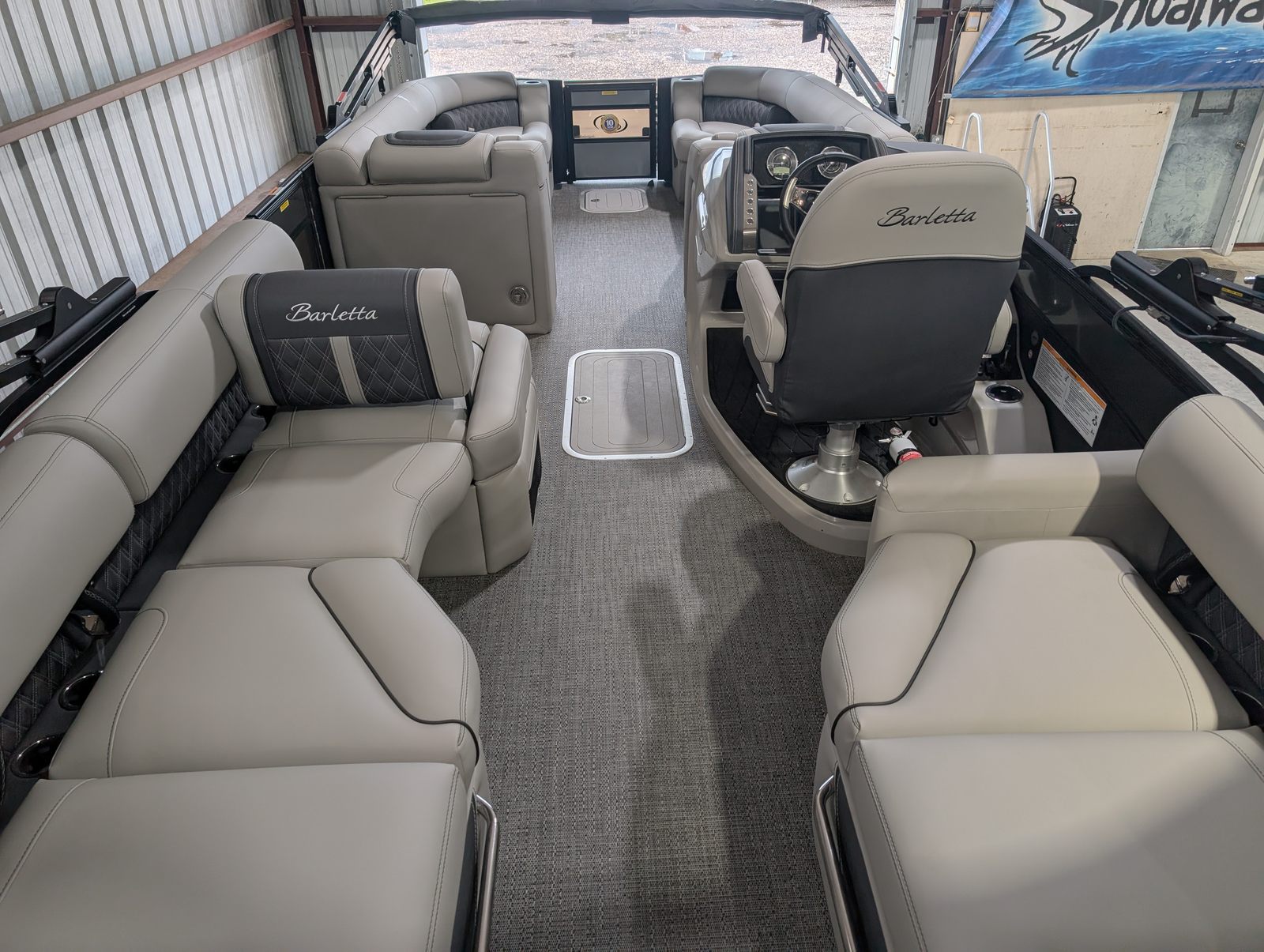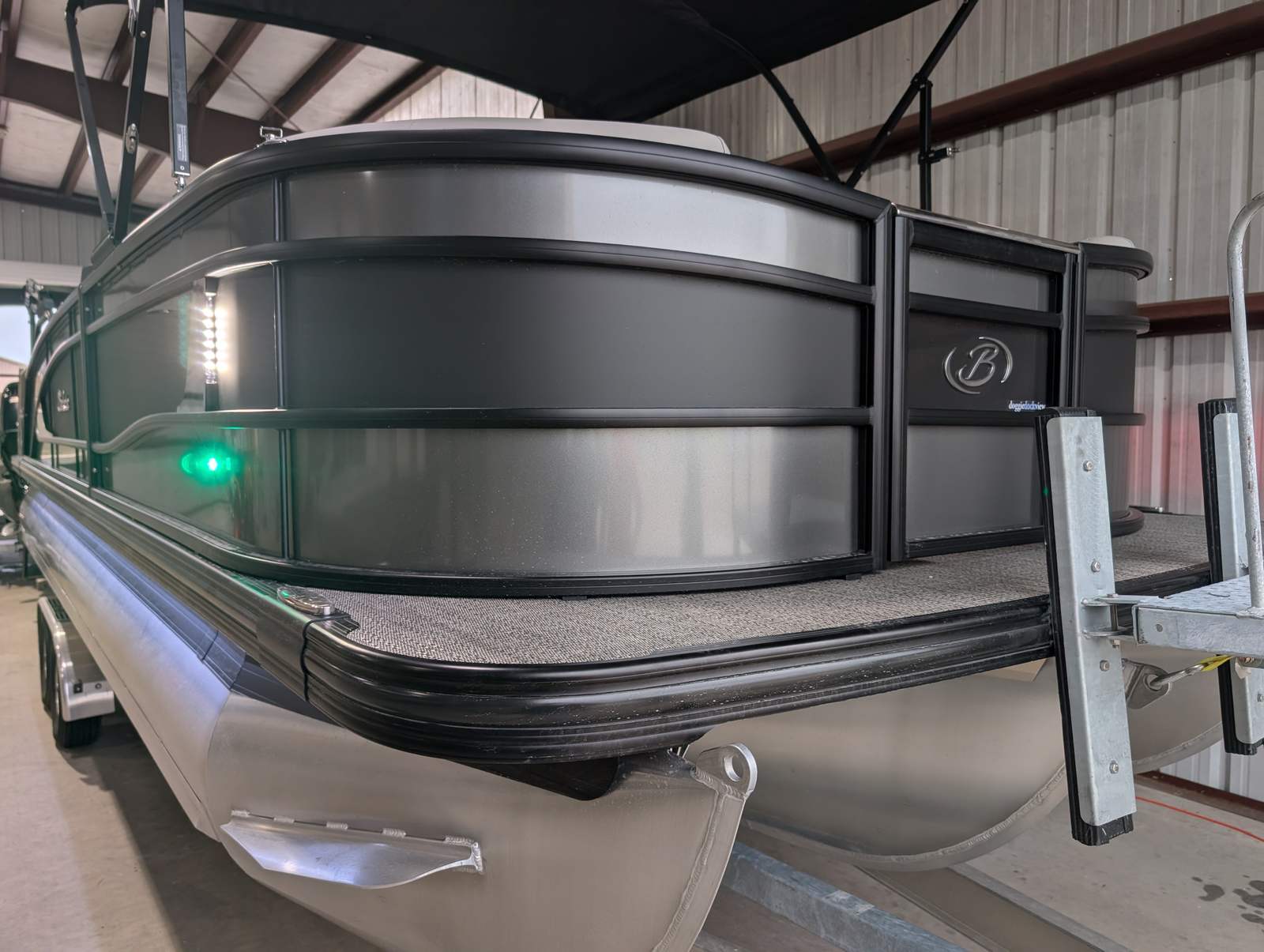 The Barletta Lusso L25M is packed with premium features that set it apart from other pontoon boats for sale. Step aboard and you’ll immediately notice the Amore Gray flooring, which provides a sophisticated foundation for the entire vessel. The interior is equally impressive, featuring Marquesan Gray furniture with Charcoal accents and a Matte Black accent color for a modern, upscale look.The captain’s chair at the helm is equipped with an adjustable pedestal, ensuring optimal comfort and visibility for the driver. Entertaining guests is a breeze thanks to the interior table, pedestal, and base, complete with Yeti-ready cupholders for your favorite beverages. Exterior lighting, including white underdeck and underwater lights, adds a dramatic flair for evening cruises and enhances safety after sunset.The Lusso L25M’s sweep color in Gray Moonstone complements its overall aesthetic, while the rigging and pre-rigging for the Mercury V10 engine ensure seamless integration and reliable performance. Every detail has been thoughtfully designed to maximize comfort, convenience, and enjoyment on the water.