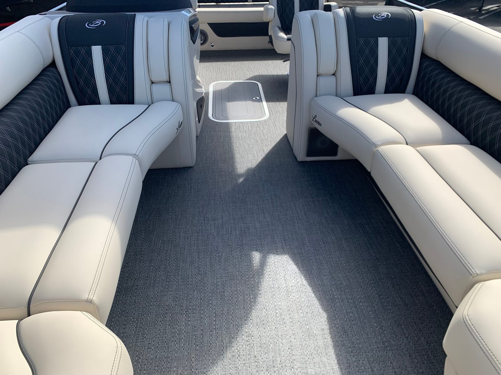 The 2026 Barletta Lusso L25UC is packed with premium features that set it apart from other pontoon boats for sale. The flooring is finished in elegant Amore Gray, providing both durability and a contemporary look. The furniture is upholstered in luxurious Linen with Onyx accents, offering plush seating and a sophisticated atmosphere. The Blackout Package Lusso railskin adds a bold, modern edge, while the accent color in Black Diamond and sweep color in Champagne create a striking visual appeal.For those who love to spend long days on the water, the Sport Bimini (installed in place of the standard Bimini) offers superior sun protection and style. The exterior lighting package includes white underdeck and underwater lights, enhancing the boat’s ambiance and visibility during evening cruises. Every detail, from the rigging to the color choices, is thoughtfully designed to elevate your boating experience.