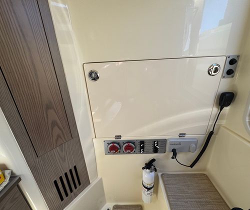 Protected behind the enclosed glass windshield of the pilothouse, dual helm seats put controls at your fingertips with large display screens, customizable LED lighting and joystick control. At the push of a button, the hardtop’s motorized extendable sun shade provides additional coverage.