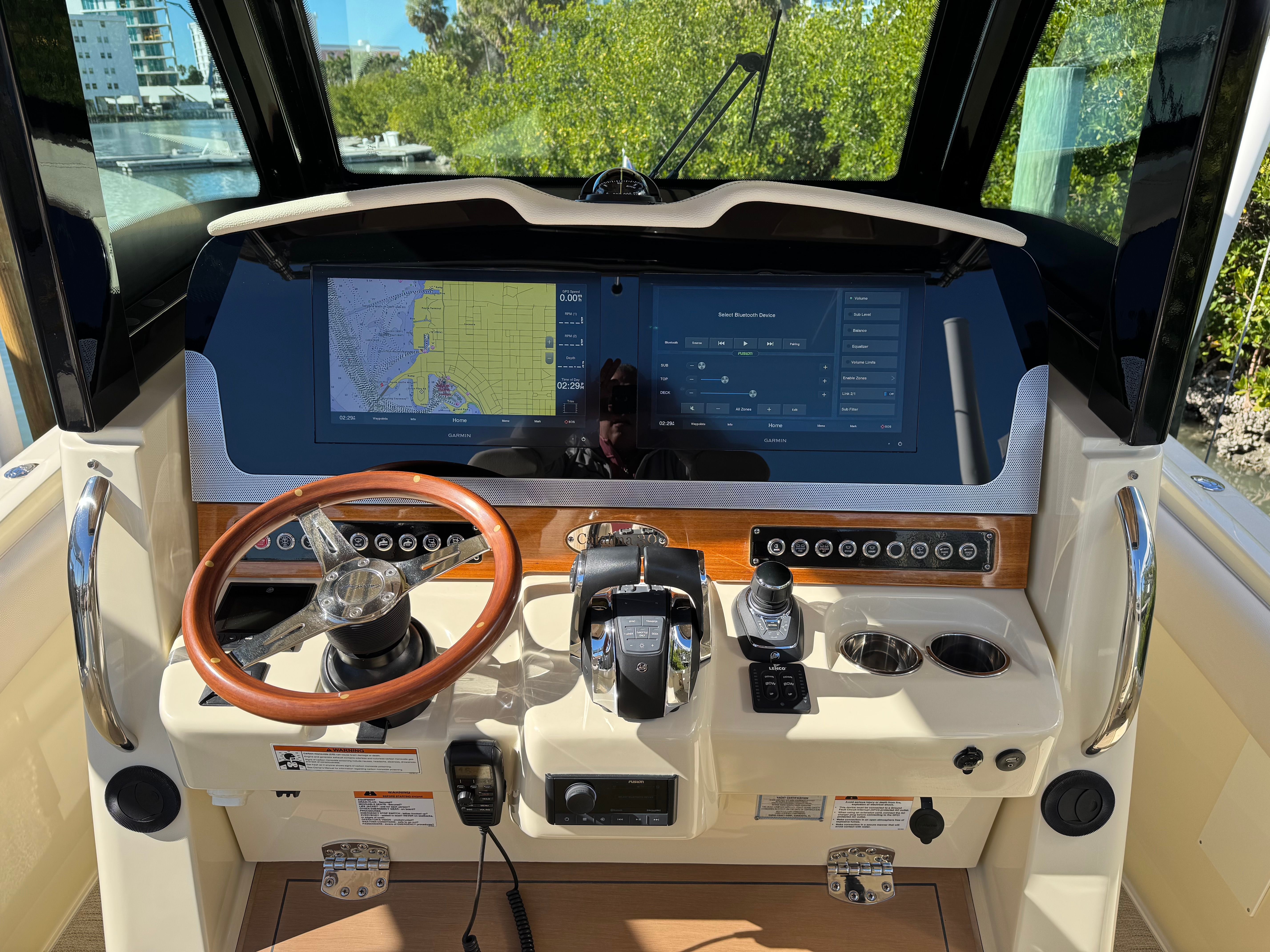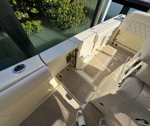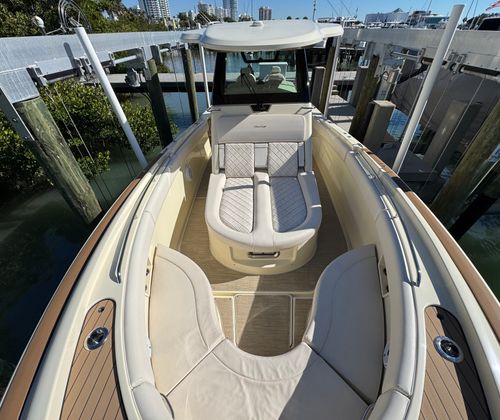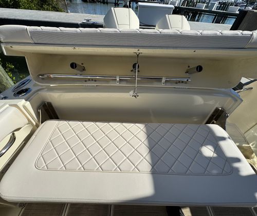 The expansive open bow offers dual forward-facing chaise loungers, as well as lavish wraparound bow seating. Convenience abounds with sealed, fully finished storage lockers in-floor and under the seats, plus well-placed cupholders for entertaining ease.
