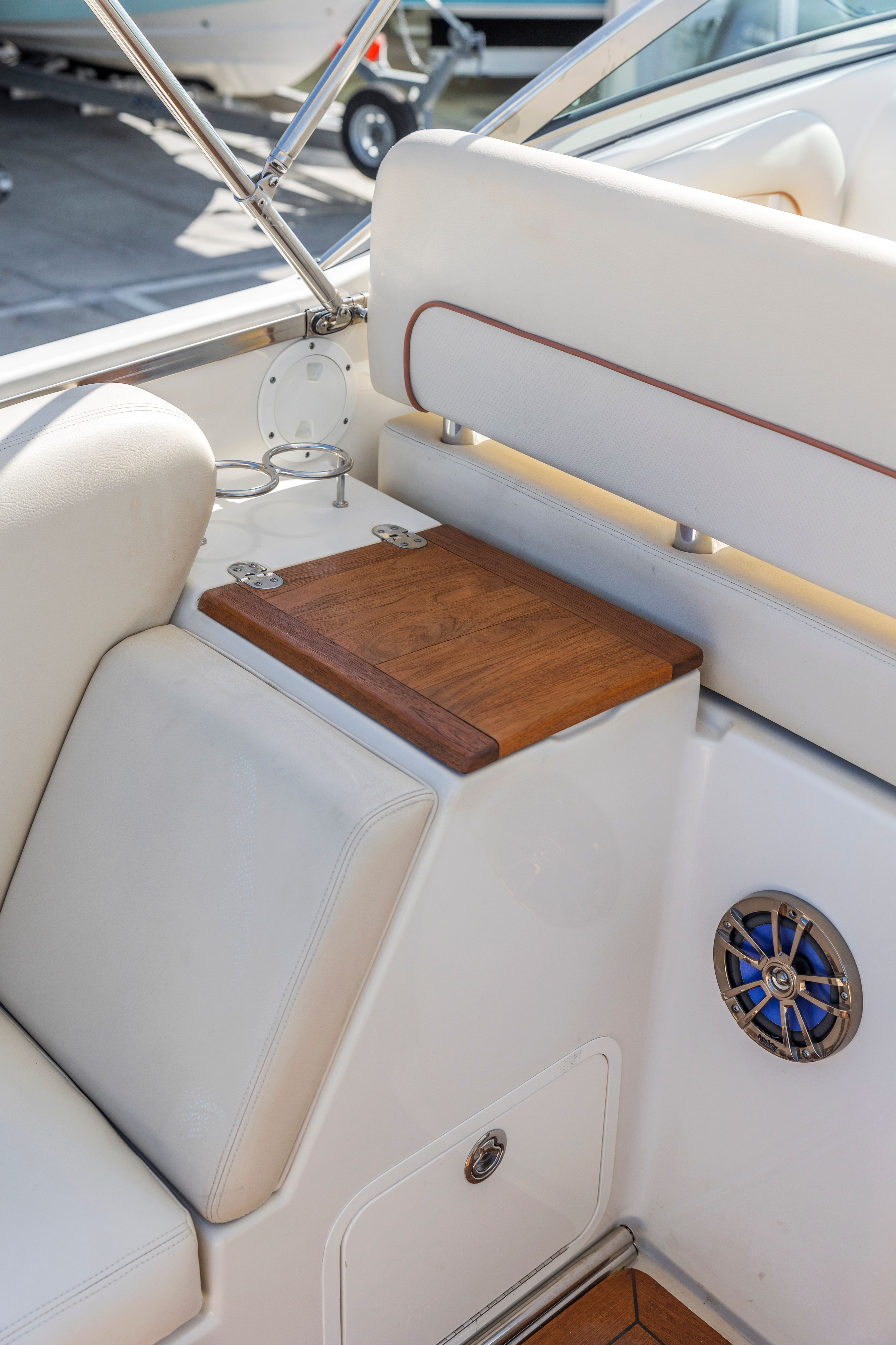 Power and performance are at the heart of the Chris-Craft Corsair 28. Equipped with twin engines delivering a combined 600 horsepower, this bowrider is built for speed, agility, and smooth handling. The dual-engine setup ensures responsive acceleration and reliable power, whether you are cruising along the coastline, pulling water toys, or making a quick dash to your favorite waterfront destination. With only 268 hours on the engines, you can be confident in the longevity and dependability of this vessel. The Corsair 28’s hull design provides a stable and comfortable ride, even in choppier waters, allowing you to enjoy every outing to the fullest.