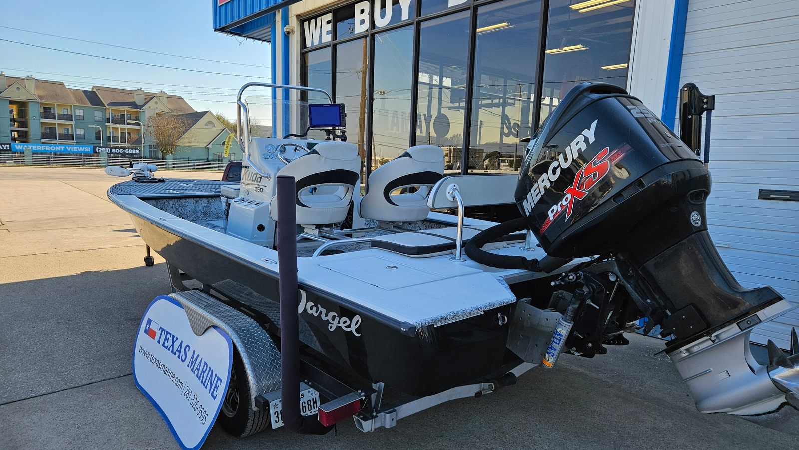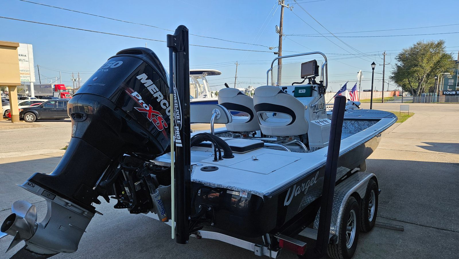 This Dargel boat for sale comes loaded with special features that set it apart from the competition. The included tandem axle trailer makes transporting your Bay Boat simple and secure, whether you are heading to your favorite local launch or exploring new destinations. The Power Pole provides quick and quiet anchoring, allowing you to hold your position in shallow water with minimal effort—perfect for targeting elusive fish or enjoying a peaceful sunset.The Lowrance Electronics Package equips you with advanced navigation and fish-finding technology, ensuring you stay on course and maximize your time on the water. The Mercury Optimax 250 engine is paired with the Atlas Jackplate, giving you precise control over your ride and the ability to adapt to changing water depths. Every detail of the 250 Kuda is designed to enhance your boating experience, from the spacious deck layout to the intuitive controls.