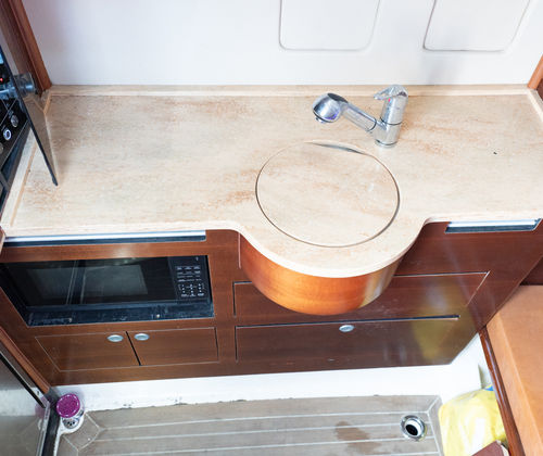 Large console cabin includes berth with A/C, marine head, and fresh water sink