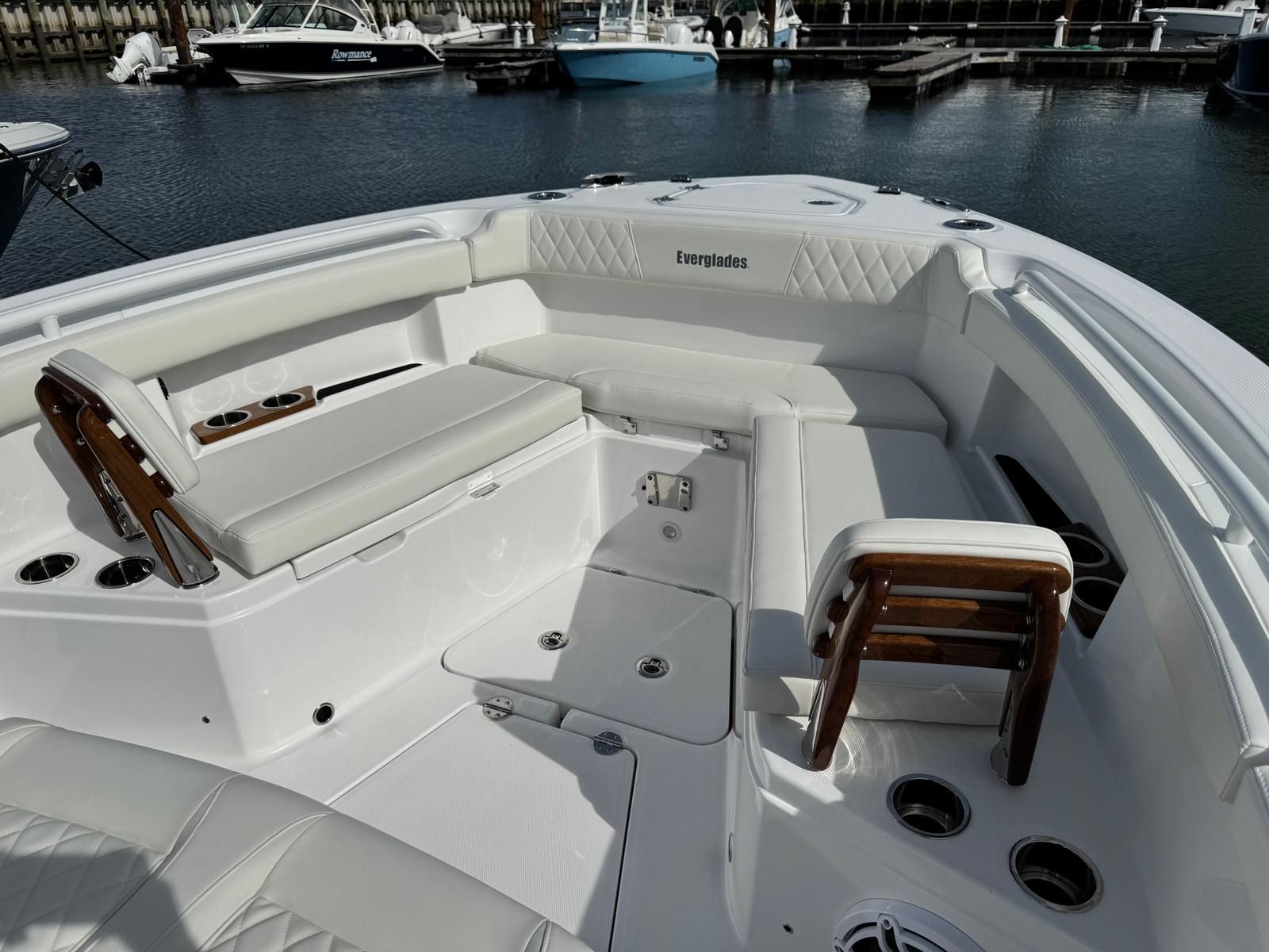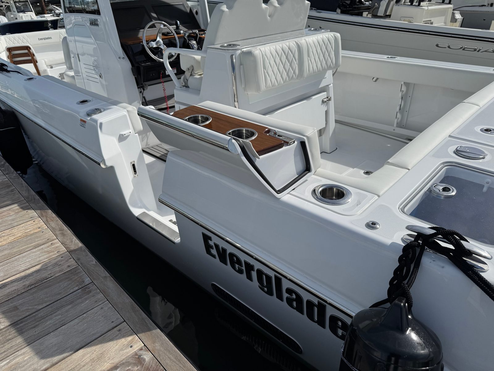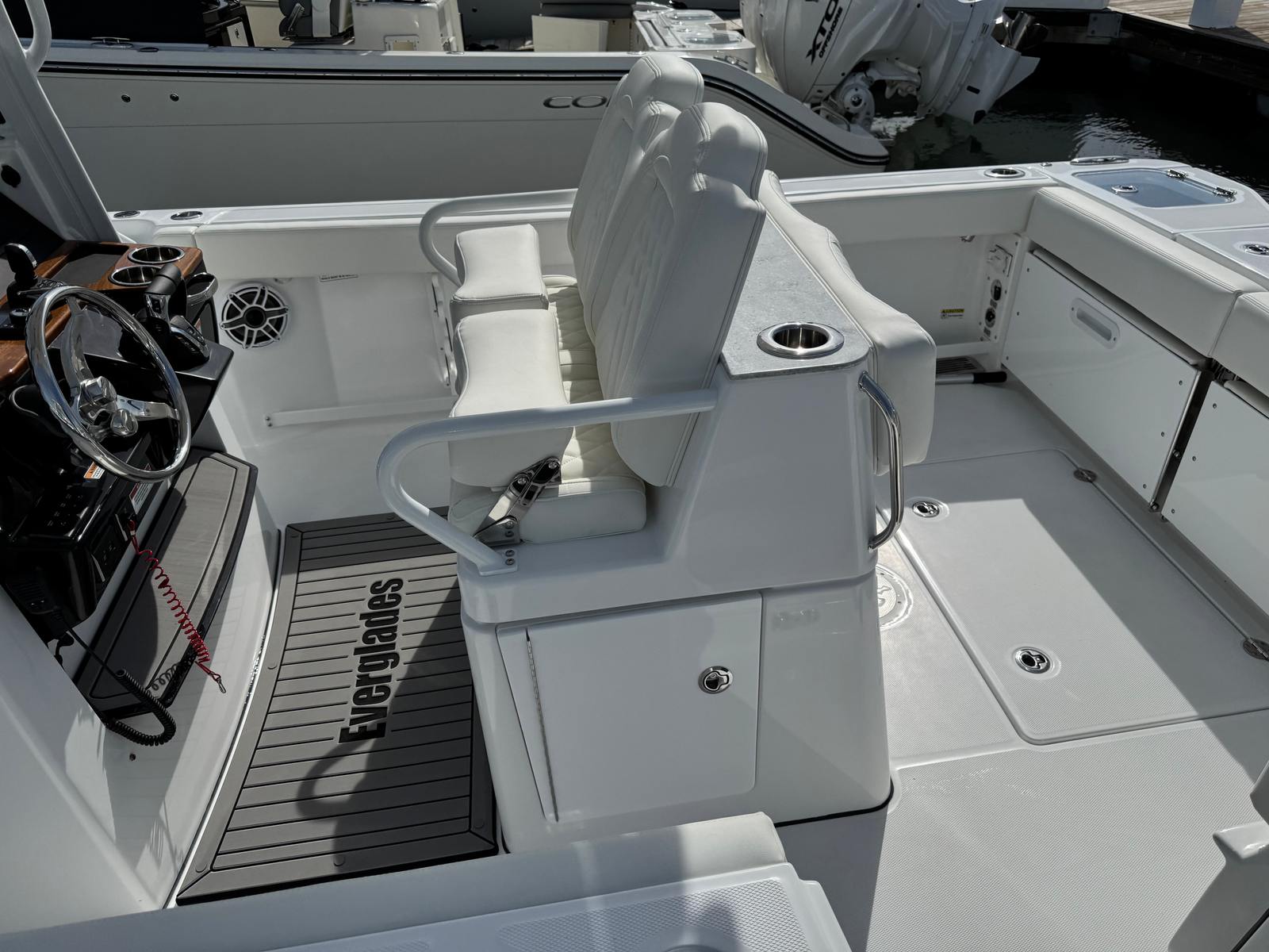 The Everglades 285 CC is designed with practicality in mind, making ownership both enjoyable and hassle-free. The engine flushing system simplifies maintenance, helping to protect your investment and reduce downtime. The ladder for the side access reboarding door, with its dedicated storage, makes it easy for swimmers and divers to get back on board safely. The ample storage options, including the helm seat storage unit, keep your gear organized and within reach.Docking and maneuvering are made simple with the Yamaha joystick and autopilot systems, allowing even novice boaters to handle the 285 CC with confidence. The efficient twin engines provide a balance of power and fuel economy, so you can spend more time on the water and less time at the fuel dock.